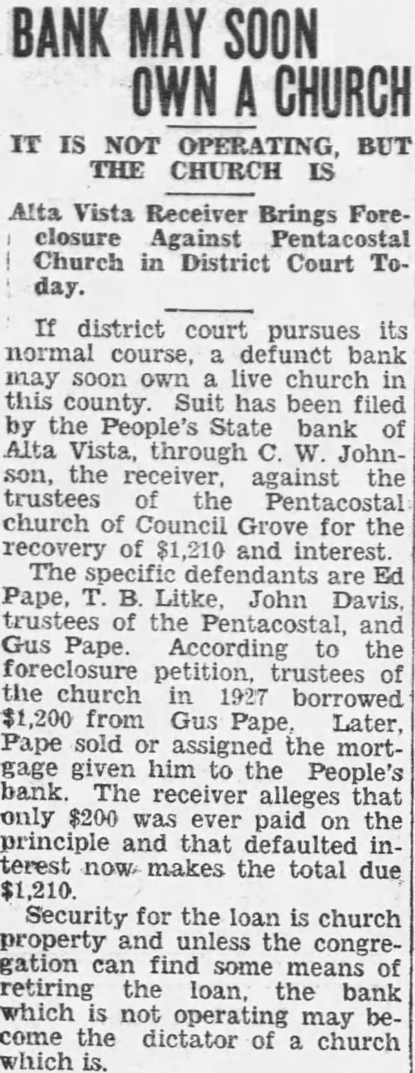 MAY IS NOT BUT THE CHURCH IS Alta Vista Receiver Brings Foreclosure Against Church in District Court day. If district court its pursues normal course, defunct bank may soon live church in this county. Suit has been filed by the People's State bank of Alta Vista, through Johnson, the receiver, against the trustees of the Pentacostal church of Council Grove for the recovery of $1,210 and interest. The specific defendants are Pape, John trustees of the Pentacostal, and Gus Pape. According to the foreclosure petition, of church in 1927 borrowed from Gus Pape, Later, Pape sold assigned the mortgage given him to the People's bank. The receiver that alleges only $200 was ever paid on the principle and that defaulted terest makes the total due Security for the loan is church property and unless the congregation can find some means of retiring the loan, the bank which not operating may become the dictator of church which is.