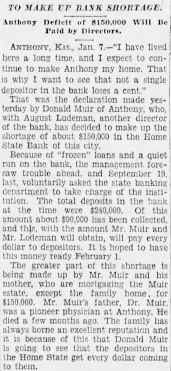 TO MAKE BANK Anthony Deficit $150,000 will by Directors. ANTHONY, KAS., Jan have lived here long time, and expect continue Anthony my home. That why want to see that not single depositor in the bank loses That the made yesterday by Donald Anthony, who, of the bank, has decided make the $150,000 in the Home State Bank this loans and quiet run on the bank, the trouble September 19. asked the state banking department charge of the institution. The total deposits in the were $240,000. Of amount about $90,000 has been collected, and with the amount Mr. Muir and Mr. Lodeman will obtain, will pay every dollar to depositors. hoped to have this ready February The greater part this shortage being made Mr. Muir his mother, are mortgaging the Muir except family for $150,000 Mr. Muir's Dr. few ago. The family has borne because this that Donald Muir going see that depositors the Home State get every dollar coming them.