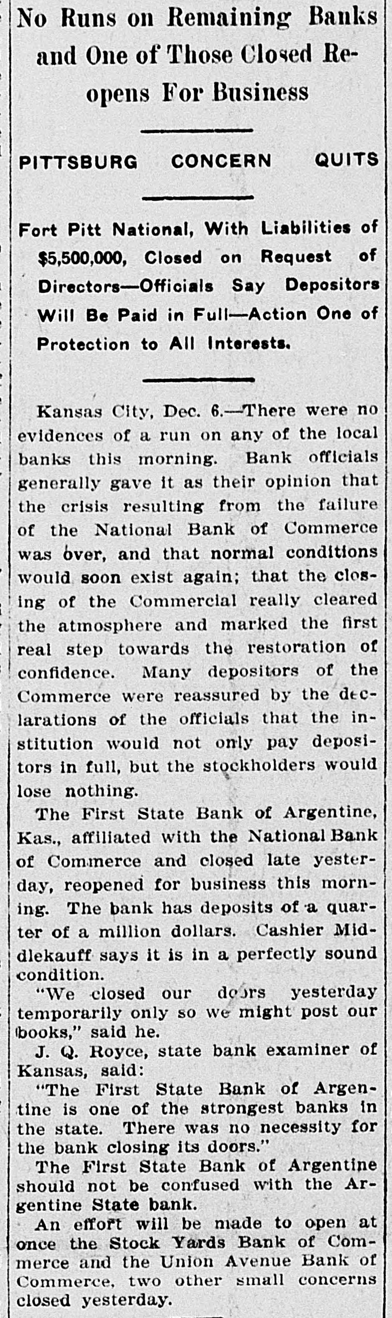 No Runs on Remaining Banks and One of Those Closed Reopens For Business PITTSBURG CONCERN QUITS Fort Pitt National, With Liabilities of $5,500,000, Closed on Request of Directors-Officials Say Depositors Will Be Paid in Full-Action One of Protection to All Interests. Kansas City, Dec. 6.-There were no evidences of a run on any of the local banks this morning. Bank officials generally gave it as their opinion that the crisis resulting from the failure of the National Bank of Commerce was over, and that normal conditions would soon exist again; that the closing of the Commercial really cleared the atmosphere and marked the first real step towards the restoration of confidence. Many depositors of the Commerce were reassured by the declarations of the officials that the institution would not only pay depositors in full, but the stockholders would lose nothing. The First State Bank of Argentine, Kas., affiliated with the National Bank of Commerce and closed late yesterday, reopened for business this morning. The bank has deposits of a quarter of a million dollars. Cashier Middlekauff says it is in a perfectly sound condition. "We closed our doors yesterday temporarily only so we might post our (books," said he. J. Q. Royce, state bank examiner of Kansas, said: "The First State Bank of Argentine is one of the strongest banks in the state. There was no necessity for the bank closing its doors." The First State Bank of Argentine should not be confused with the Argentine State bank. An effort will be made to open at once the Stock Yards Bank of Commerce and the Union Avenue Bank of Commerce, two other small concerns closed yesterday.