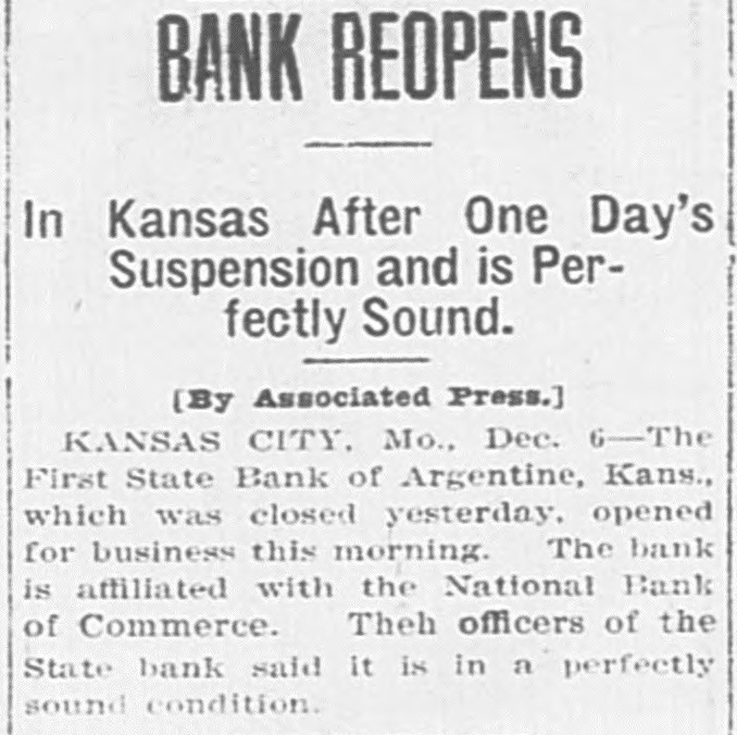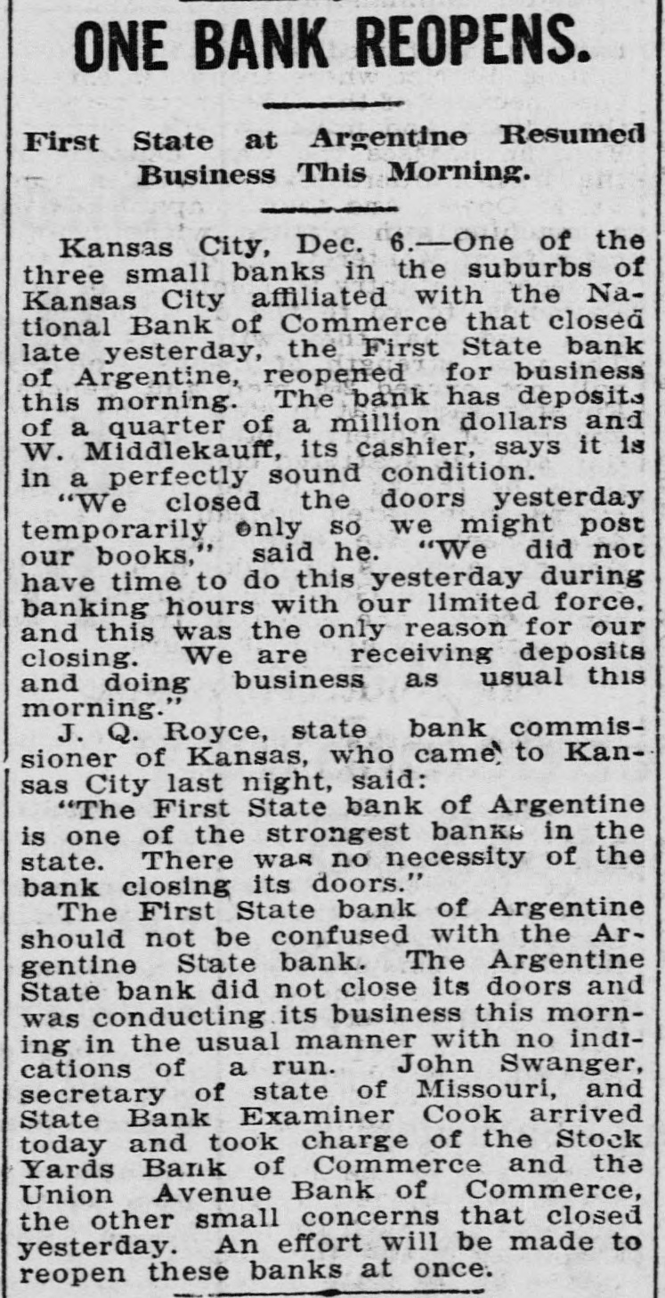 ONE BANK REOPENS. First State at Argentine Resumed Business This Morning. Kansas City, Dec. 6.-One of the three small banks in the suburbs of Kansas City affiliated with the National Bank of Commerce that closed late yesterday, the First State bank of Argentine, reopened for business this morning. The bank has deposits of a quarter of a million dollars and W. Middlekauff, its cashier, says it is in a perfectly sound condition. "We closed the doors yesterday temporarily only SO we might post our books," said he. "We did not have time to do this yesterday during banking hours with our limited force, and this was the only reason for our closing. We are receiving deposits and doing business as usual this morning." J. Q. Royce, state bank commissioner of Kansas, who came, to Kansas City last night, said: "The First State bank of Argentine is one of the strongest banks in the state. There was no necessity of the bank closing its doors." The First State bank of Argentine should not be confused with the Argentine State bank. The Argentine State bank did not close its doors and was conducting its business this morning in the usual manner with no indications of a run. John Swanger, secretary of state of Missouri, and State Bank Examiner Cook arrived today and took charge of the Stock Yards Bank of Commerce and the Union Avenue Bank of Commerce, the other small concerns that closed yesterday. An effort will be made to reopen these banks at once.