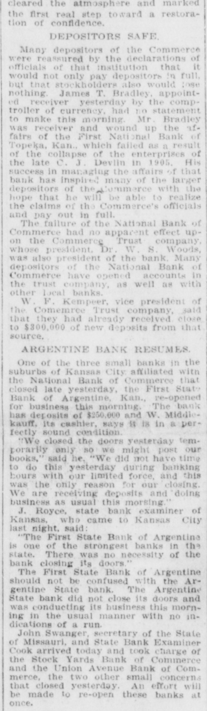 cleared the atmosphere and marked the first real step toward a restoration of confidence. DEPOSITORS SAFE. Many depositors of the Commerce were reassured by the declarations of officials of that institution that it would not only pay depositors in full, but that stockholders also would Inse nothing. James T. Bradley, appointed receiver yesterday by the comptroller of currency, had no statement to make this morning. Mr. Bradley was receiver and wound up the Iffairs of the First National Bank of Topeka, Kan., which failed as a result of the collapse of the enterprises of the late C. J. Devlin in 1905. His success in managing the affairs of that bank has inspired many of the larger depositors of the Commerce with the hope that he will be able to realize the claims of the Commerce's officials and pay out in full. The failure of the National Bank of Commerce had no apparent effect upon the Commerce Trust company, whose president, Dr. W. S. Woods, was also president of the bank. Many depositors of the National Bank of Commerce have opened accounts in the trust company, as well as with other local banks. W. F. Kempeer, vice president of the Comemree Trust company, said that they had already received close to $300,000 of new deposits from that source. ARGENTINE BANK RESUMES. One of the three small banks in the suburbs of Kansas City: affiliated with the National Bank of Commerce that closed late yesterday, the First State Bank of Argentine, Kan., re-opened for business this morning. The bank has deposits of $250,000 and W. Middlekauff, its cashier, says it is in a perfectly sound condition. "We closed the doors yesterday temporarily only so we might post our books," said he, "We did not have time to do this yesterday during banking hours with our limited force, and this was the only reason for our closing. We are receiving deposits and doing business as usual this morsing." J. Royce, state bank examiner of Kansas, who came to Kansas City last night, said: "The First State Bank of Argentine is one of the strongest banks in the state. There was no necessity of the bank closing its doors." The First State Bank of Argentine should not be confused with the Argentine State bank. The Argentine State bank did not close its doors and was conducting its business this morning in the usual manner with no indications of a run. John Swanger, secretary of the State of Missauri, and State Bank Examiner Cook arrived today and took charge of the Stock Yards Bank of Commerce and the Union Avenue Bank of Commerce, the two other small concerns that closed yesterday. An effort will be made to re-open these banks at once.