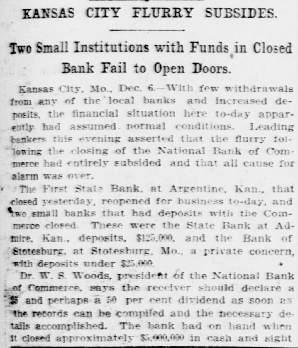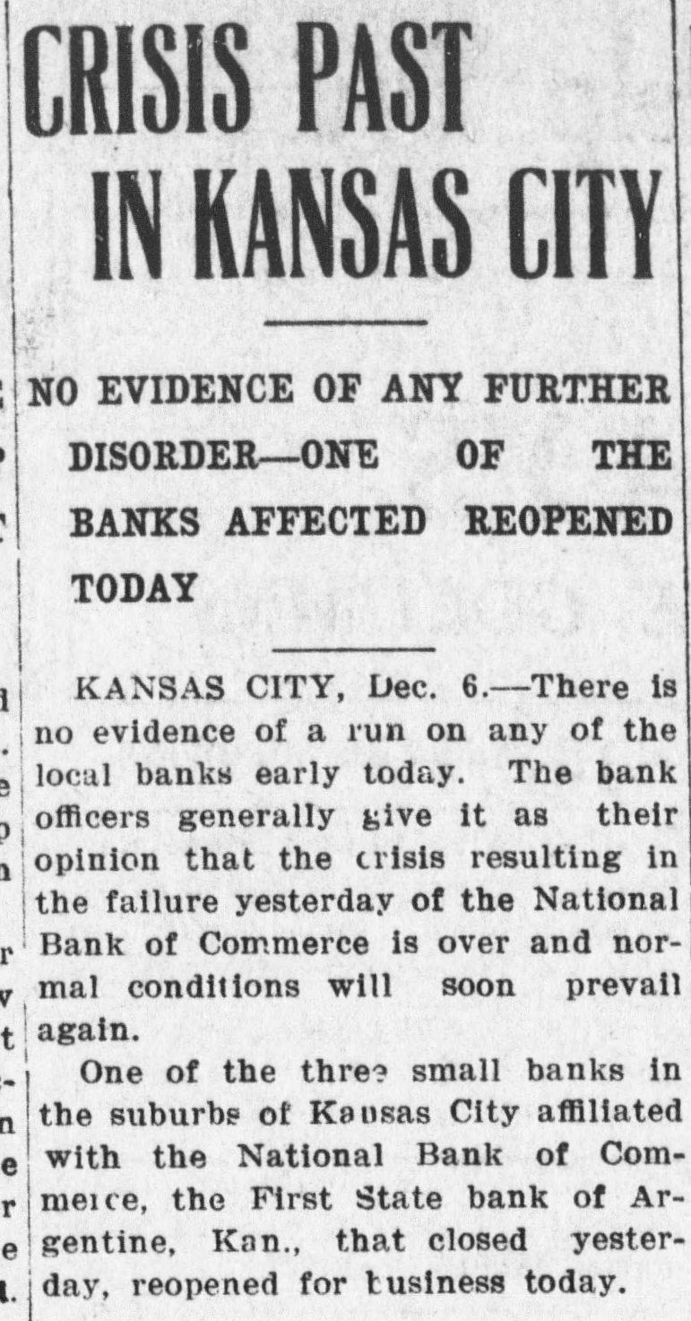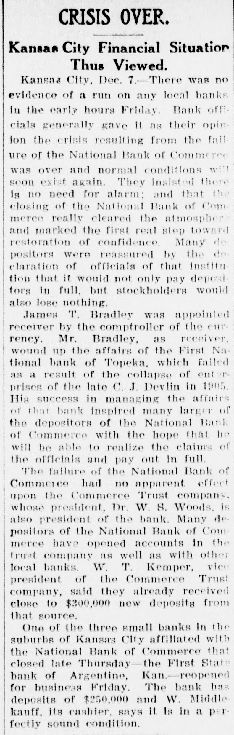 CRISIS OVER. Kansas City Financial Situation Thus Viewed. Kansas City, Dec. 7.-There was no evidence of a run on any local banks in the early hours Friday. Bank officials generally gave it as their opinion the crisis resulting from the failure of the National Bank of Commerce was over and normal conditions will soon exist again. They insisted there is no need for alarm: and that the closing of the National Bank of Commerce really cleared the atmosphere and marked the first real step toward restoration of confidence. Many depositors were reassured by the declaration of officials of that institution that it would not only pay depositors in full, but stockholders would also lose nothing. James T. Bradley was appointed receiver by the comptroller of the currency. Mr. Bradley, as receiver, wound up the affairs of the First National bank of Topeka, which failed as a result of the collapse of enterprises of the late C. J. Devlin in 1905. His success in managing the affairs of that bank inspired many larger of the depositors of the National Bank of Commerce with the hope that he will be able to realize the claims of the officials and pay out in full. The failure of the National Bank of Commerce had no apparent effect upon the Commerce Trust company. whose president, Dr. W. S. Woods. is also president of the bank. Many depositors of the National Bank of Commerce have opened accounts in the trust company as well as with other local banks. W. T. Kemper. vice president of the Commerce Trust company, said they already received close to $300,000 new deposits from that source. One of the three small banks in the suburbs of Kansas City affiliated with the National Bank of Commerce that closed late Thursday-the First State bank of Argentine, Kan.-reopened for business Friday. The bank has deposits of $250,000 and W. Middlekauff, its cashier. says it is in a perfectly sound condition.