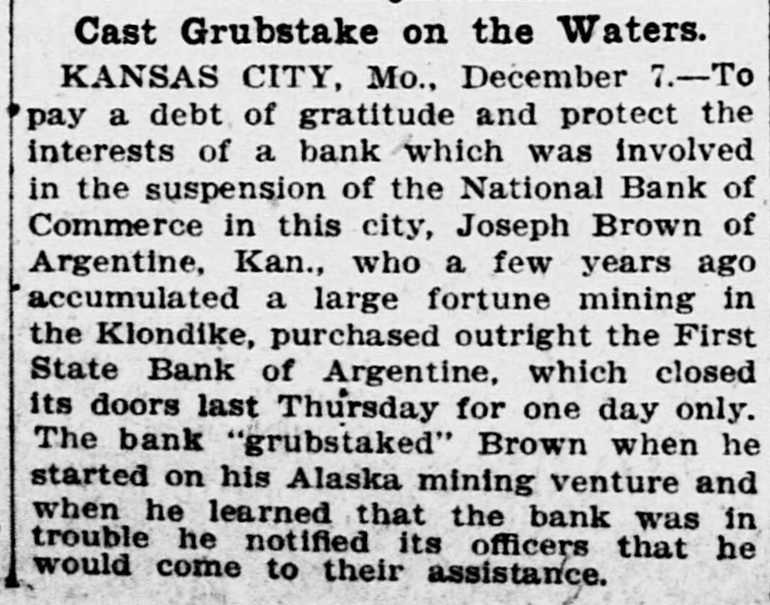 Cast Grubstake on the Waters. KANSAS CITY, Mo., December 7.-To pay a debt of gratitude and protect the interests of a bank which was involved in the suspension of the National Bank of Commerce in this city, Joseph Brown of Argentine, Kan., who a few years ago accumulated a large fortune mining in the Klondike, purchased outright the First State Bank of Argentine, which closed its doors last Thursday for one day only. The bank "grubstaked" Brown when he started on his Alaska mining venture and when he learned that the bank was in trouble he notified its officers that he would come to their assistance.