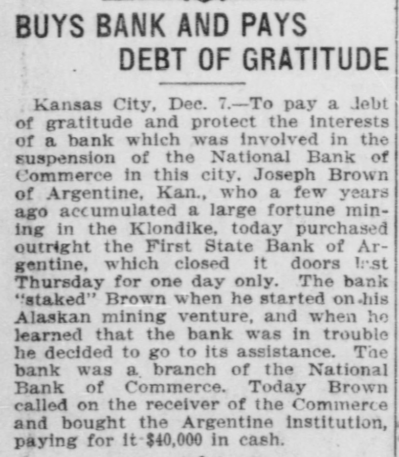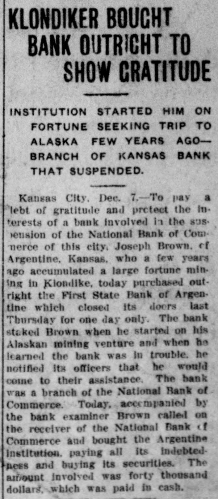 KLONDIKER BOUCHT BANK OUTRIGHT TO SHOW CRATITUDE INSTITUTION STARTED HIM ON FORTUNE SEEKING TRIP TO ALASKA FEW YEARS AGOBRANCH OF KANSAS BANK THAT SUSPENDED. Kansas City. Dec. 7.-To pay a lebt of gratitude and protect the interests of a bank involved in the suspension of the National Bank of Commerce of this city, Joseph Brown. of Argentine, Kansas. who a few years ago accumulated a large fortune mining in Klondike, today purchased outright the First State Bank of Argentine which closed its doers last Thursday for one day only. The bank staked Brown when he started on his Alaskan mining venture and when he learned the bank was in trouble. he notified its officers that he would come to their assistance. The bank was a branch of the National Bank of Commerce. Today. accompanied by the bank examiner Brown called on the receiver of the National Bank of Commerce and bought the Argentine Institution. paying all its indebted. ness and buying its securities. The amount involved was forty thousand dollars. which was paid in cash.