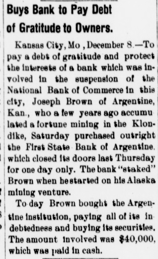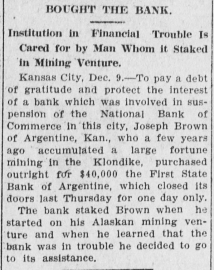 BOUGHT THE BANK. Institution in Financial Trouble Is Cared for by Man Whom it Staked in Mining Venture. Kansas City, Dec. 9.-To pay a debt of gratitude and protect the interest of a bank which was involved in suspension of the National Bank of Commerce in this city, Joseph Brown of Argentine, Kan., who a few years ago accumulated a large fortune mining in the Klondike, purchased outright for $40,000 the First State Bank of Argentine, which closed its doors last Thursday for one day only. The bank staked Brown when he started on his Alaskan mining venture and when he learned that the bank was in trouble he decided to go to its assistance.