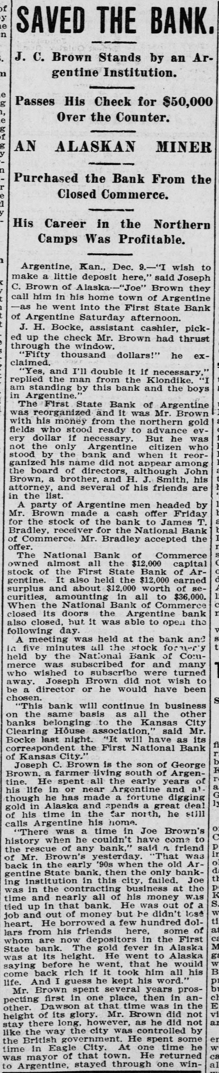 f y e SAVED THE BANK. n J. C. Brown Stands by an Arn gentine Institution. e g Passes His Check for $50,000 Over the Counter. e g AN ALASKAN MINER Purchased the Bank From the Closed Commerce. His Career in the Northern Camps Was Profitable. Argentine, Kan., Dec. 9.-"I wish to make a little deposit here," said Joseph C. Brown of Alaska-"Joe" Brown they call him in his home town of Argentine -as he went into the First State Bank of Argentine Saturday afternoon. J. H. Bocke, assistant cashier, picked up the check Mr. Brown had thrust through the window. "Fifty thousand dollars!" he exclaimed. "Yes, and I'll double it if necessary," replied the man from the Klondike. "I am standing by this bank and the boys in Argentine." The First State Bank of Argentine was reorganized and it was Mr. Brown with his money from the northern gold fields who stood ready to advance every dollar if necessary. But he was not the only Argentine citizen who stood by the bank and when it reorganized his name did not appear among the board of directors, although John Brown, a brother, and H. J. Smith, his attorney, and several of his friends are in the list. 1 A party of Argentine men headed by Mr. Brown made a cash offer Friday a for the stock of the bank to James T. b Bradley, receiver for the National Bank I of Commerce. Mr. Bradley accepted the I offer. to The National Bank of Commerce ( owned almost all the $12,000 capital o stock of the First State Bank of Aro gentine. It also held the $12,000 earned A surplus and about $12,000 worth of se1 curities, amounting in all to $36,000. c When the National Bank of Commerce n closed its doors the Argentine bank also closed, but it was able to open the V following day. S A meeting was held at the bank and t la five minutes all the stock former's held by the National Bank of Commerce was subscribed for and many who wished to subscribe were turned away. Joseph Brown did not wish to be a director or he would have been chosen. S "This bank will continue in business on the same basis as all the other banks belonging to the Kansas City Clearing House association," said Mr. Bocke last night. "It will have as its fi correspondent the First National Bank r of Kansas City." b Joseph C. Brown is the son of George K Brown, a farmer living south of Argenr tine. He spent all the early years of a his life in or near Argentine and al. G though he has made a fortune digging ly gold in Alaska and spends a great deal of his time in the far north, he still calls Argentine his home. o "There was a time in Joe Brown's C history when he couldn't have come to p the rescue of any bank," said n friend in of Mr. Brown's yesterday. "That was o back in the early '90s when the old Ard gentine State bank, then the only bankth ing institution in this city, failed. Joe p was in the contracting business at the K time and nearly all of his money was S tied up in that bank. He was out of a W job and out of money but be didn't lose ti heart. He borrowed a few hundred dolat lars from his friends here, some of ca whom are now depositors in the First M State bank. The gold fever in Alaska ga was at its height. He went to Alaska W saying before he went, that he would B come back rich if it took him all his