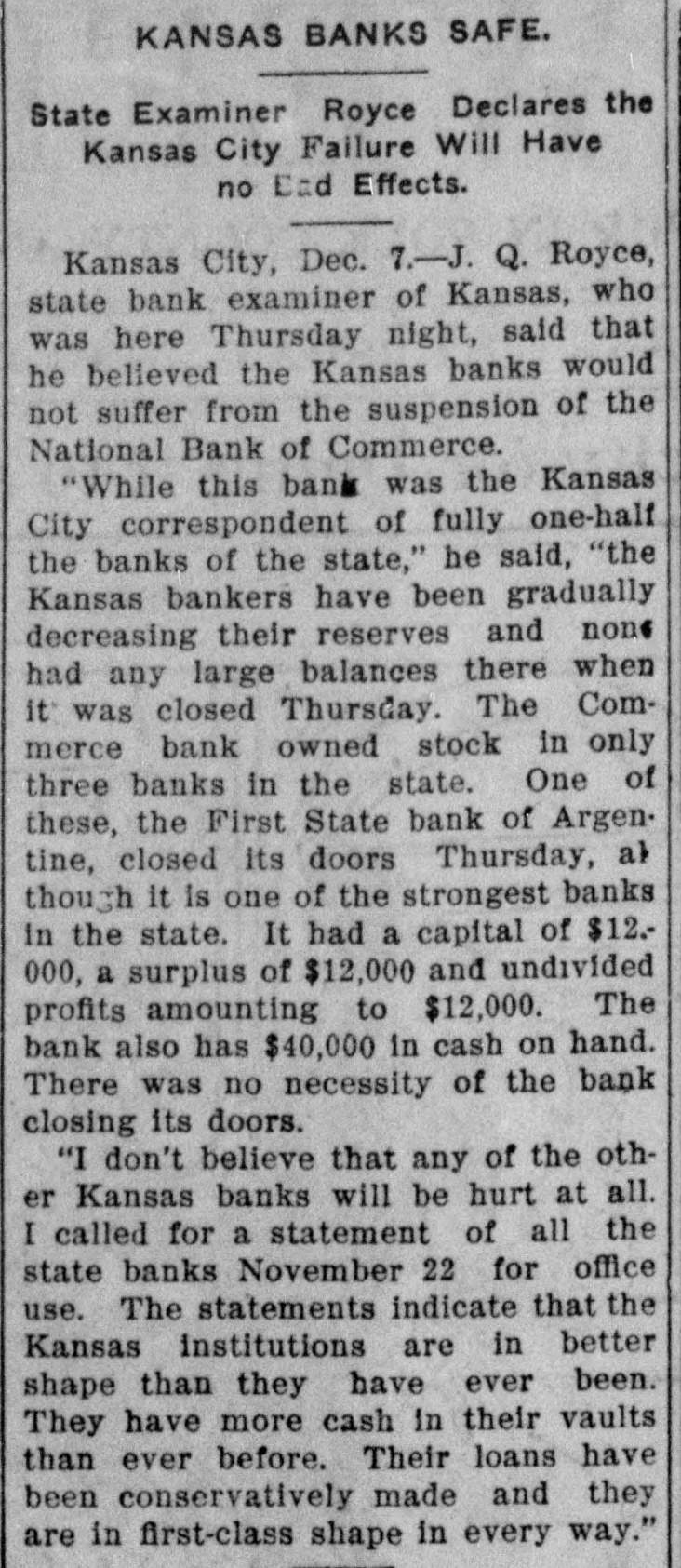 KANSAS BANKS SAFE. State Examiner Royce Declares the Kansas City Failure Will Have no End Effects. Kansas City, Dec. 7.-J. Q. Royce, state bank examiner of Kansas, who was here Thursday night, said that he believed the Kansas banks would not suffer from the suspension of the National Bank of Commerce. "While this bank was the Kansas City correspondent of fully one-half the banks of the state," he said, "the Kansas bankers have been gradually decreasing their reserves and none had any large balances there when it was closed Thursday. The Commerce bank owned stock in only three banks in the state. One of these, the First State bank of Argen. tine, closed its doors Thursday, at though it is one of the strongest banks in the state. It had a capital of $12.000, a surplus of $12,000 and undivided profits amounting to $12,000. The bank also has $40,000 in cash on hand. There was no necessity of the bank closing its doors. "I don't believe that any of the other Kansas banks will be hurt at all. I called for a statement of all the state banks November 22 for office use. The statements indicate that the Kansas institutions are in better shape than they have ever been. They have more cash in their vaults than ever before. Their loans have been conservatively made and they are in first-class shape in every way."