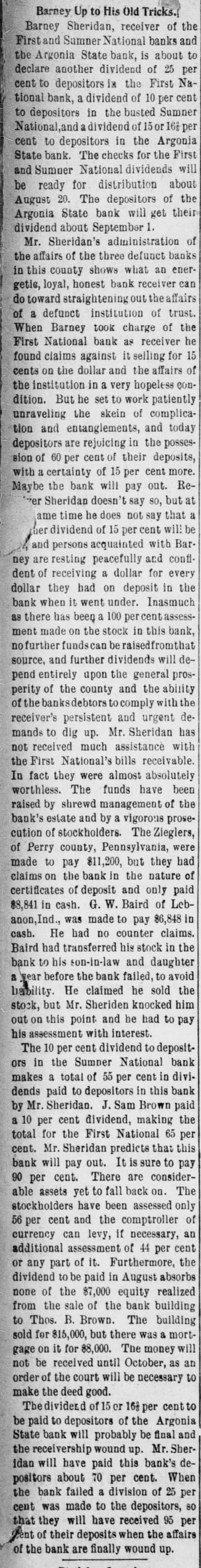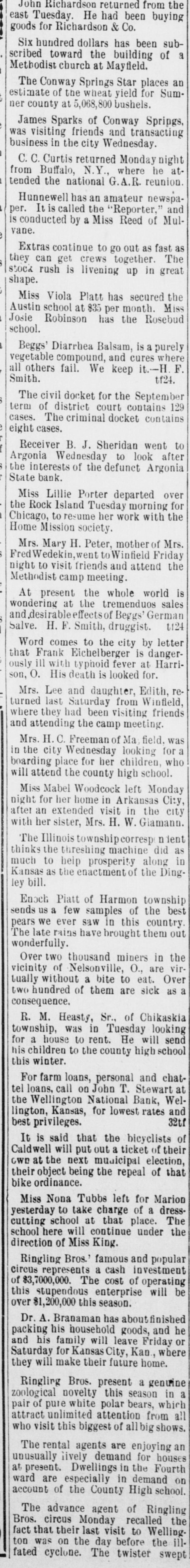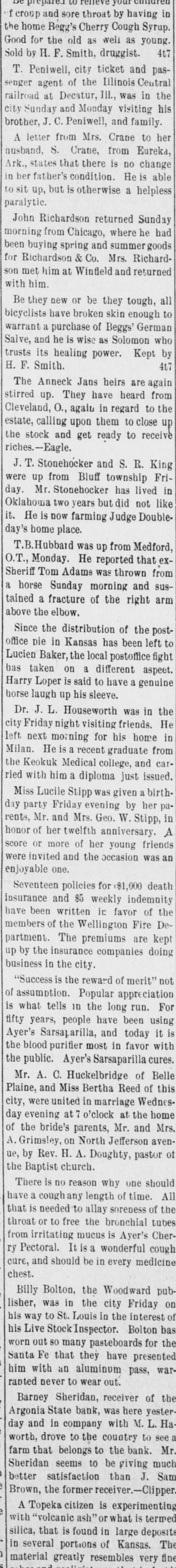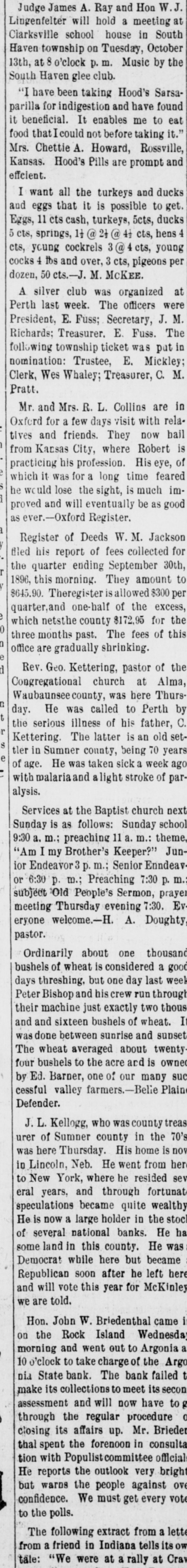 school house in South Haven township on Tuesday, October 13th, at 8 o'clock p. m. Music by the South Haven glee club. "I have been taking Hood's Sarsaparilla for indigestion and have found it beneficial. It enables me to eat food that Icould not before taking it." Mrs. Chettie A. Howard, Rossville, Kansas. Hood's Pills are prompt and effcient. I want all the turkeys and ducks and eggs that it is possible to get. Eggs, 11 cts cash, turkeys, 5cts, ducks 5 cts, springs, 11 @ 21 @ 41 cts, hens 4 cts, young cockrels 3 @ 4 ets, young cocks 4 lbs and over, 3 cts, pigeons per dozen, 50 cts.-J. M. MCKEE. A silver club was organized at Perth last week. The officers were President, E. Fuss; Secretary, J. M. Richards: Treasurer. E. Fuss. The following township ticket was put in nomination: Trustee, E. Mickley; Clerk, Wes Whaley; Treasurer, C. M. Pratt. Mr. and Mrs. R. L. Collins are in Oxford for a few days visit with relatives and friends. They now bail from Kansas City, where Robert is practicing his profession. His eye, of which it was for a long time feared he would lose the sight, is much improved and will eventually be as good as ever.-Oxford Register. Register of Deeds W. M. Jackson filed his report of fees collected for the quarter ending September 30th, 1896, this morning. They amount to $645.90. Theregister is allowed $300 per quarter,and one-half of the excess, which netsthe county $172.95 for the three months past. The fees of this office are gradually shrinking. Rev. Geo. Kettering, pastor of the Congregational church at Alma, Waubaunsee county, was here Thursday. He was called to Perth by the serious illness of his father, C. r Kettering. The latter is an old setS tler in Sumner county, being 70 years e of age. He was taken sick a week ago with malariaand alight stroke of paralysis. Services at the Baptist church next Sunday is as follows: Sunday school 9:30 a. m.; preaching 11 a. m.: theme, "Am I my Brother's Keeper?" Junior Endeavor 3 p. m.; Senior Enndeavor 6:30 p. m.; Preaching 7:30 p. m.; subject Old People's Sermon, prayer meeting Thursday evening 7:30. Ev. eryone welcome.-H. A. Doughty pastor. Ordinarily about one thousand bushels of wheat is considered a good days threshing, but one day last week Peter Bishop and his crew run through their machine just exactly two thous and and sixteen bushels of wheat. It was done between sunrise and sunset The wheat averaged about twenty four bushels to the acre and is owned by Ed. Barner, one of our many suc cessful valley farmers.-Belie Plain Defender. J. L. Kellogg, who was county treas urer of Sumner county in the 70's was here Thursday. His home is nov in Lincoln, Neb. He went from her to New York, where he resided sev eral years, and through fortunat speculations became quite wealthy He is now a large holder in the stocl of several national banks. He ha some land in this county. He was Democrat while here but became Republican soon after he left here and will vote this year for McKinley we are told. Hon. John W. Briedenthal came i on the Rock Island Wednesda morning and went out to Argonia a 10 o'clock to take charge of the Argo nia State bank. The bank failed t make its collections to meet its secon assessment and will now have to g through the regular procedure 0 closing its affairs up. Mr. Brieder thal spent the forenoon in consulta tion with Populist committee official He reports the outlook very bright but warns the people against ove confidence. We must get every vote