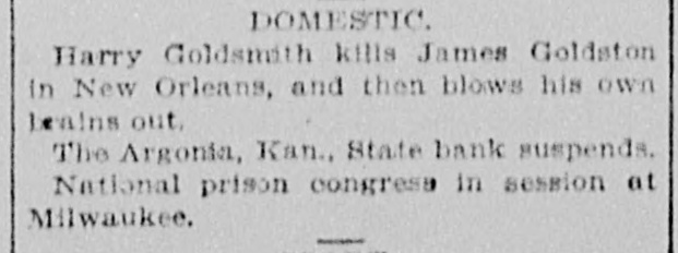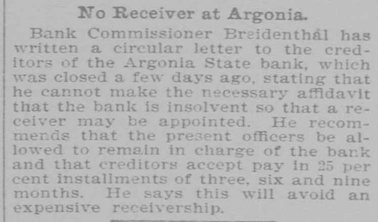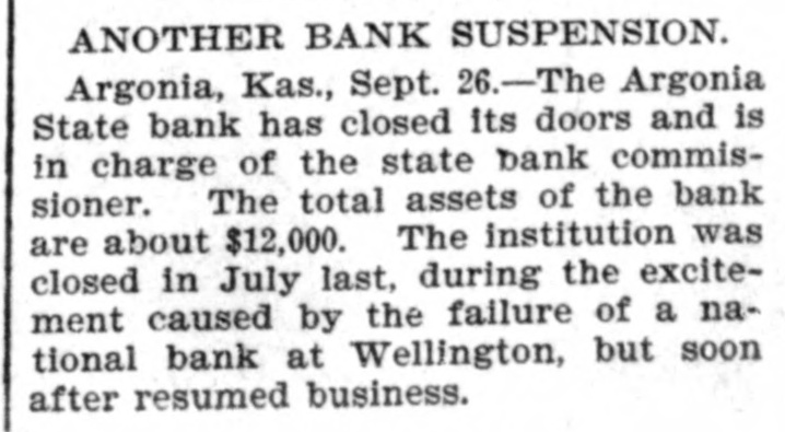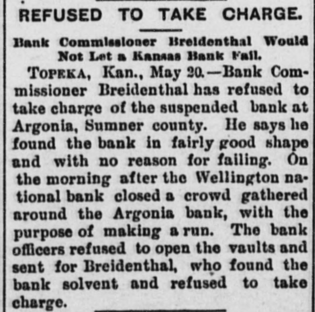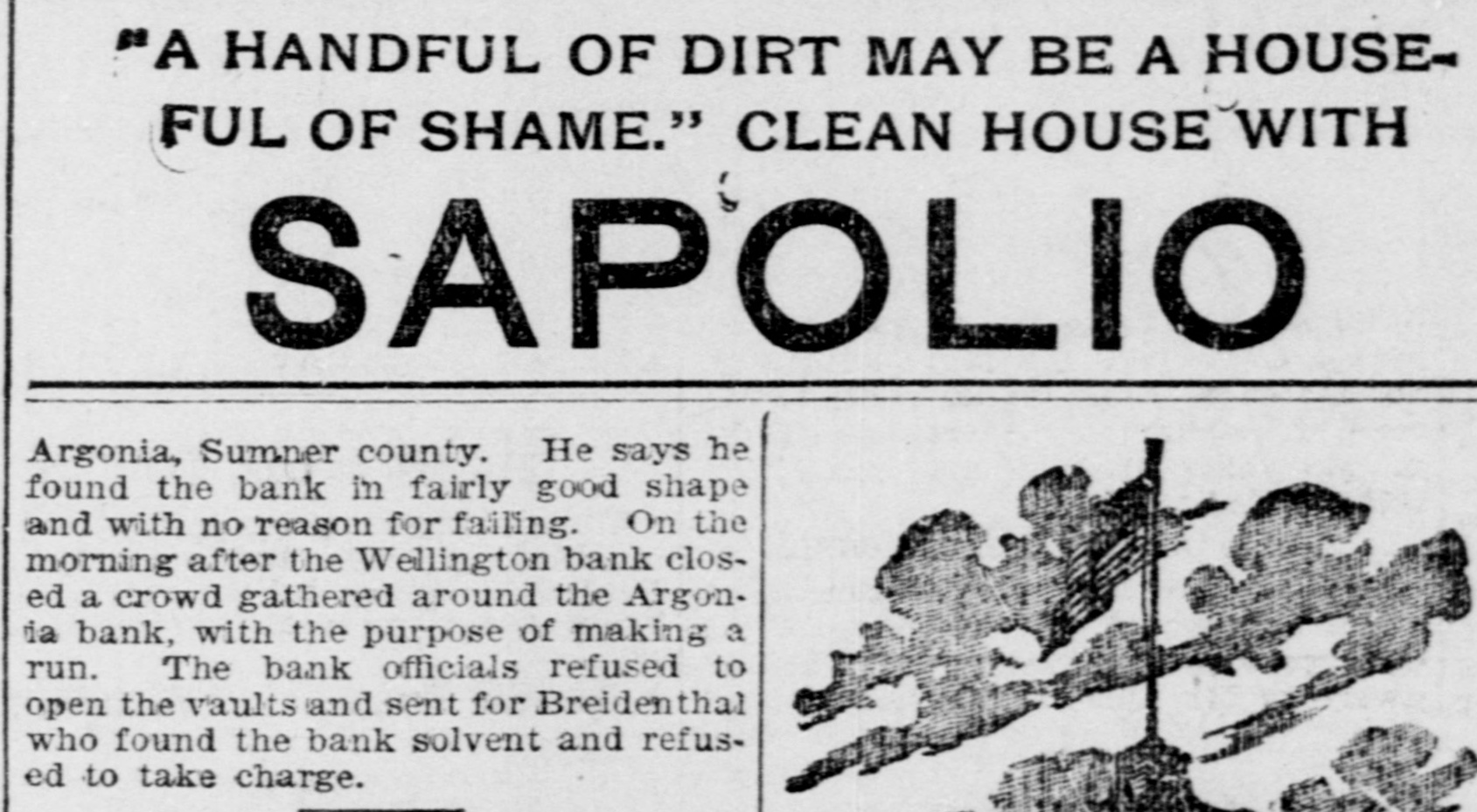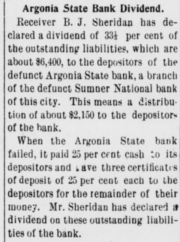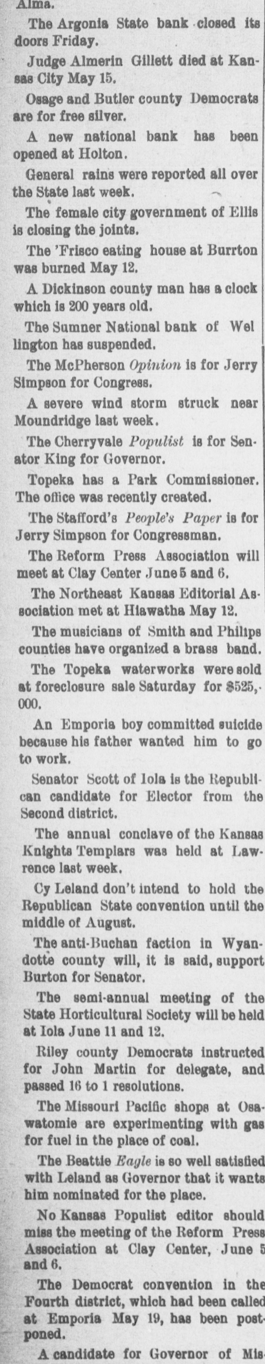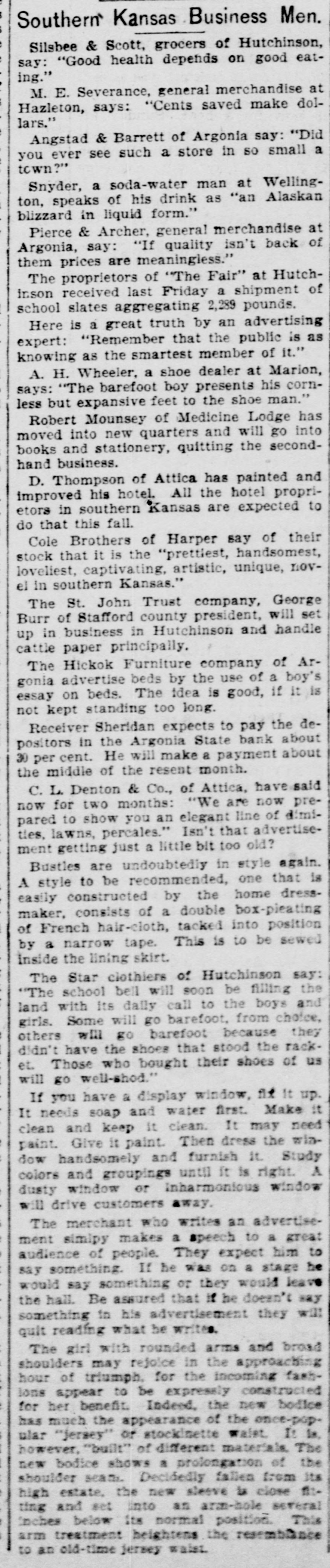 school house in South Haven township on Tuesday, October 13th, at 8 o'clock p. m. Music by the South Haven glee club. "I have been taking Hood's Sarsaparilla for indigestion and have found it beneficial. It enables me to eat food that Icould not before taking it." Mrs. Chettie A. Howard, Rossville, Kansas. Hood's Pills are prompt and effcient. I want all the turkeys and ducks and eggs that it is possible to get. Eggs, 11 cts cash, turkeys, 5cts, ducks 5 cts, springs, 11 @ 21 @ 41 cts, hens 4 cts, young cockrels 3 @ 4 ets, young cocks 4 lbs and over, 3 cts, pigeons per dozen, 50 cts.-J. M. MCKEE. A silver club was organized at Perth last week. The officers were President, E. Fuss; Secretary, J. M. Richards: Treasurer. E. Fuss. The following township ticket was put in nomination: Trustee, E. Mickley; Clerk, Wes Whaley; Treasurer, C. M. Pratt. Mr. and Mrs. R. L. Collins are in Oxford for a few days visit with relatives and friends. They now bail from Kansas City, where Robert is practicing his profession. His eye, of which it was for a long time feared he would lose the sight, is much improved and will eventually be as good as ever.-Oxford Register. Register of Deeds W. M. Jackson filed his report of fees collected for the quarter ending September 30th, 1896, this morning. They amount to $645.90. Theregister is allowed $300 per quarter,and one-half of the excess, which netsthe county $172.95 for the three months past. The fees of this office are gradually shrinking. Rev. Geo. Kettering, pastor of the Congregational church at Alma, Waubaunsee county, was here Thursday. He was called to Perth by the serious illness of his father, C. r Kettering. The latter is an old setS tler in Sumner county, being 70 years e of age. He was taken sick a week ago with malariaand alight stroke of paralysis. Services at the Baptist church next Sunday is as follows: Sunday school 9:30 a. m.; preaching 11 a. m.: theme, "Am I my Brother's Keeper?" Junior Endeavor 3 p. m.; Senior Enndeavor 6:30 p. m.; Preaching 7:30 p. m.; subject Old People's Sermon, prayer meeting Thursday evening 7:30. Ev. eryone welcome.-H. A. Doughty pastor. Ordinarily about one thousand bushels of wheat is considered a good days threshing, but one day last week Peter Bishop and his crew run through their machine just exactly two thous and and sixteen bushels of wheat. It was done between sunrise and sunset The wheat averaged about twenty four bushels to the acre and is owned by Ed. Barner, one of our many suc cessful valley farmers.-Belie Plain Defender. J. L. Kellogg, who was county treas urer of Sumner county in the 70's was here Thursday. His home is nov in Lincoln, Neb. He went from her to New York, where he resided sev eral years, and through fortunat speculations became quite wealthy He is now a large holder in the stocl of several national banks. He ha some land in this county. He was Democrat while here but became Republican soon after he left here and will vote this year for McKinley we are told. Hon. John W. Briedenthal came i on the Rock Island Wednesda morning and went out to Argonia a 10 o'clock to take charge of the Argo nia State bank. The bank failed t make its collections to meet its secon assessment and will now have to g through the regular procedure 0 closing its affairs up. Mr. Brieder thal spent the forenoon in consulta tion with Populist committee official He reports the outlook very bright but warns the people against ove confidence. We must get every vote