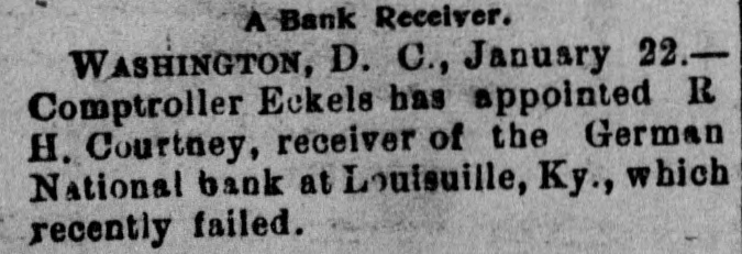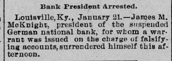 TWO KENTUCKY BANKS FAIL. The German National of Louisville and the First National of Newport. LOUISVILLE. Ky., Jan. 18.-The German National Bank, at First and Market streets. did not open its doors for business this morning. and the announcement was made that the institution was in the hands of Bank Examiner James E. Scott. The capital stock is $251,500. with a surplus of $31,000. J. M. McKnight is President. The bank has been in a shaky condition for three years, owing to the failure of the Louisville Deposit Bank, by which it lost $75,000. and there are also lawsuits involving between $250,000 and $300,000 pending. growing out of the bank's connection with the failure. Since the first of the year $75,000 in deposits have been withdrawn and several days ago Bank Examiner Escott began an investigation. On Saturday he telegraphed the result to the Comptroller of the Currency, and the order came for the bank to be closed at once. President McKnight says depositors will be paid in full. The bank has on hand, $60,000 in cash. The deposits subject to check are about $255,000. There are also certificates of deposit for $60,000. Mr. McKnight hopes to have the bank reorganized and ready for business in fifteen days. CINCINNATI. Jan. 18.-The First National Bank of Newport, Ky., closed its doors this morning. The news spread rapidly and soon there was a crowd of excited depositors assembled in front of the bank clamoring for an explanation. The officers sent out word that the bank was solvent, but had been forced to close down for lack of ready money. Assurances were offered that no one would lose anything. The depositors, however. refused to be satisfied. The excitement grew still greater when it became known that Comptroller of the Currency Eckels and a National Bank Examiner of Washington were to be in Newport to-day. A late and rather startling development is that Mr. John Trapp, ex-Sheriff of the county. who was elected President of the bank a week ago to succed Dr. Gunkel. who precipitately resigned. refused to accept the office unless the bank's affairs were thoroughly investigated. It seems that C. W. Nagel, who was elected to succeed Yontsey as cashier. had made sufficient investigation himself to warrant him in warning his friend Trapp that all was not as it should be. Therefore the bank had been without a President for nearly a week. Every bank in Covington, which adjoins Newport, had to meet a run to-day as best it could on short notice. Citizens rushed to their places of deposit by the hundreds as soon as they heard the news that the First National had not opened its doors in the morning and drew their savings. Many heavy depositors were among these. The Third National Bank was the New York correspondent of the Germania National Bank of Louisville. The Germania Bank owes it $13,000. and the loan is fully protected by collateral. The First National Bank was the New York correspondent of the First National of Newport. At the New York bank it was said that the Newport bank had a small balance there.