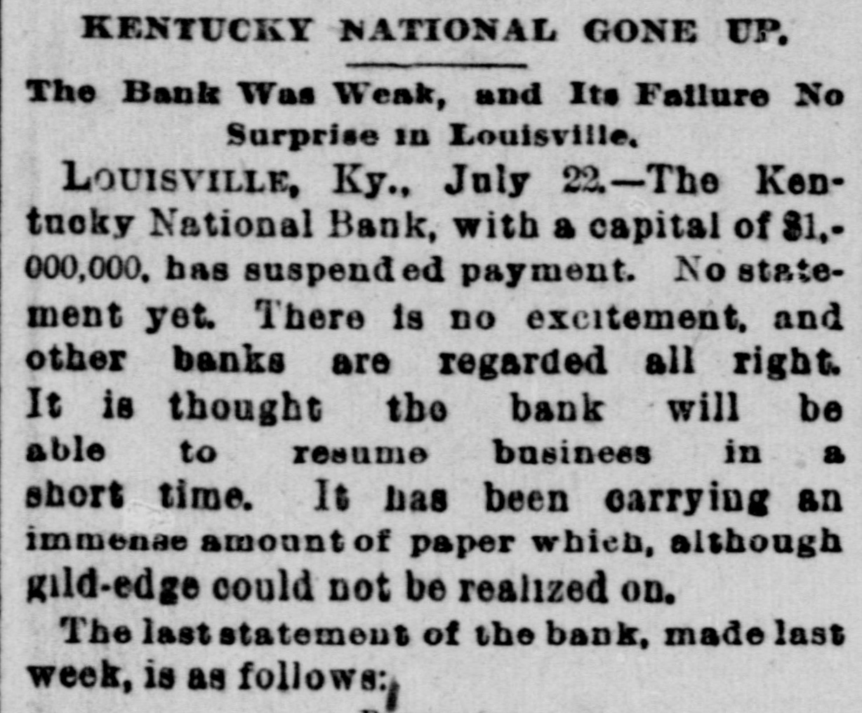 CONCERNING BUSINESS AND FINANCE. MILWAUKEE, WIS., July 22.-Runs which started on all the banks early in the day were still in progress this afternoon. The crowds at several of the banks had increased in consequence of the spread of the news that the South Side Savings Bank and Milwaukee National Bank had failed. The run on the Merchants Exchange Bank was probably the heaviest, but the crowd that was at the SecondWard Bank was nearly as large. The Merchants' Exchange Bank paid out money freely and its officers said they were contident they would be able to meet every demand. The air was full of rumors of failures and impending failures in mercantile circles, but up to noon no suspensions had occurred. President Trumpff, of the South Side Savings Bank, said depositors had been making large withdrawals during the past month, while collections had been impossible. The officials and directors decided they could do business no longer under the circumstances, and concluded that in the interests of the patrons and themselves it would be better to suspend without further delay. While they hope to be able to resume after the storm has blown over, they are not able to state anything definite. The closing of the Milwaukee National Bank was a surprise, even to some of the stockholders. J. M. Perees, who owns a block of the bank's stock, says there is no reason why the bank should have closed except that the officers were afraid to stand of run. A statement of a few days ago showed that the bank had assets in excess of liabilities amounting to between $500,000 and $600,000. People who were not posted could not believe the bank, which was one of the oldest in the city, had failed, and scores of people walked into the entrance, read the brief notice announcing the bank's suspension, and walked out again. KNOXVILLE, TENN., July 20.-The State National Bank closed this morning. The notice posted on the doors stating "The bank has closed for liquidation. Deposiand tor will be paid in full. Liabilities assets not known outside. MILWAUKEE, WIS., July 20.-Judge Noves, president of the Milwaukee National Bank. has given out the following statement for publication: This bank consider perfectly solvent. It has $300,000 assets above liabilities. In ordinary times it would pay all depositors in full within three months, leaving a surplus of two hundred cents on the dollar for distribution among the stockholders, The reason for closing to-day is the one that has been so much repeated in the last sixty days that the public know it without being told. The shrinkage and withdrawal of deposits and the inability of customers to meet their obligations to the bank led the directors to the conclusion that it is best for the interest of all concerned to close the doors at this time. Fortunately depositors in this bank are such that no one will be seriously injured bv delay in obtaining their money. A meeting of the stockholders will doubtless be called soon to vote on the question of a resumption of the business or of going into voluntary liquidation. The Controller of Currency has been notified of the situation." LOUISVILLE, Ky., July 22.-The Kentucky National bank, capital $1,000,000, has suspended payment. No statement. There is no excitement, and all others regarded as all right. MILWAUKEE, WIS., July 22.-The South Side Savings bank opened as usual this morning, but closed their doors at 10:30. The report of the bank, made on the first Wednesday of this month. is as follows: Assets, loans and discounts, $781,325.30; due from brokers on call loans, $65,000; over-drafts, $3,948; United States and other bonds on hand, $15,000; banking house and fixtures, $7,974.02; due from banks and bankers, $7,916.38; cash items, nickels and pennies, $735.21 checks on clearing house, $40,825.73; specie, $23,720; United States and other National bank notes, $162,520; total, $1,158,965.17. Liabilities, $100,000; undivided profits, $12,500; due depositor on demand, $286,012.46; due creditors on time, $785,452.71; due all others not included under above headings, $25,000; total, $1,158,965.17. RUSSELL, KAS., July 22.-The First National Bank of this place closed this morning and was taken possession by C. M. Sawyer, on order of the comptroller of currency. No statement is made. NEW YORK, July 22.-The weekly statement of the associated banks shows the following changes: Reserve, increase, $3,012,550; loans, decrease, $4,808,300; specie increase, $1,584,400: legal tenders, increase, $503,700; deposits, decrease, $3,697,800; circulation, increase, $129,000. The banks are now $1,256,550 below the requirements of the 25 per cent. rule.
