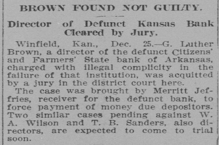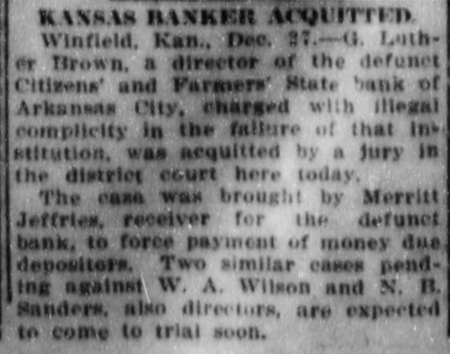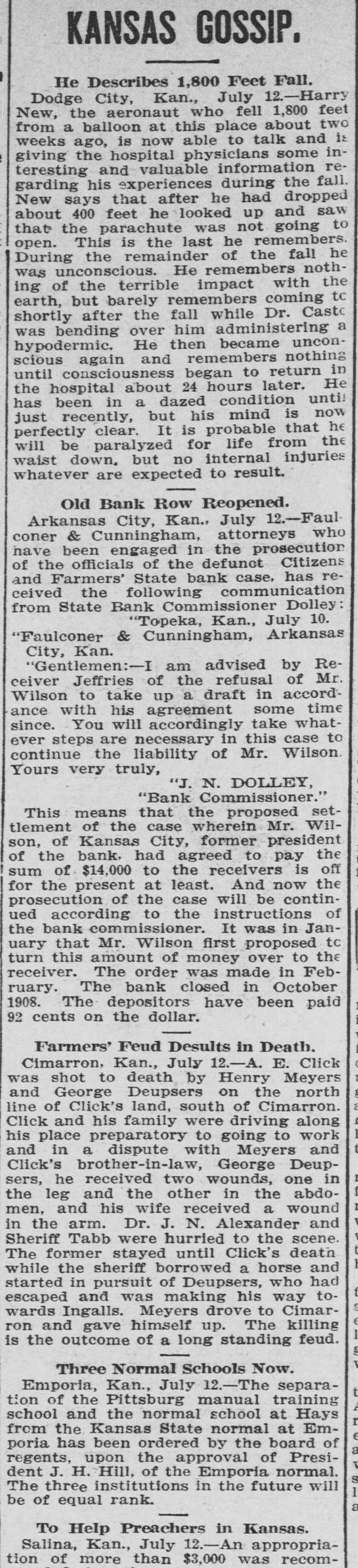 KANSAS GOSSIP. He Describes 1,800 Feet Fall. Dodge City, Kan., July 12.-Harry New, the aeronaut who fell 1,800 feet from a balloon at this place about two weeks ago, is now able to talk and is giving the hospital physicians some interesting and valuable information regarding his experiences during the fall. New says that after he had dropped about 400 feet he looked up and saw that the parachute was not going to open. This is the last he remembers. During the remainder of the fall he was unconscious. He remembers nothing of the terrible impact with the earth, but barely remembers coming tc shortly after the fall while Dr. Casto was bending over him administering a hypodermic. He then became unconscious again and remembers nothing until consciousness began to return in the hospital about 24 hours later. He has been in a dazed condition unti! just recently, but his mind is now perfectly clear. It is probable that he will be paralyzed for life from the waist down. but no internal injuries whatever are expected to result. Old Bank Row Reopened. Arkansas City, Kan., July 12.-Faulconer & Cunningham, attorneys who have been engaged in the prosecution of the officials of the defunct Citizens and Farmers' State bank case, has received the following communication from State Bank Commissioner Dolley: "Topeka, Kan., July 10. "Faulconer & Cunningham, Arkansas City, Kan. "Gentlemen:-I am advised by Receiver Jeffries of the refusal of Mr. Wilson to take up a draft in accord. ance with his agreement some time since. You will accordingly take whatever steps are necessary in this case to continue the liability of Mr. Wilson. Yours very truly, "J. N. DOLLEY, "Bank Commissioner." This means that the proposed settlement of the case wherein Mr. Wilson, of Kansas City, former president of the bank. had agreed to pay the sum of $14,000 to the receivers is off for the present at least. And now the prosecution of the case will be continued according to the instructions of the bank commissioner. It was in January that Mr. Wilson first proposed tc turn this amount of money over to the receiver. The order was made in February. The bank closed in October 1908. The depositors have been paid 92 cents on the dollar. Farmers' Feud Desults in Death. Cimarron, Kan., July 12.-A. E. Click was shot to death by Henry Meyers and George Deupsers on the north line of Click's land, south of Cimarron. Click and his family were driving along his place preparatory to going to work and in a dispute with Meyers and Click's brother-in-law, George Deupsers, he received two wounds, one in the leg and the other in the abdomen, and his wife received a wound in the arm. Dr. J. N. Alexander and Sheriff Tabb were hurried to the scene. The former stayed until Click's death while the sheriff borrowed a horse and started in pursuit of Deupsers, who had f escaped and was making his way towards Ingalls. Meyers drove to Cimare ron and gave himself up. The killing is the outcome of a long standing feud. Three Normal Schools Now. Emporia, Kan., July 12.-The separat tion of the Pittsburg manual training school and the normal school at Hays I from the Kansas State normal at Eme poria has been ordered by the board of a regents, upon the approval of President J. H. Hill, of the Emporia normal. S The three institutions in the future will 1 be of equal rank. a To Help Preachers in Kansas. Salina, Kan., July 12.-An appropriation of more than $3,000 was recom-