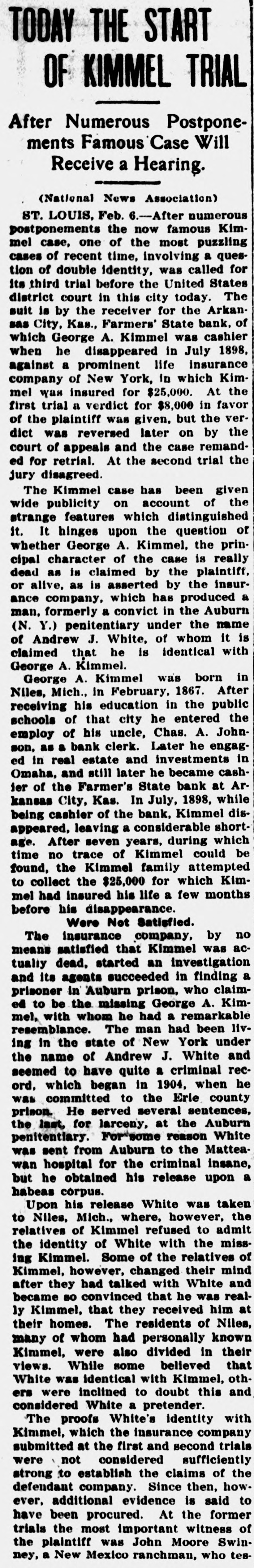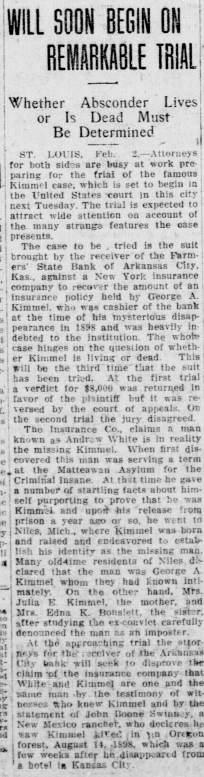 # WILL SOON BEGIN ON # REMARKABLE TRIAL Whether Absconder Lives or Is Dead Must Be Determined ST. LOUIS, Feb. 2.-Attorneys for both sides are busy at work pre- paring for the trial of the famous Kimmel case, which is set to begin in the United States court in this city next Tuesday. The trial is expected to attract wide attention on account of the many strange features the case presents. The case to be tried is the suit brought by the receiver of the Farm-ers' State Bank of Arkansas City, Kas., against a New York insurance company to recover the amount of an insurance policy held by George A. Kimmel, who was cashier of the bank at the time of his mysterious disappearance in 1898 and was heavily indebted to the institution. The whole case hinges on the question of whether Kimmel is living or dead. This will be the third time that the suit has been tried. At the first trial a verdict for $8,000 was returned in favor of the plaintiff but it was reversed by the court of appeals. On the second trial the jury disagreed. The Insurance Co., claims a man known as Andrew White is in reality the missing Kimmel. When first discovered this man was serving a term at the Matteawan Asylum for the Criminal Insane. At that time he gave a number of startling facts about himself purporting to prove that he was Kimmel and upon his release from prison a year ago or so, he went to Niles, Mich., where Kimmel was born and raised and endeavored to establish his identity as the missing man. Many oldtime residents of Niles declared that the man was George A. Kimmel whom they had known intimately. On the other hand, Mrs. Julia E. Kimmel, the mother, and Mrs. Edna K. Bonslett, the sister, after studying the ex-convict carefully denounced the man as an imposter. At the approaching trial the attorneys for the receiver of the Arkansas City bank will seek to disprove the claim of the insurance company that White and Kimmel are one and the same man by the testimony of witnesses who knew Kimmel and by the statement of John Boone Swinney, a New Mexico rancher, who declares he saw Kimmel killed in an Oregon forest, August 14, 1898, which was a few weeks after he disappeared from a hotel in Kansas City.