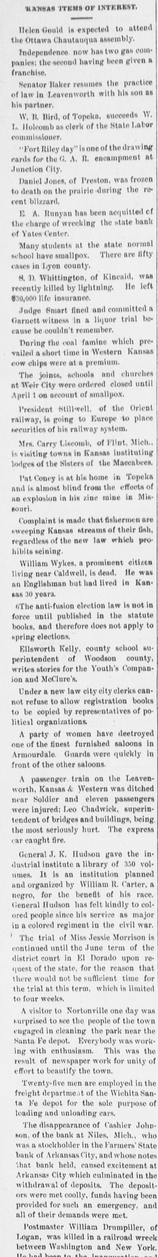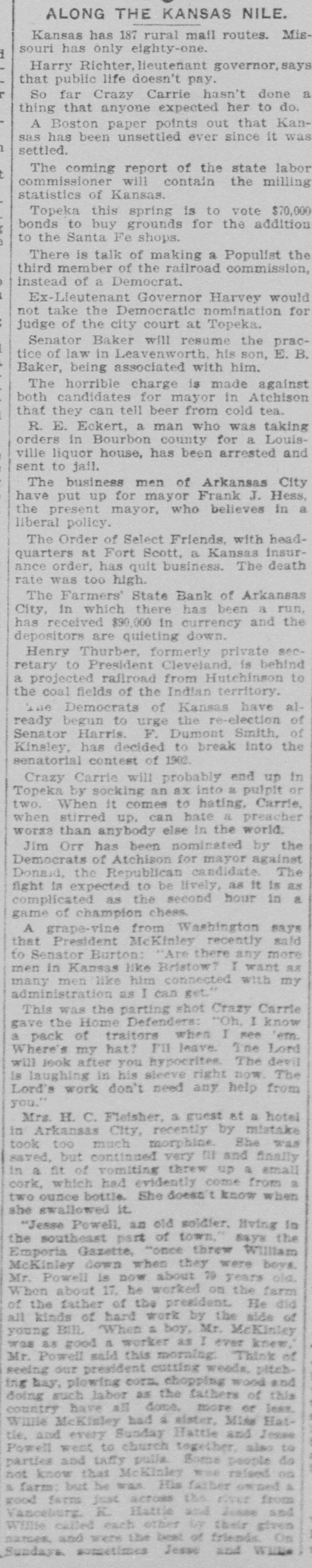 ALONG THE KANSAS NILE. Kansas has 187 rural mail routes. Missouri has only eighty-one. Harry Richter, lieutenant governor, says that public life doesn't pay. So far Crazy Carrie hasn't done a thing that anyone expected her to do. A Boston paper points out that Kansas has been unsettled ever since it was settled. The coming report of the state labor commissioner will contain the milling statistics of Kansas. Topeka this spring is to vote $70,000 bonds to buy grounds for the addition to the Santa Fe shops. There is talk of making a Populist the third member of the railroad commission, instead of a Democrat. Ex-Lieutenant Governor Harvey would not take the Democratic nomination for judge of the city court at Topeka. Senator Baker will resume the practice of law in Leavenworth, his son, E. B. Baker, being associated with him. The horrible charge is made against both candidates for mayor in Atchison that they can tell beer from cold tea. R. E. Eckert, a man who was taking orders in Bourbon county for a Louisville liquor house, has been arrested and sent to jail. The business men of Arkansas City have put up for mayor Frank J. Hess, the present mayor, who believes in a liberal policy. The Order of Select Friends, with headquarters at Fort Scott, a Kansas Insurance order, has quit business. The death rate was too high. The Farmers' State Bank of Arkansas City, in which there has been a run, has received $90,000 in currency and the depositors are quieting down. Henry Thurber, formerly private secretary to President Cleveland, is behind a projected railroad from Hutchinson to the coal fields of the Indian territory. The Democrats of Kansas have already begun to urge the re-election of Senator Harris. F. Dumont Smith, of Kinsley, has decided to break into the senatorial contest of 1902. Crazy Carrie will probably end up in Topeka by socking an ax into a pulpit or two. When it comes to hating, Carrie, when stirred up, can hate a preacher worse than anybody else in the world. Jim Orr has been nominated by the Democrats of Atchison for mayor against Donald, the Republican candidate. The fight is expected to be lively, as It is as complicated as the second hour in a game of champion chess. A grape-vine from Washington says that President McKinley recently said to Senator Burton: "Are there any more men in Kansas like Bristow? I want as many men like him connected with my administration as I can get." This was the parting shot Crazy Carrie gave the Home Defenders: "Oh, I know a pack of traitors when I see 'em. Where's my hat? F'll leave. The Lord will look after you hypocrites. The devil is laughing in his sleeve right now The Lord's work don't need any help from you." Mrs. H. C. Fleisher, a guest at a hotel in Arkansas City, recently by mistake took too much morphine. She was saved, but continued very fill and finally in a fit of vomiting threw up a small cork, which had evidently come from a two ounce bottle. She doesn't know when she swallowed it. "Jesse Powell, an old soldier. living In the southeast part of town," says the Emporia Gazette, "once threw William McKinley down when they were boys. Mr. Powell is now about 70 years old. When about 17, he worked on the farm of the father of the president. He did all kinds of hard work by the side of young BIL When = boy, Mr. McKinley was as good a worker as I ever knew, Mr. Powell said this morning. Think of seeing our president cutting weeds, pitchthe hay, plowing corn. chopping wood and doing such labor as the fathers of this country have all done, more or leas. Willie McKinley had a sister, Mins Hattie, and every Sunday Hattle and Jesse Powell went to church together. also to parties and taffy pulla Some people do not know that McKloley was relsed on & farm: but be was His father owned & good farm just actoss the river from Vanceburg, K. Hattle and Juste and Willie called each other W their given names, and were the best of friends. On Sundays. sometimes Jesse and William