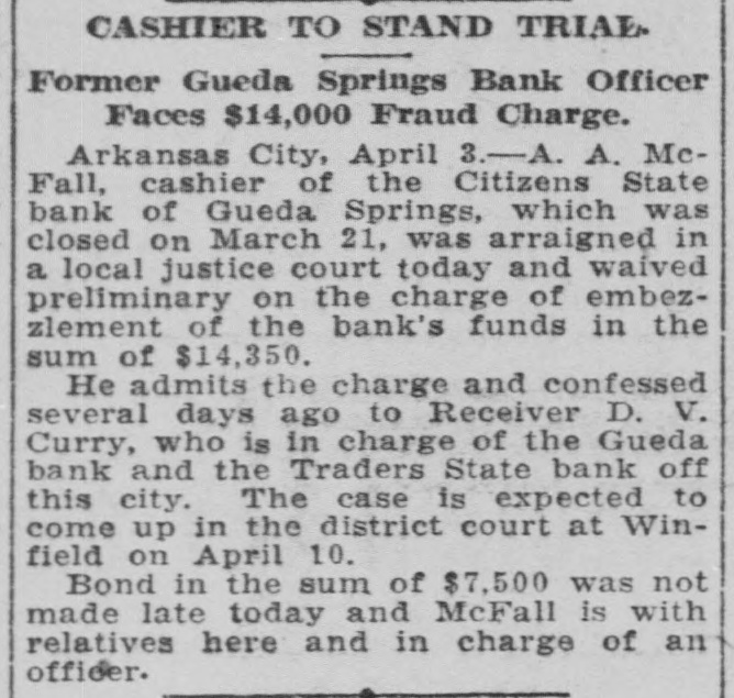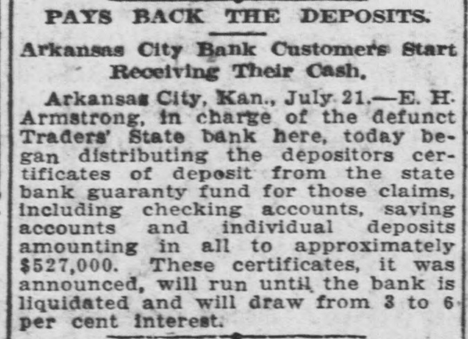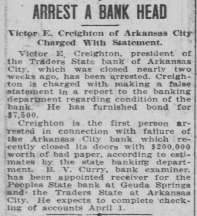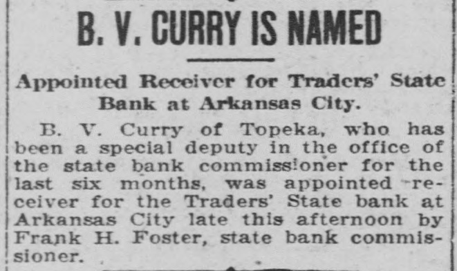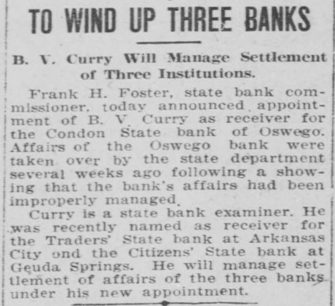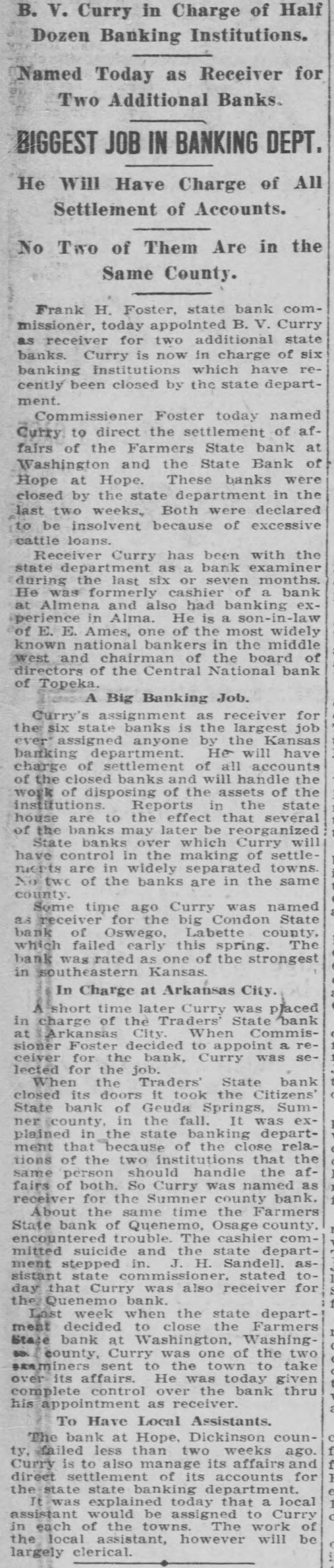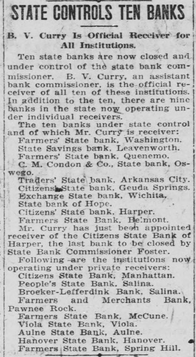 STATE CONTROLS TEN BANKS B. V. Curry Is Official Receiver for All Institutions. Ten state banks are now closed and under control of the state bank commissioner. B. V. Curry, an assistant bank commissioner, is the official receiver of all ten of these institutions. In addition to the ten, there are nine banks in the state now operating under individual receivers. The ten banks under state control and of which Mr. Curry is receiver: Farmers' State bank, Washington. State Savings bank, Leavenworth. Farmers' State bank, Quenemo. C. M. Condon & Co., State bank, Oswego. Traders' State bank, Arkansas City. Citizens State bank, Geuda Springs. Exchange State bank, Wichita, State bank of Hope. Citizens' State bank, Harper. Farmers State Bank, Belmont. Mr. Curry has just been appointed receiver of the Citizens State Bank of Harper, the last bank to be closed by State Bank Commissioner Foster. Following -are the institutions now operating under private receivers: Citizens State Bank, Manhattan. People's State Bank. Salina. Broeker-Lefferdink Bank, Salina. Farmers and Merchants Bank, Pawnee Rock. Farmers State Bank, McCune. Viola State Bank, Viola. Aulne State Bank, Aulne. Hanover State Bank, Hanover. Farmers State Bank, Spring Hill.