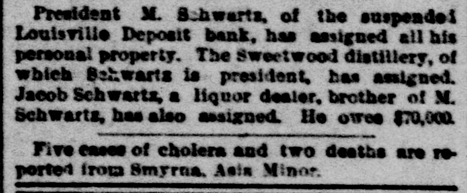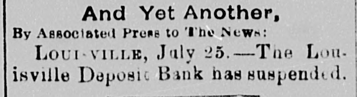 HEAVY. BANK FAILURES. The Trouble Getting Farther East Every Day. INDIANAPOLIS, Jvly 25.-The Bank of Commerce did not open its doora this morning. The Indianapolis National Bank also failed to open its doors. The Indianapolis National was considered one of the strongest banks in the city, and was designated as a depository of the United States. President Theodore Haughey consulted with other bankers last night, having previously secured $50,000 to tide him over yesterday. He said the failures at Louisville and New Albany had aggravated the local situation, and it was thought best to suspend. The Bank of Commerce has not been one of large deposits, and the failure will not have much effect locally. The indebtedness is said to be $150,000. At 11 d'clock a heavy run was being made on the Indiana National. The statement of the Indianapolis National Bank, July 12, showed resources of $2,313,154; liabilities due depositors, $1,194,586: United States deposits, $193,100; deposits of United States disbursing officers, $100,800; due other national banks, $140.403; due State banks. $73,570; notes and bills rediscounted, $51,137; bills payable, $58,060; capital stock. $300,000; surplus, $100,000; undivided profits, $44,448. While the Indianapolis National Bank was a United States depository but $3439 was tied up. Cashier Rexford was asked if the withdrawal of funds by country banks was not largely responsible for the suspension. "The stringency of the times." he replied, "has greatly reduced those balances. At this time of the year they have heretofore been large." The real trouble of the Bank of Commerce began at the failure of the Premier Steel Company. There have been drafts on the bank ever since then. The publication of Depauw's failure hurried things along. The failure of the Indianapolis National shut off their chances of getting help and the bank had to close. FINDLAY, Ohio. July 25.-The Farmers' National Bank, one of the popular financial institutions of the city, closed to-day because of the inability to realize upon its assets. The officers assert that they will be able to pay the depositors dollar for dollar and have a surplus when the affairs of the bank are settled up. Ever since the failure of ex-Secretary Charles Foster the bank has been drawn upon heavily, and was unable at the present time to meet the constant drain. There was no run on the other banks in the city. LOUISVILLE, Ky., July 25.-The Louisville Deposit Bank failed to open its doors to-day. The Merchants' National Bank has suspended. The Fourth National Bank has suspended. were runs on several other banks, but mostly There small, all stood the strain. The failure of the Merchants' National was caused by the withdrawals of country banks. The Deposit Bank was not a member of the Clearing-house, and none of the other banks would assist it. The National as a the caused by the Fourth panic failed failure considered result of others. of bad. None of the failures are The depositors of the two national will be in National has a chants' banks paid capital fnll. of The $500,000. Merthe Fourth National a capital of $300,000 and surplus of $25,000. The Deposit Bank has a capital of $300,000, surplus $16,000. The last statement of the Fourth National showed a paid in capital stock of $300,000, surplus fund of $37,000 and undivided profits of $27,956. The Merchants had a paid in capital of $500,000. a surplns of $100,000 and undivided profits of $21,384. The Deposit Bank statement showed a capital stock of $300,000 and undivided profits of $19,155. All the bank officials confidence that no one a express realize will on lose the cent if they get time to assets. Shortly after the assignment of the Louisville Deposit Bank President Schwartz filed an individual assigament of personal property to the same The assignee. all his Sweetwood assignment, Distillery Com- Mr. pany also made an Schwartz being president of that company also. No statement has yet been prepared.