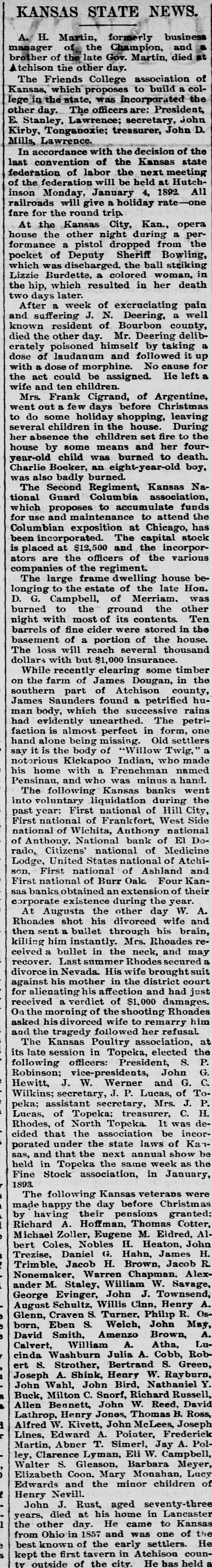 KANSAS STATE NEWS. A. H. Martin, formerly business manager of, the Champion, and a brother of the late Gov. Martin, died at Atchison the other day. The Friends College association of Kansas, which proposes to build a college in the state, was incorporated the other day. The officers are: President, E. Stanley, Lawrence; secretary, John Kirby, Tonganoxie; treasurer, John D. Mills, Lawrence. In accordance with the decision of the last convention of the Kansas state federation of labor the next meeting of the federation will be held at Hutchinson Monday, January 4, 1892. All railroads will give a holiday rate-one fare for the round trip. At the Kansas City, Kan., opera house the other night during a performance a pistol dropped from the pocket of Deputy Sheriff Bowling, which was discharged. the ball striking Lizzie Burdette, a colored woman, in the hip, which resulted in her death two days later. After a week of excruciating pain and suffering J. N. Deering, a well known resident of Bourbon county, died the other day. Mr. Deering deliberately poisoned himself by taking a dose of laudanum and followed it up with a dose of morphine. No cause for the act could be assigned. He left a wife and ten children. Mrs. Frank Cigrand, of Argentine, went out a few days before Christmas to do some holiday shopping, leaving several children in the house. During her absence the children set fire to the house by some means and her fouryear-old child was burned to death. Charlie Boeker, an eight-year-old boy, was also badly burned. The Second Regiment, Kansas National Guard Columbia association, which proposes to accumulate funds for use and maintenance to attend the Columbian exposition at Chicago, has been incorporated. The capital stock is placed at $12,500 and the incorporators are the officers of the various companies of the regiment. The large frame dwelling house belonging to the estate of the late Hon. D. G. Campbell, of Merriam. was burned to the ground the other night with most of its contents. Ten barrels of fine cider were stored in the basement of a portion of the house. The loss will reach several thousand dollars with but $1,000 insurance. While recently clearing some timber on the farm of James Dougan, in the southern part of Atchison county, James Saunders found a petrified human body, which the successive rains had evidently unearthed. The petrifaction is almost perfect in form, one hand alone being missing. Old settlers say it is the body of "Willow Twig," a notorious Kickapoo Indian, who made his home with a Frenchman named Pensinau, and who was minus a hand. The following Kansas banks went into voluntary liquidation during the past year: First national of Hill City, First national of Frankfort, West Side national of Wichita, Anthony national of Anthony. National bank of El Do. rado, Citizens' national of Medicine Lodge, United States national of Atchison, First national of Ashland and First national of Burr Oak. Four Kansas banks obtained an extension of their corporate existence during the year. At Augusta the other day W. A. Rhoades shot his divorced wife and then sent a bullet through his brain, killing him instantly. Mrs. Rhoades received a bullet in the neck, and may recover. Last summer Rhodes secured a divorce in Nevada. His wife brought suit against his mother in the district court for alienating his affection and had just received a verdict of $1,000 damages On the morning of the shooting Rhoades asked his divorced wife to remarry him and the tragedy followed her refusal The Kansas Poultry association, at its late session in Topeka, elected the following officers: President, S. P. Robinson; vice-presidents, John G Hewitt, J. W. Werner and G. C Wilkins; secretary, J. P. Lucas, of To peka; assistant secretary, Mrs. J. P Lucas, of Topeka; treasurer, C. H Rhodes, of North Topeka. It was de cided that the association be incor porated under the state laws of Kan sas, and that the next annual show be held in Topeka the same week as the Fine Stock association, in January 1893. The following Kansas veterans were made happy the day before Christmas by having their pensions granted Richard A. Hoffman, Thomas Cotter Michael Zoller, Eugene M. Eldred, Al bert Coles, Nobles H. Heaton, John Trezise, Daniel G. Hahn, James H Trimble, Jacob H. Brown, Jacob R