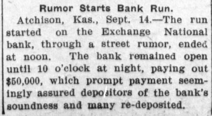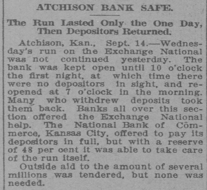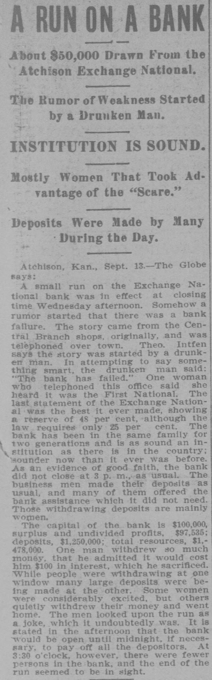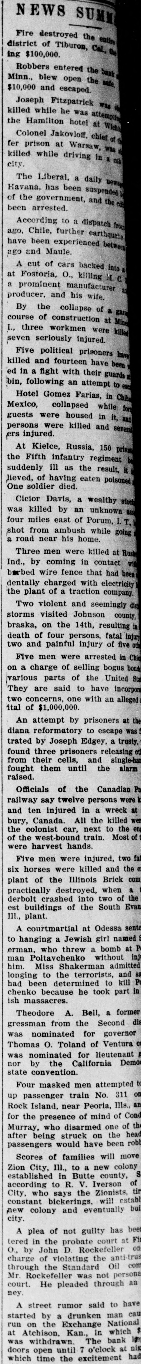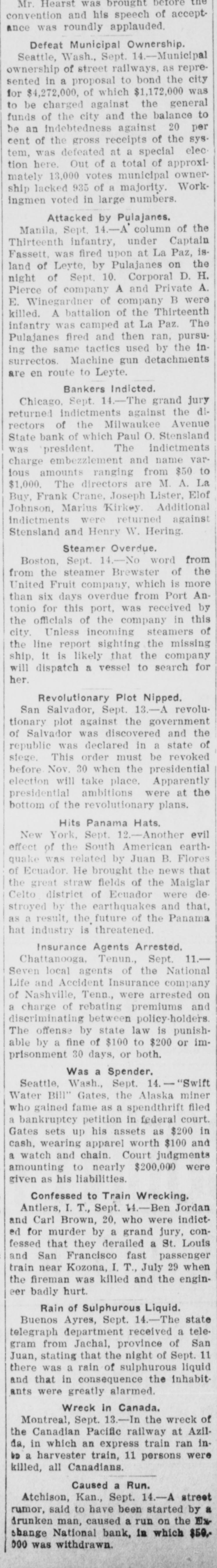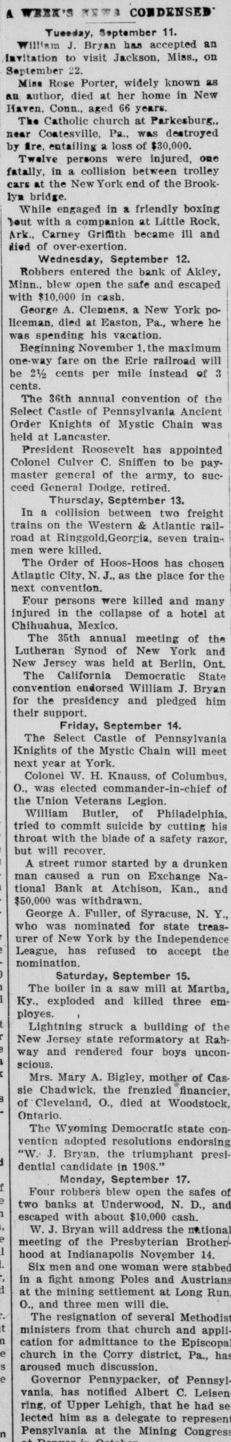 A WEEK'S NEWS CONDENSED Tuesday, September 11. William J. Bryan has accepted an invitation to visit Jackson, Miss., on September 22. Miss Rose Porter, widely known as an author, died at her home in New Haven, Conn., aged 66 years. The Catholic church at Parkesburg,. near Coatesville, Pa., was destroyed by fre, entailing 2 loss of $30,000. Twelve persons were injured, one fatally, in a collision between trolley cars at the New York end of the Brooklyn bridge. While engaged in a friendly boxing Yout with a companion at Little Rock, Ark., Carney Griffth became ill and died of over-exertion. Wednesday, September 12. Robbers entered the bank of Akley, Minn., blew open the safe and escaped with $10,000 in cash. George A. Clemens, a New York policeman, died at Easton, Pa., where he was spending his vacation. Beginning November 1, the maximum one-way fare on the Erie railroad will be 2 1/2 cents per mile instead of 3 cents. The 36th annual convention of the Select Castle of Pennsylvania Ancient Order Knights of Mystic Chain was held at Lancaster. President Roosevelt has appointed Colonel Culver C. Sniffen to be paymaster general of the army, to succeed General Dodge, retired. Thursday, September 13. In a collision between two freight trains on the Western & Atlantic railroad at Ringgold,Georgia seven trainmen were killed. The Order of Hoos-Hoos has chosen Atlantic City, N.J., as the place for the next convention. Four persons were killed and many injured in the collapse of a hotel at Chihuahua, Mexico. The 35th annual meeting of the Lutheran Synod of New York and New Jersey was held at Berlin, Ont. The California Democratic State convention endorsed William J. Bryan for the presidency and pledged him their support. Friday, September 14. The Select Castle of Pennsylvania Knights of the Mystic Chain will meet next year at York. Colonel W. H. Knauss, of Columbus, O., was elected commander-in-chief of the Union Veterans Legion. William Butler, of Philadelphia, tried to commit suicide by cutting his throat with the blade of a safety razor, but will recover. A street rumor started by a drunken man caused a run on Exchange National Bank at Atchison, Kan., and $50,000 was withdrawn. George A. Fuller, of Syracuse, N. Y., who was nominated for state treasurer of New York by the Independence League, has refused to accept the nomination. Saturday, September 15. The boiler in a saw mill at Martba, Ky., exploded and killed three employes. t Lightning struck a building of the New Jersey state reformatory at Rahe way and rendered four boys uncona scious. < Mrs. Mary A. Bigley, mother of Cassie Chadwick, the frenzied financier, S of Cleveland, O., died at Woodstock, Ontario. The Wyoming Democratic state convention adopted resolutions endorsing "W. J. Bryan, the triumphant presid dential candidate in 1908." Monday, September 17. f Four robbers blew open the safes of e two banks at Underwood, N. D., and h escaped with about $10,000 cash. , W. J. Bryan will address the national e meeting of the Presbyterian Brother1 hood at Indianapolis November 14. 1. Six men and one woman were stabbed ; in a fight among Poles and Austrians d at the mining settlement at Long Run O., and three men will die. : The resignation of several Methodist t and n ministers for from admittance that church application to the e has church in the Corry district, Episcopal Pa., S aroused much discussion. e Governor Pennypacker, of Pennsylvania, has notified Albert C. Leisen ring, of Upper Lehigh, that he had se lected him as a delegate to represent n Pensylvania at the Mining Congress -