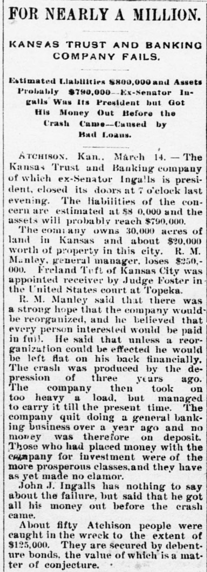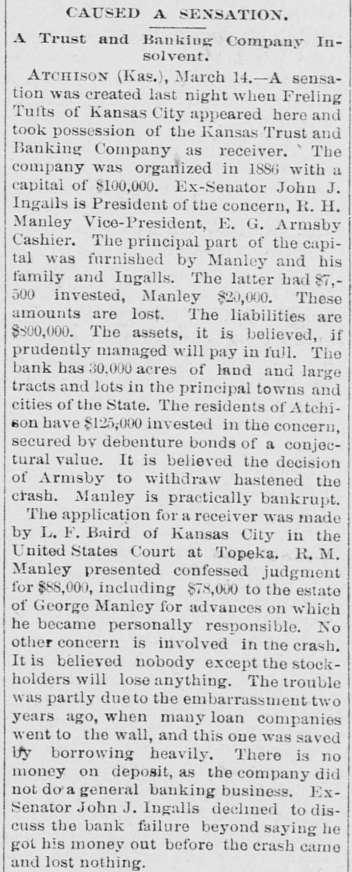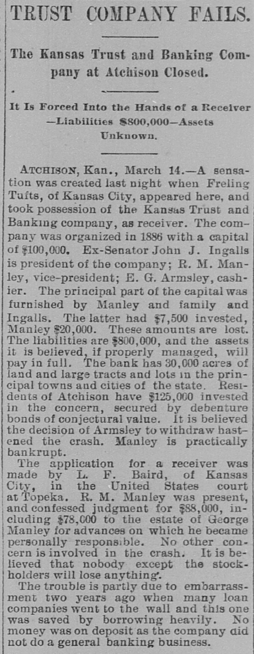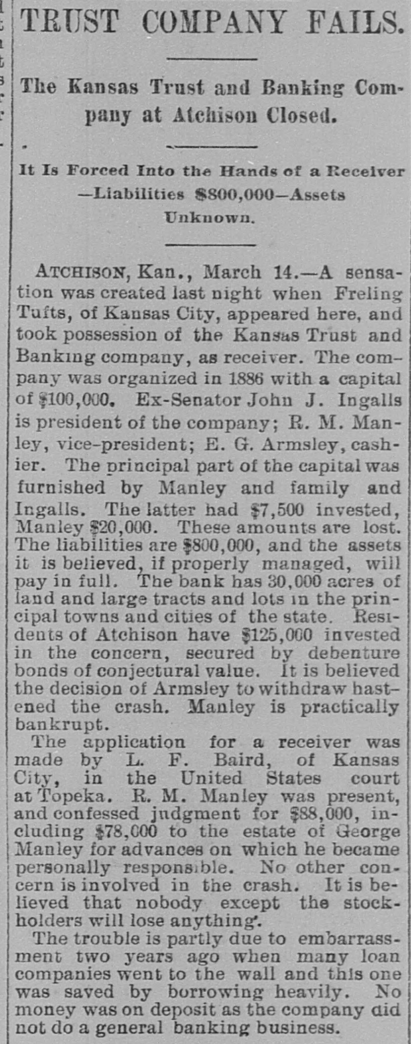 WITHOUT ANY WARNING Doors of the Kansas Trust and Banking House Closed. DEPOSITS TAKEN RIGHT ALONG The Company Owns Thirty Thousand Acres of Land in Kansas and $20,000 Worth of Real Estate-Ex-Senator Ingalls, the President of the Concern a Heavy Loser-Scores of Local Depositors. ATCHISON, Kan., March 14.-The closing of the doors of the Kansas Trust and Banking Company, of this city at 7 o'clock last night has caused a great sensation. An application for the appointment of a receiver was filed in the United States District Court at Topeka by the eastern creditors of the institution. Judge Foster named Freeland Tufts of Kansas City, as receiver and he at once came here and took charge of affairs of the concern. The liabilities of the bank are estimated at $800,000 and the assets, so the officers claim will fall not far short of that amount. The company owns 30,000 acres of land in Kansas and $20,000 worth of real estate in this city. Ex-Senator John J. Ingalls, the president of the concern, loses about $10,000. R. M. Manley, vice president and general managerloses about $250,000 of his own and property belonging to the estate of his father, George Manley. In the United States Court yesterday Manley confessed judgment for the es. tate of his father to the amount of $78,000. A confession of judgment was also made by him as manager to the company to the amount of $10,000. Every dollar that the Manleys possessed has been lost in the crash. E. G. Armsby, cashier of the company, loses $20,000. The company was organized in 1886, with a capital of $100,000. The principal part, if not all, the capital stock was subscribed by ex-Senator Ingalls, A. R. Manley and the Manley estate, and E. G. Armbys. The statement of the Manley party is that the receivership is in the interests of the holders of the obligations of the company and will result in a liquidation of all claims. The company became slightly embarrassed over two years ago, at the time when the best land companies were compelled to succumb to the general depression and was obliged to borrow largely to meet immediate de mands. The concern loaned considerable money three years ago, on Kansas property, at boom figures and was compelled to fore close in many instances without any chance of realizing as much as had been advanced on the same. The bank was also trustee for large amounts of money that belonged on property in Central and Western Kansas. Eastern creditors who were given first mortgages are amply recured. There are many local depositors who have from $500 to $1,000 on deposit in the bank. It is said that the bank continued to receive deposits up to the hour of closing and there was not the slightest intimation that the crash was to come so soon.
