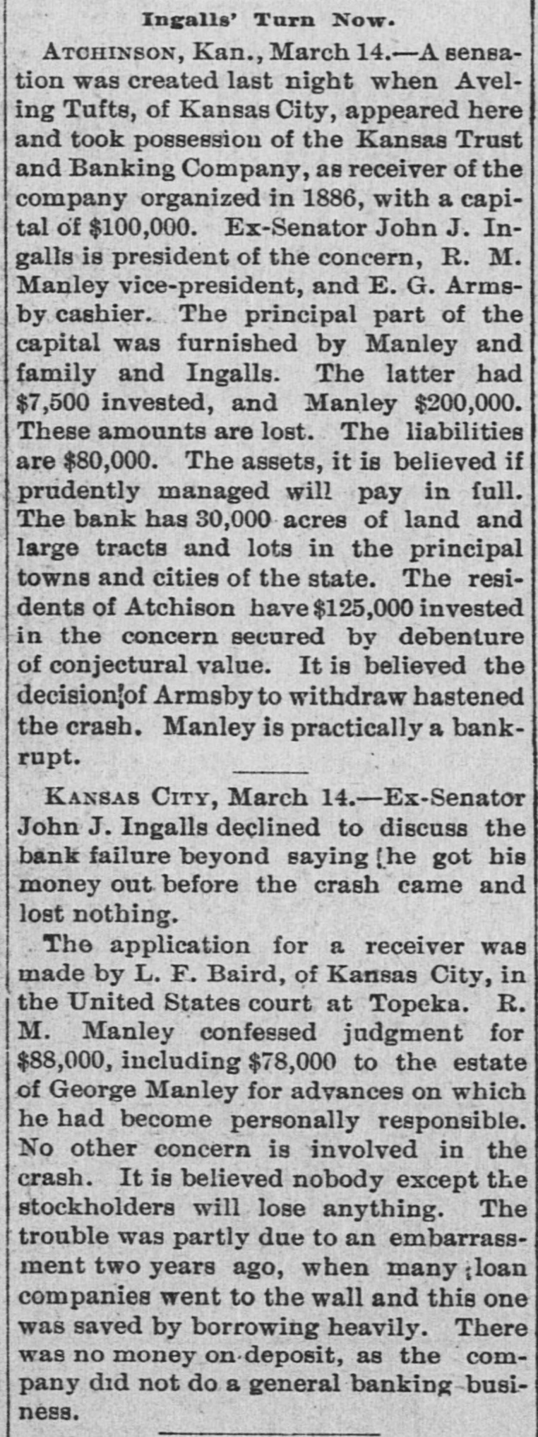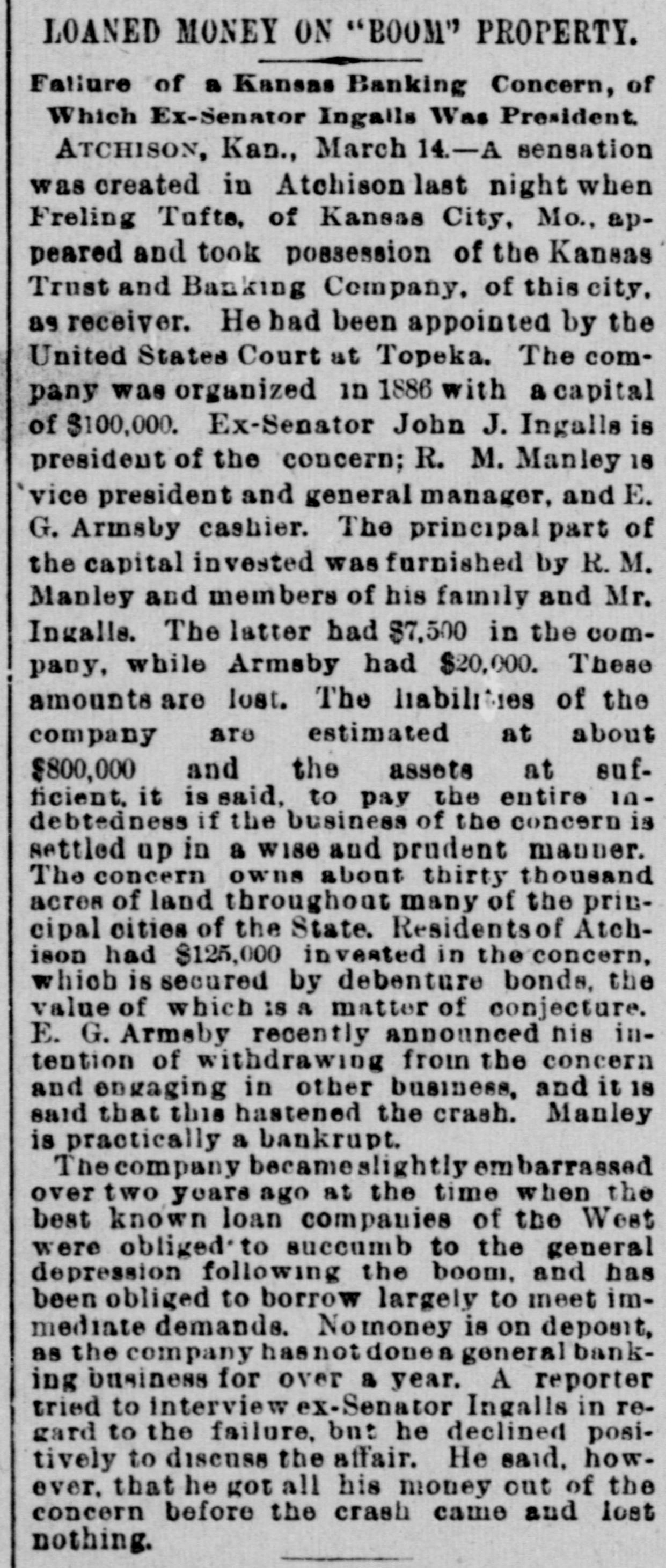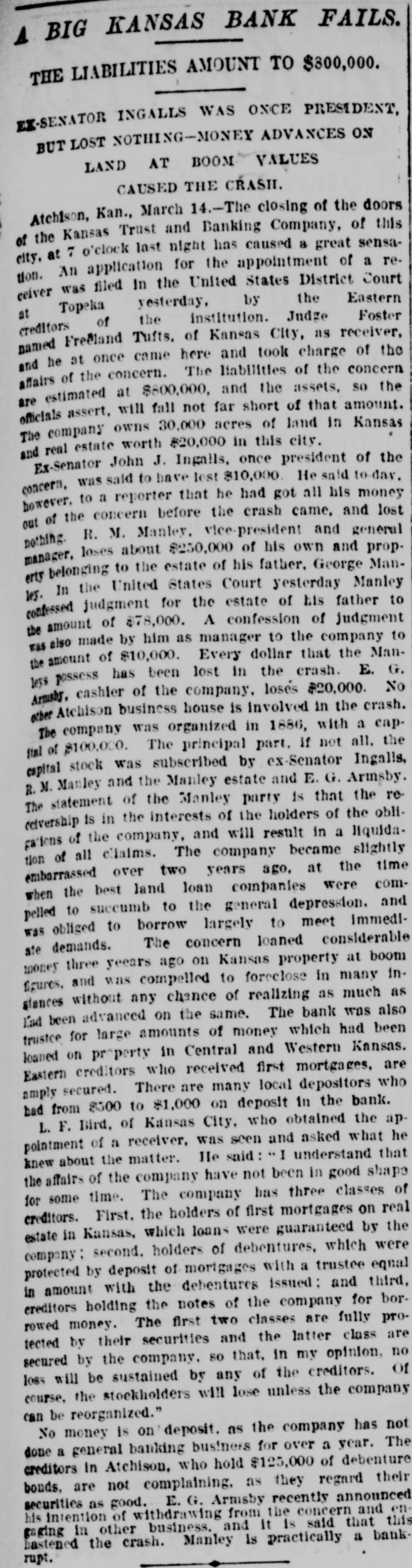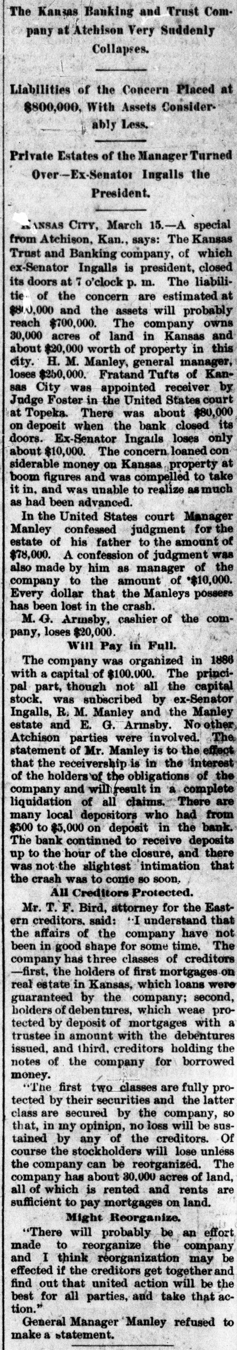 WITHOUT ANY WARNING Doors of the Kansas Trust and Banking House Closed. DEPOSITS TAKEN RIGHT ALONG The Company Owns Thirty Thousand Acres of Land in Kansas and $20,000 Worth of Real Estate-Ex-Senator Ingalls, the President of the Concern a Heavy Loser-Scores of Local Depositors. ATCHISON, Kan., March 14.-The closing of the doors of the Kansas Trust and Banking Company, of this city at 7 o'clock last night has caused a great sensation. An application for the appointment of a receiver was filed in the United States District Court at Topeka by the eastern creditors of the institution. Judge Foster named Freeland Tufts of Kansas City, as receiver and he at once came here and took charge of affairs of the concern. The liabilities of the bank are estimated at $800,000 and the assets, so the officers claim will fall not far short of that amount. The company owns 30,000 acres of land in Kansas and $20,000 worth of real estate in this city. Ex-Senator John J. Ingalls, the president of the concern, loses about $10,000. R. M. Manley, vice president and general managerloses about $250,000 of his own and property belonging to the estate of his father, George Manley. In the United States Court yesterday Manley confessed judgment for the es. tate of his father to the amount of $78,000. A confession of judgment was also made by him as manager to the company to the amount of $10,000. Every dollar that the Manleys possessed has been lost in the crash. E. G. Armsby, cashier of the company, loses $20,000. The company was organized in 1886, with a capital of $100,000. The principal part, if not all, the capital stock was subscribed by ex-Senator Ingalls, A. R. Manley and the Manley estate, and E. G. Armbys. The statement of the Manley party is that the receivership is in the interests of the holders of the obligations of the company and will result in a liquidation of all claims. The company became slightly embarrassed over two years ago, at the time when the best land companies were compelled to succumb to the general depression and was obliged to borrow largely to meet immediate de mands. The concern loaned considerable money three years ago, on Kansas property, at boom figures and was compelled to fore close in many instances without any chance of realizing as much as had been advanced on the same. The bank was also trustee for large amounts of money that belonged on property in Central and Western Kansas. Eastern creditors who were given first mortgages are amply recured. There are many local depositors who have from $500 to $1,000 on deposit in the bank. It is said that the bank continued to receive deposits up to the hour of closing and there was not the slightest intimation that the crash was to come so soon.