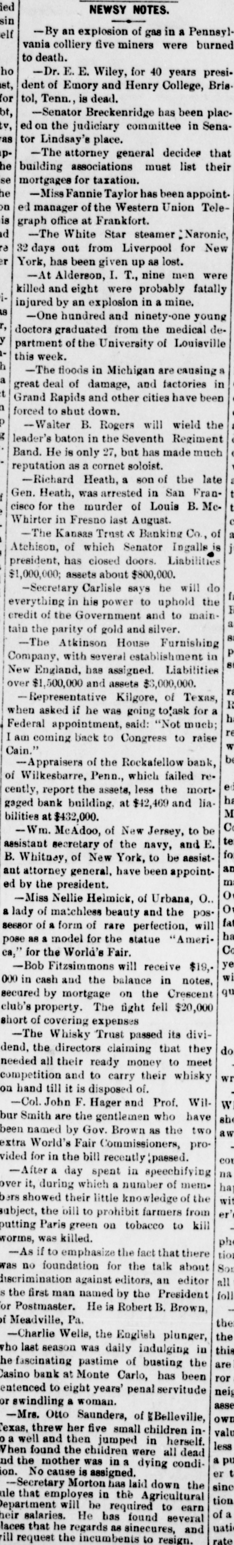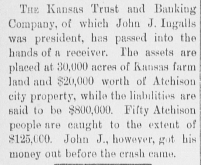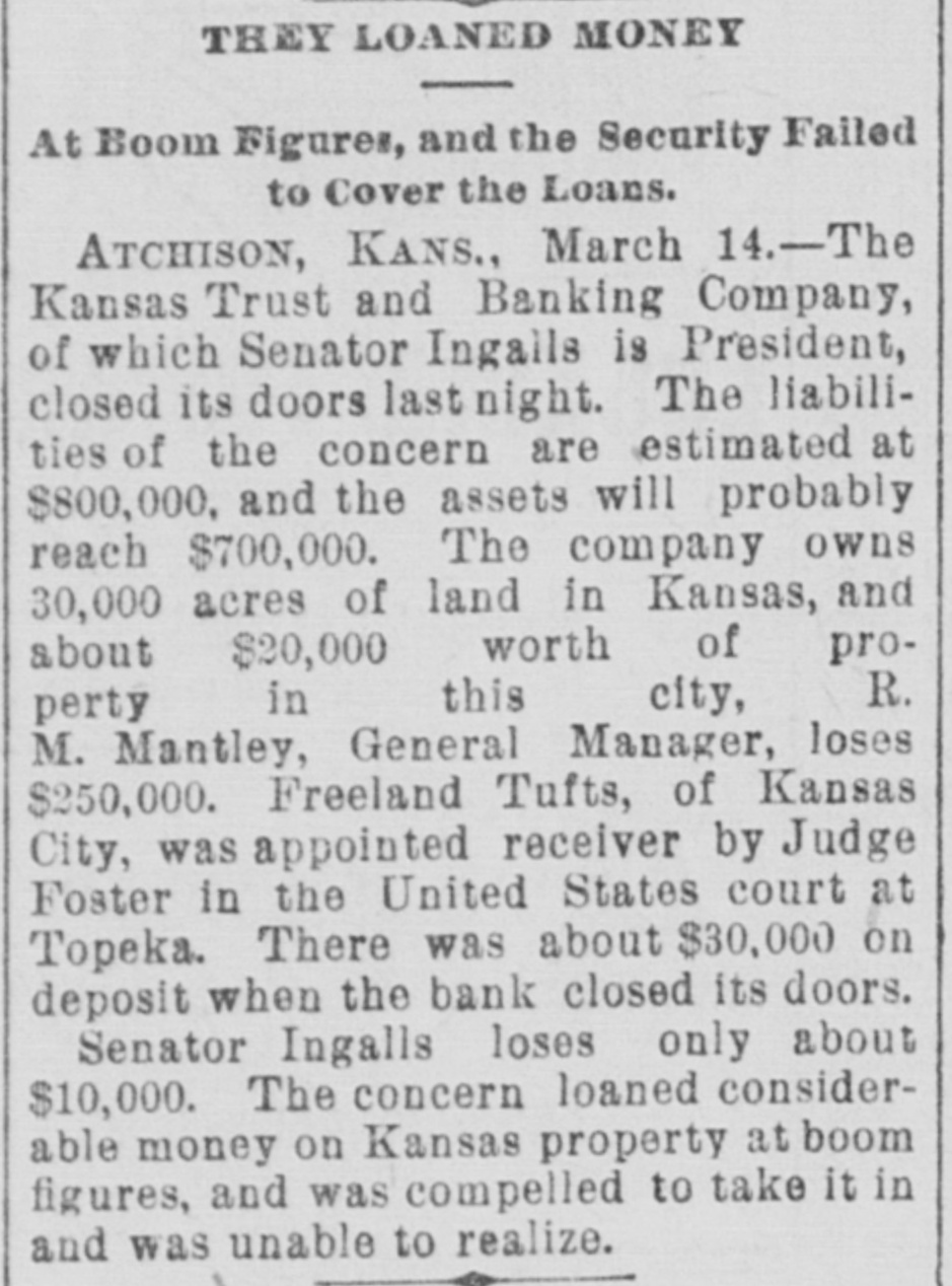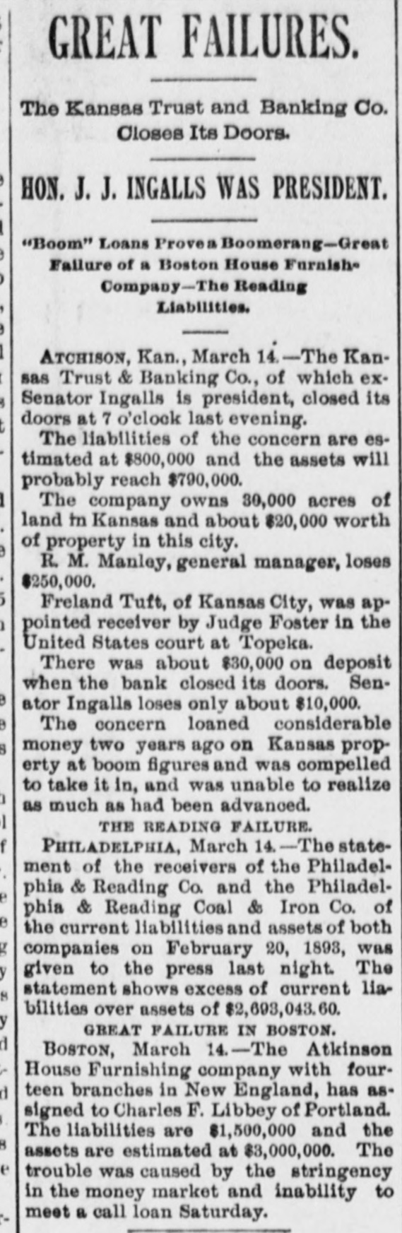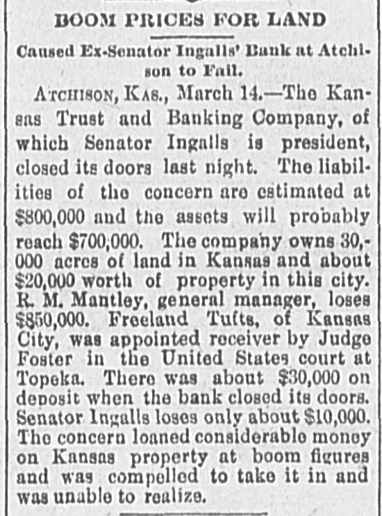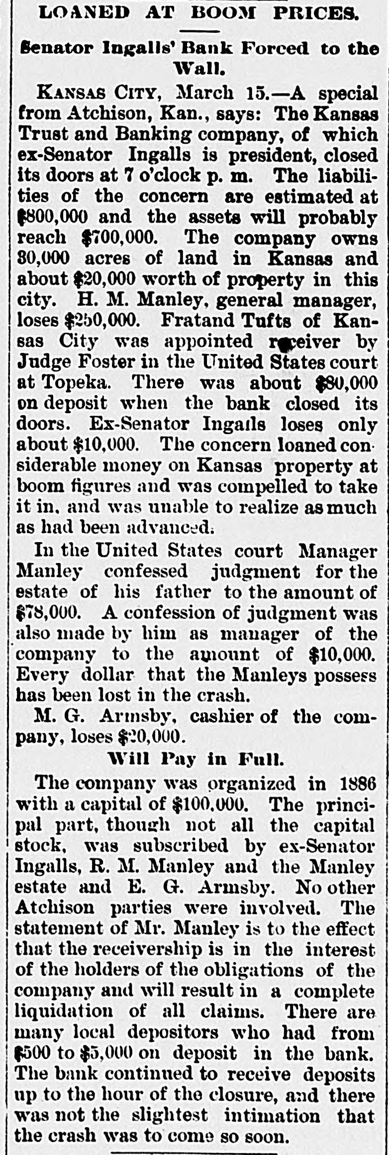 WITHOUT ANY WARNING Doors of the Kansas Trust and Banking House Closed. DEPOSITS TAKEN RIGHT ALONG The Company Owns Thirty Thousand Acres of Land in Kansas and $20,000 Worth of Real Estate-Ex-Senator Ingalls, the President of the Concern a Heavy Loser-Scores of Local Depositors. ATCHISON, Kan., March 14.-The closing of the doors of the Kansas Trust and Banking Company, of this city at 7 o'clock last night has caused a great sensation. An application for the appointment of a receiver was filed in the United States District Court at Topeka by the eastern creditors of the institution. Judge Foster named Freeland Tufts of Kansas City, as receiver and he at once came here and took charge of affairs of the concern. The liabilities of the bank are estimated at $800,000 and the assets, so the officers claim will fall not far short of that amount. The company owns 30,000 acres of land in Kansas and $20,000 worth of real estate in this city. Ex-Senator John J. Ingalls, the president of the concern, loses about $10,000. R. M. Manley, vice president and general managerloses about $250,000 of his own and property belonging to the estate of his father, George Manley. In the United States Court yesterday Manley confessed judgment for the es. tate of his father to the amount of $78,000. A confession of judgment was also made by him as manager to the company to the amount of $10,000. Every dollar that the Manleys possessed has been lost in the crash. E. G. Armsby, cashier of the company, loses $20,000. The company was organized in 1886, with a capital of $100,000. The principal part, if not all, the capital stock was subscribed by ex-Senator Ingalls, A. R. Manley and the Manley estate, and E. G. Armbys. The statement of the Manley party is that the receivership is in the interests of the holders of the obligations of the company and will result in a liquidation of all claims. The company became slightly embarrassed over two years ago, at the time when the best land companies were compelled to succumb to the general depression and was obliged to borrow largely to meet immediate de mands. The concern loaned considerable money three years ago, on Kansas property, at boom figures and was compelled to fore close in many instances without any chance of realizing as much as had been advanced on the same. The bank was also trustee for large amounts of money that belonged on property in Central and Western Kansas. Eastern creditors who were given first mortgages are amply recured. There are many local depositors who have from $500 to $1,000 on deposit in the bank. It is said that the bank continued to receive deposits up to the hour of closing and there was not the slightest intimation that the crash was to come so soon.