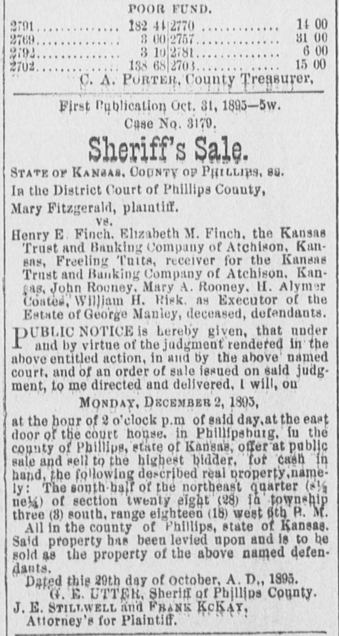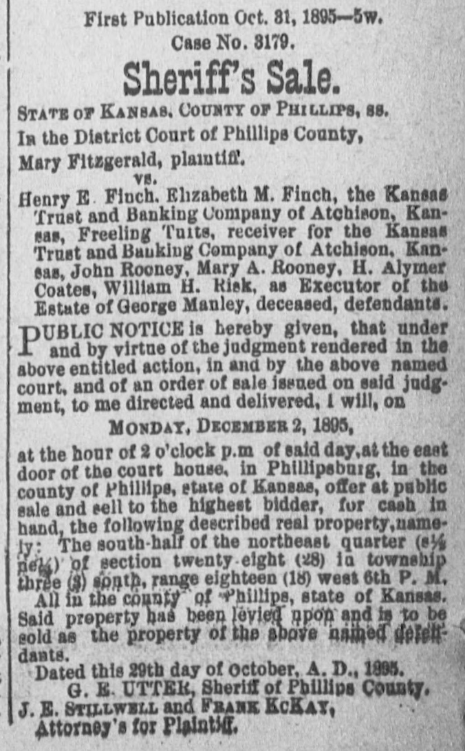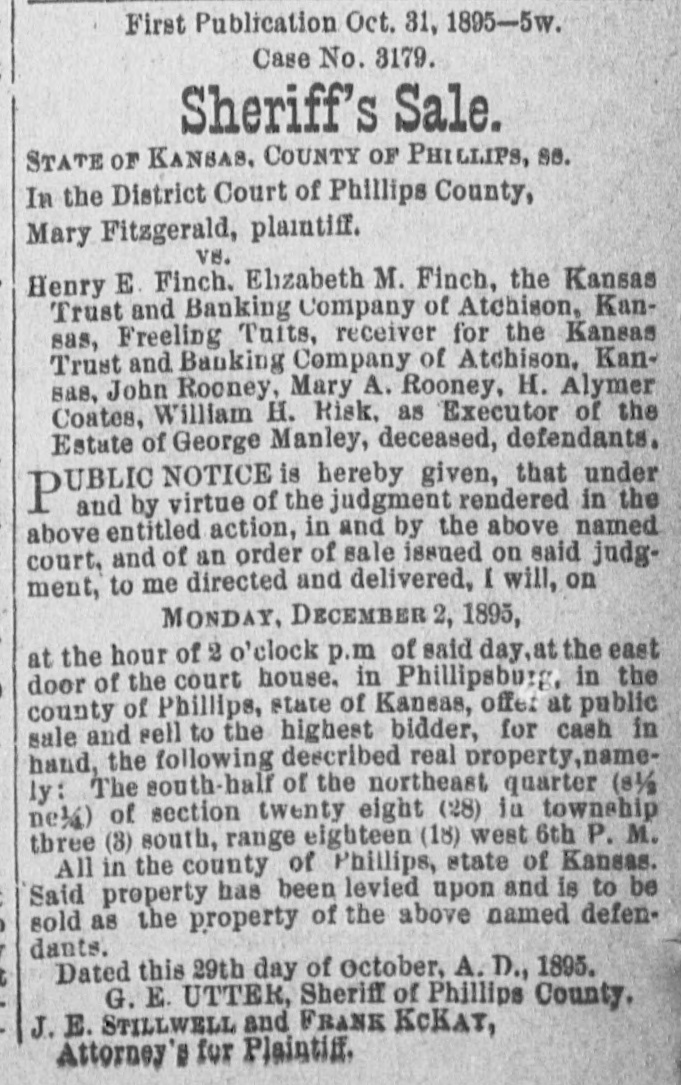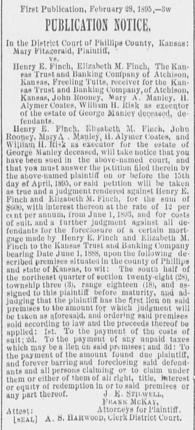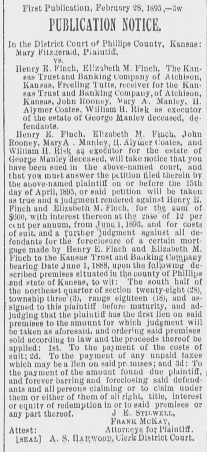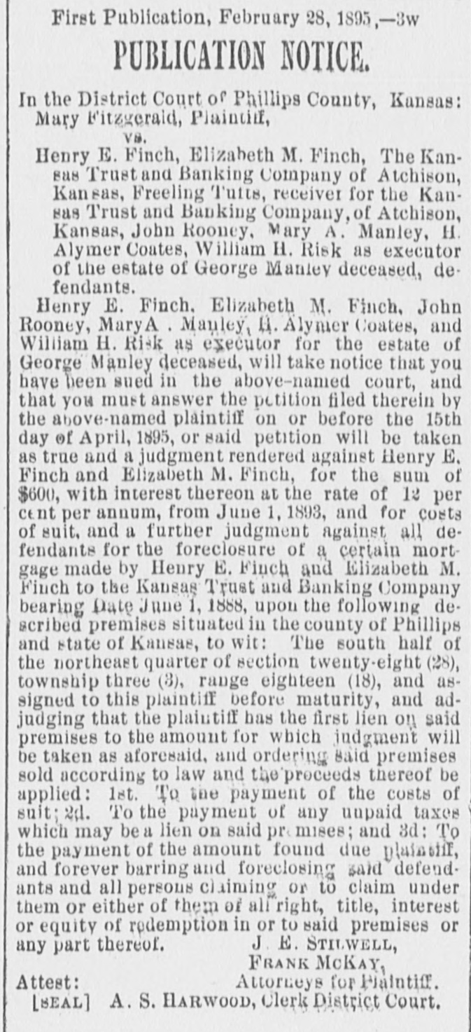 First Publication, February 28, 1895,-3w # PUBLICATION NOTICE. In the District Court of Phillips County, Kansas: Mary Fitzgerald, Plaintiff, vs. Henry E. Finch, Elizabeth M. Finch, The Kan- sas Trust and Banking Company of Atchison, Kansas, Freeling Tutts, receiver for the Kan- sas Trust and Banking Company, of Atchison, Kansas, John Rooney, Mary A. Manley, H. Alymer Coates, William H. Risk as executor of the estate of George Manley deceased, de- fendants. Henry E. Finch, Elizabeth M. Finch, John Rooney, Mary A. Manley, H. Alymer Coates, and William H. Risk as executor for the estate of George Manley deceased, will take notice that you have been sued in the above-named court, and that you must answer the petition filed therein by the above-named plaintiff on or before the 15th day of April, 1895, or said petition will be taken as true and a judgment rendered against Henry E, Finch and Elizabeth M. Finch, for the sum of $600, with interest thereon at the rate of 12 per cent per annum, from June 1, 1893, and for costs of suit, and a further judgment against all de- fendants for the foreclosure of a certain mort- gage made by Henry E. Finch and Elizabeth M. Finch to the Kansas Trust and Banking Company bearing Date June 1, 1888, upon the following de- scribed premises situated in the county of Phillips and state of Kansas, to wit: The south half of the northeast quarter of section twenty-eight (28), township three (3), range eighteen (18), and as- signed to this plaintiff before maturity, and ad- judging that the plaintiff has the first lien on said premises to the amount for which judgment will be taken as aforesaid, and ordering said premises sold according to law and the proceeds thereof be applied: Ist. To the payment of the costs of suit; 2d. To the payment of any unpaid taxes which may be a lien on said premises; and 3d: To the payment of the amount found due plaintiff, and forever barring and foreclosing said defend- ants and all persons claiming or to claim under them or either of them of all right, title, interest or equity of redemption in or to said premises or any part thereof. J. E. STILWELL, FRANK MCKAY, Attorneys for Plaintiff. Attest: [SEAL] A. S. HARWOOD, Clerk District Court.
