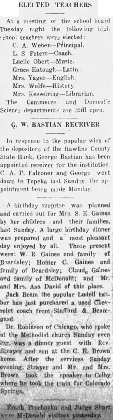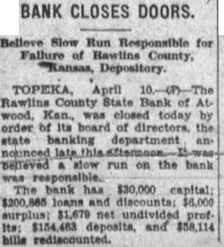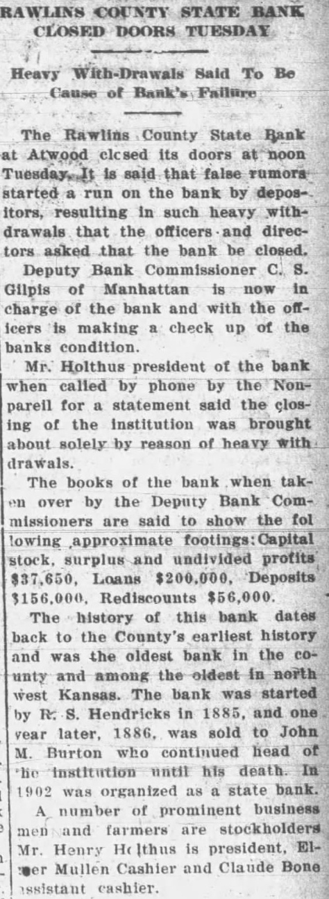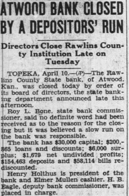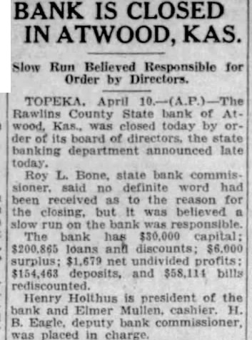 BANK IS CLOSED IN ATWOOD, KAS. Slow Run Believed Responsible for Order by Directors. TOPEKA. April 10.-(A.P.)-The Rawlins County State bank of Atwood, Kas., was closed today by order of its board of directors. the state banking department announced late today. Roy L. Bone, state bank commissioner. said no definite word had been received as to the reason for the closing, but It was believed a slow run on the bank was responsible. The bank has $30,000 capital: $200,865 loans and discounts: $6,000 surplus; $1,679 net undivided profits: $154,463 deposits, and $58,114 bills Henry Holthus is president of the bank and Elmer Mullen. cashier H. B. Eagle, deputy bank commissioner, was placed in charge.