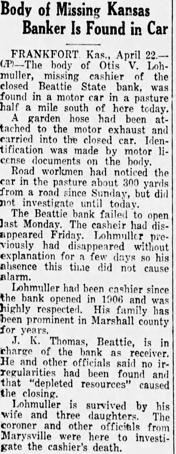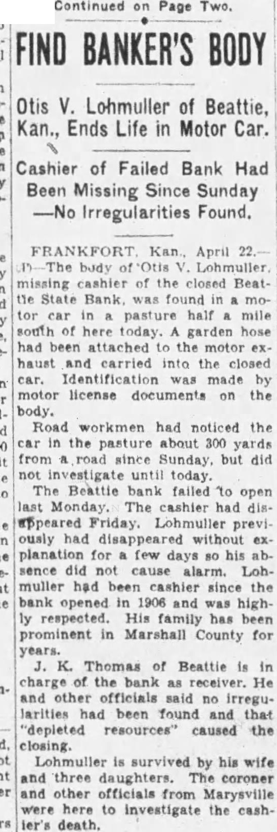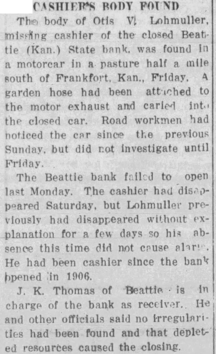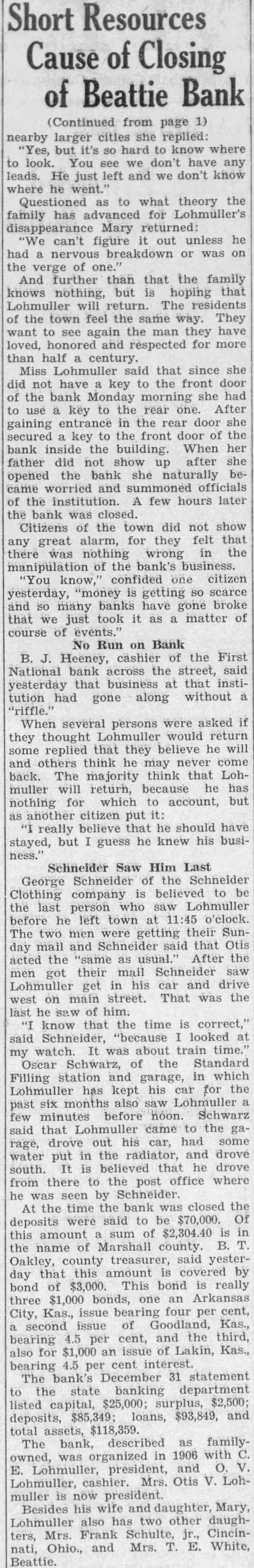 Schnelder Saw Him Last George Schneider of the Schneider Clothing company is believed to be the last person who saw Lohmuller before he left town at 11:45 o'clock. The two men were getting their Sunday mail and Schneider said that Otis acted the "same usual. After the men got their mail Schneider saw Lohmuller get in his and drive main street. That was the west on last he saw of him. know that time is correct," said Schneider, "because looked my watch. was about train time." Oscar Schwarz, of the Standard Filling station and garage, in which Lohmuller has kept his car for the past six also Lohmuller few before noon. Schwarz said that Lohmuller came to the drove out his had rage, car, in the radiator, and drove water put south. believed that he drove from there to the post office where he was seen by Schneider At the time the bank was closed the were said to be $70,000. Of deposits this amount of the name of Marshall county. Oakley, county treasurer, said yesterday that this amount covered by of $3,000. This bond really bond $1,000 bonds, one an Arkansas three City, Kas., issue bearing four per cent, issue of Kas., second 4.5 cent, and the third, bearing per also for $1,000 an issue of Lakin, Kas., bearing 4.5 per cent interest. The bank's December 31 statement the state banking department listed $25,000; surplus, $2,500; capital, $85,349; loans, $93,849, and deposits, total assets, $118,359. The bank, described as familyorganized in 1906 with owned, was Lohmuller, president, and Lohmuller, cashier. Mrs. Otis Lohmuller is now Besides his wife and daughter, Mary, Lohmuller also has two other daughMrs. Frank Schulte, Cincinters, and Mrs. E. White, nati, Ohio., Beattie.