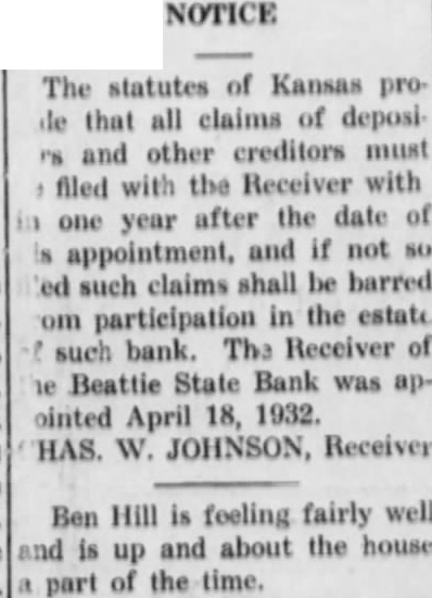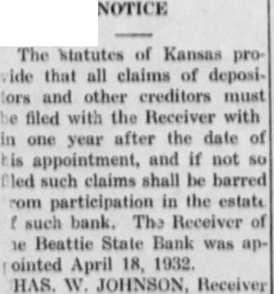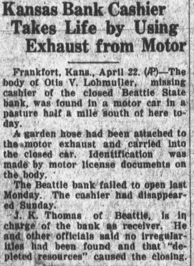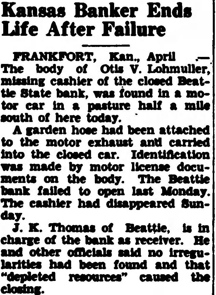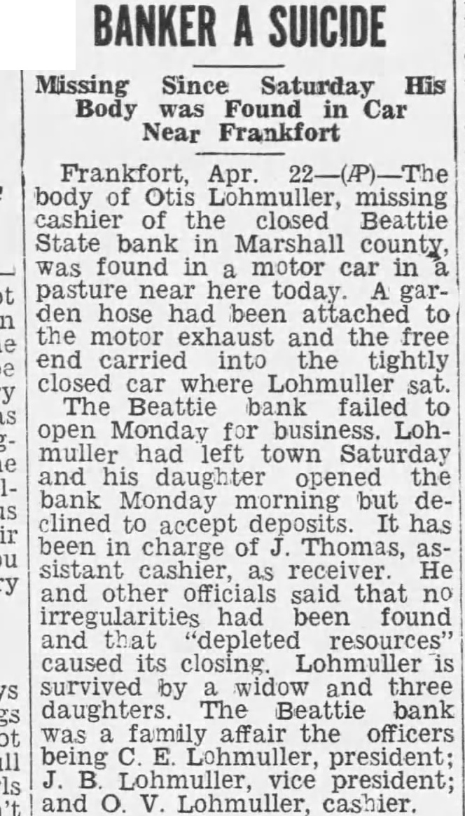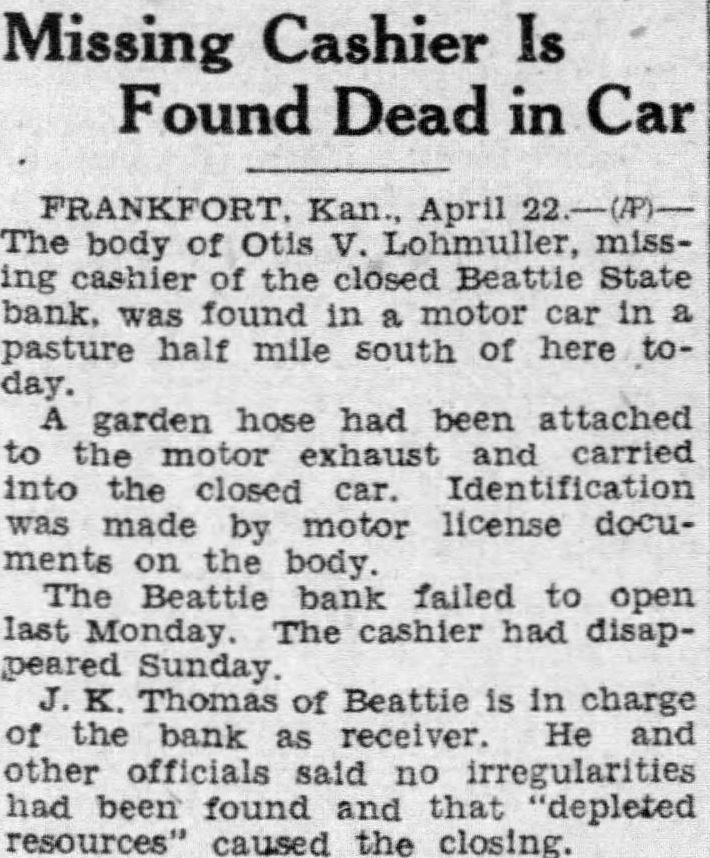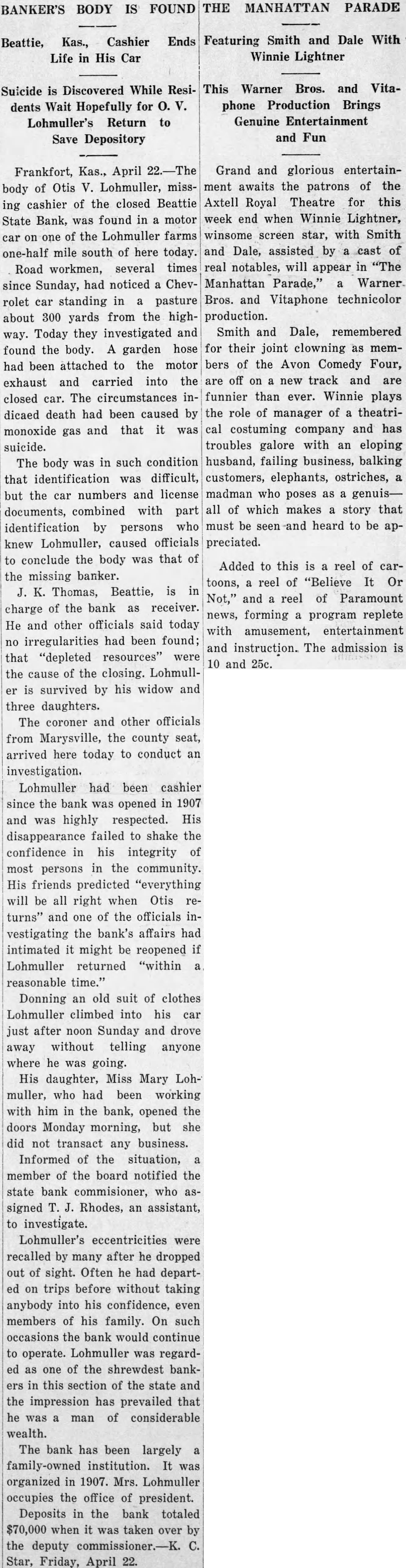 Schnelder Saw Him Last George Schneider of the Schneider Clothing company is believed to be the last person who saw Lohmuller before he left town at 11:45 o'clock. The two men were getting their Sunday mail and Schneider said that Otis acted the "same usual. After the men got their mail Schneider saw Lohmuller get in his and drive main street. That was the west on last he saw of him. know that time is correct," said Schneider, "because looked my watch. was about train time." Oscar Schwarz, of the Standard Filling station and garage, in which Lohmuller has kept his car for the past six also Lohmuller few before noon. Schwarz said that Lohmuller came to the drove out his had rage, car, in the radiator, and drove water put south. believed that he drove from there to the post office where he was seen by Schneider At the time the bank was closed the were said to be $70,000. Of deposits this amount of the name of Marshall county. Oakley, county treasurer, said yesterday that this amount covered by of $3,000. This bond really bond $1,000 bonds, one an Arkansas three City, Kas., issue bearing four per cent, issue of Kas., second 4.5 cent, and the third, bearing per also for $1,000 an issue of Lakin, Kas., bearing 4.5 per cent interest. The bank's December 31 statement the state banking department listed $25,000; surplus, $2,500; capital, $85,349; loans, $93,849, and deposits, total assets, $118,359. The bank, described as familyorganized in 1906 with owned, was Lohmuller, president, and Lohmuller, cashier. Mrs. Otis Lohmuller is now Besides his wife and daughter, Mary, Lohmuller also has two other daughMrs. Frank Schulte, Cincinters, and Mrs. E. White, nati, Ohio., Beattie.