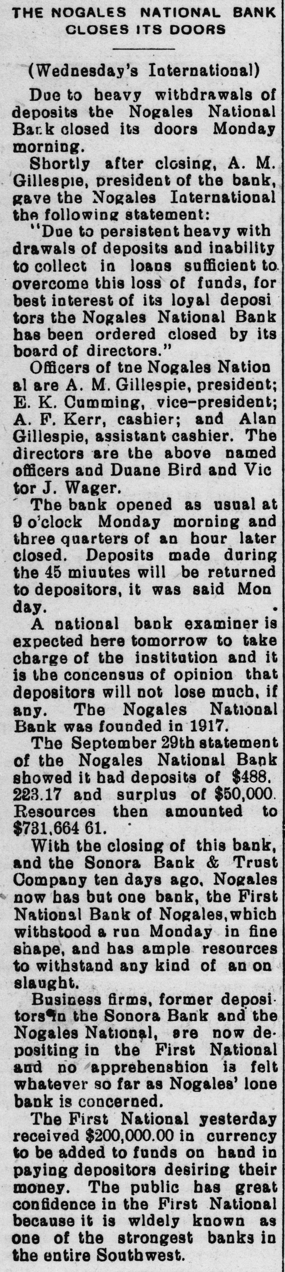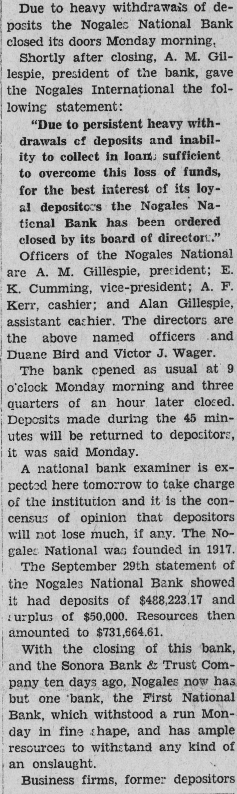 Due to heavy withdrawais of deposits the Nogales National Bank closed its doors Monday morning. Shortly after closing, A. M. Gillespie, president of the bank, gave the Nogales International the following statement: "Due to persistent heavy withdrawals of deposits and inability to collect in loans sufficient to overcome this loss of funds, for the best interest of its loyal depositors the Nogales National Bank has been ordered closed by its board of directors." Officers of the Nogales National are A. M. Gillespie, president; E. K. Cumming, vice-president; A. F. Kerr, cashier; and Alan Gillespie, assistant cashier. The directors are the above named officers and Duane Bird and Victor J. Wager. The bank opened as usual at 9 o'clock Monday morning and three quarters of an hour later closed. Deposits made during the 45 minutes will be returned to depositors, it was said Monday. A national bank examiner is expected here tomorrow to take charge of the institution and it is the concensus of opinion that depositors will not lose much, if any. The Nogales National was founded in 1917. The September 29th statement of the Nogales National Bank showed it had deposits of $488,223.17 and surplus of $50,000. Resources then amounted to $731,664.61. With the closing of this bank, and the Sonora Bank & Trust Company ten days ago, Nogales now has but one bank, the First National Bank, which withstood a run Monday in fine shape, and has ample resources to withstand any kind of an onslaught. Business firms, former depositors