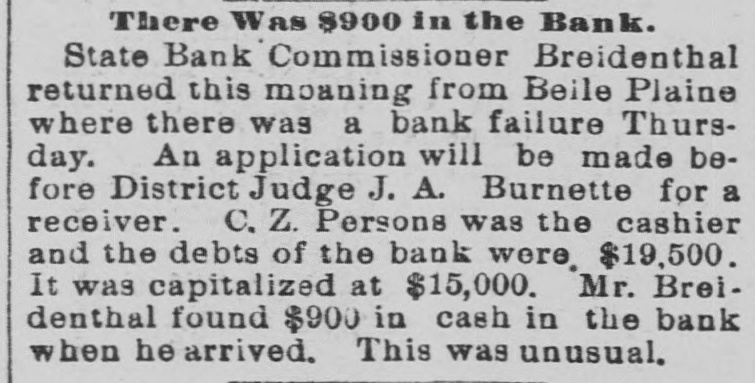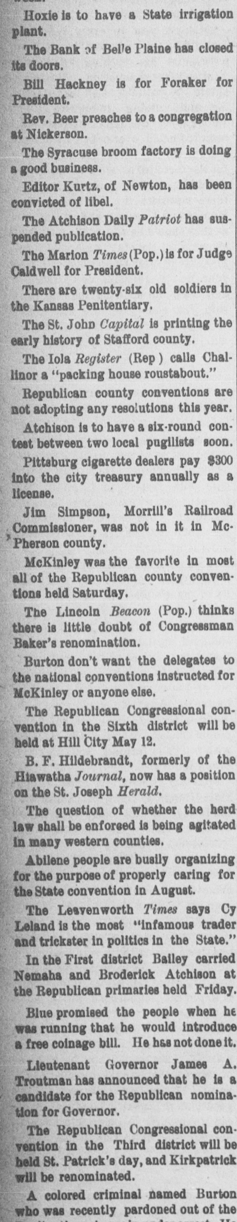 Hoxie is to have 8 State irrigation plant. The Bank of Belle Plaine has closed its doors. Bill Hackney is for Foraker for President. Rev. Beer preaches to a congregation at Nickerson. The Syracuse broom factory is doing a good business. Editor Kurtz, of Newton, has been convicted of libel. The Atchison Daily Patriot has suspended publication. The Marion Times (Pop.) is for Judge Caldwell for President. There are twenty-six old soldiers in the Kansas Penitentiary. The St. John Capital is printing the early history of Stafford county. The Iola Register (Rep) calls Challinor a "packing house roustabout." Republican county conventions are not adopting any resolutions this year. Atchison is to have a six-round contest between two local pugilists soon. Pittsburg cigarette dealers pay $300 into the city treasury annually as a license. Jim Simpson, Morrill's Railroad Commissioner, was not in it in Mc, Pherson county. McKinley was the favorite in most all of the Republican county conventions held Saturday. The Lincoln Beacon (Pop.) thinks there is little doubt of Congressman Baker's renomination. Burton don't want the delegates to the national conventions instructed for McKinley or anyone else. The Republican Congressional convention in the Sixth district will be held at Hill City May 12. B. F. Hildebrandt, formerly of the Hiawatha Journal, now has a position on the St. Joseph Herald. The question of whether the herd law shall be enforced is being agitated in many western counties. Abilene people are busily organizing for the purpose of properly caring for the State convention in August. The Lesvenworth Times says Cy Leland is the most "infamous trader and trickster in politics in the State." In the First district Bailey carried Nemaha and Broderick Atchison at the Republican primaries held Friday. Blue promised the people when he was running that he would introduce a free coinage bill. He has not done it. Lieutenant Governor James A. Troutman has announced that he is a candidate for the Republican nomination for Governor. The Republican Congressional convention in the Third district will be held St. Patrick's day, and Kirkpatrick will be renominated. A colored criminal named Burton who was recently pardoned out of the U.