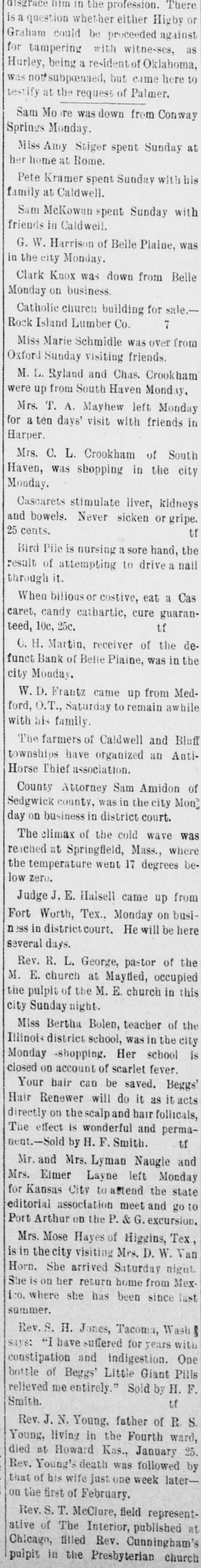 disgrace him in the profession. There is a question whether either Higby or Graham could be proceeded against for tampering with witnesses, as Hurley, being a resident of Oklahoma, was not subprenaed, but came here to testify at the request of Palmer. Sam Mo re was down from Conway Springs Monday. Miss Amy Stiger spent Sunday at her home at Rome. Pete Kramer spent Sunday with his family at Caldwell. Sam McKowan spent Sunday with friends in Caldwell. G. W. Harrison of Belle Plaine, was in the city Monday. Clark Knox was down from Belle Monday on business. Catholic church building for sale.7 Rock Island Lumber Co. Miss Marie Schmidle was over from Oxford Sunday visiting friends. M. L. Ryland and Chas. Crookham were up from South Haven Monday, Mrs. T. A. Mayhew left Monday for a ten days' visit with friends in Harper. Mrs. C. L. Crookham of South Haven, was shopping in the city Monday. Cascarets stimulate liver, kidneys and bowels. Never sicken or gripe. 25 cents. tf Bird Pile is nursing a sore hand, the result of attempting to drive a nail through it. When bilious or costive, eat a Cas caret, candy cathartic, cure guarantf teed, 10c, 25c. C. H. Martin, receiver of the defunct Bank of Belle Plaine, was in the city Monday. W. D. Frautz came up from Medford, O.T., Saturday to remain awhile with his family. The farmers of Caldwell and Bluff townships have organized an AntiHorse Thief association. County Attorney Sam Amidon of Sedgwick county, was in the city Mon® day on business in district court. The climax of the cold wave was reached at Springfield, Mass., where the temperature went 17 degrees below zero. Judge J. E. Halsell came up from Fort Worth, Tex., Monday on business in district court. He will be here several days. Rev. R. L. George, pastor of the M. E. church at Mayfled, occupied the pulpit of the M. E. church in this city Sunday night. Miss Bertha Bolen, teacher of the Illinois district school, was in the city is Monday shopping. Her school closed on account of scarlet fever. Your hair can be saved. Beggs' Hair Renewer will do it as it acts directly on the scalp and hair follicals, The effect is wonderful and permatf nent.-Sold by H. F. Smith. Mr.and Mrs. Lyman Naugle and Mrs. Elmer Layne left Monday for Kansas City to autend the state editorial association meet and go to Port Arthur on the P. & G. excursion. Mrs. Mose Hayes of Higgins, Tex, is in the city visiting Mrs. D. W. Van Horn. She arrived Saturday night She is on her return home from Mexico. where she has been since last summer. Rev. S. H. Jones, Tacoma, Wash says: [ have suffered for years with constipation and indigestion. One bottle of Beggs' Little Giant Pills relieved me entirely." Sold by H. F. Smith. tf Rev. J. N. Young, father of R. S. Young, living in the Fourth ward, died at Howard Kas., January 25. Rev. Young's death was followed by that of his wife just one week lateron the first of February. Rev. S.T. McClure, field representative of The Interior, published at Chicago, filled Rev. Cunningham's pulpit in the Presbyterian church