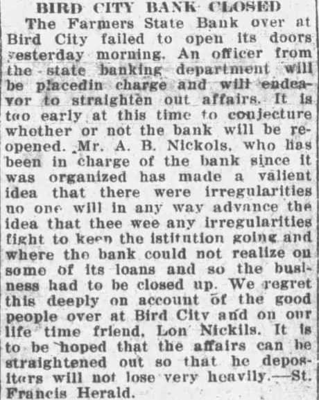 BIRD CITY BANK CLOSED The Farmers State Bank over at Bird City failed to open its doors vesterday morning. An officer from the state banking department will be placedin charge and will endeavor to straighten out affairs. It is too early at this time to conjecture whother or not the bank will be reopened. Mr. A. B. Nickols. who has been in charge of the bank since it was organized has made a valient idea that there were irregularities no one will in any way advance the idea that thee wee any irregularities fight to keep the istitution going and where the bank could not realize on some of its loans and so the business had to be closed up. We regret this deeply on account of the good people over at Bird City and on our life time friend. Lon Nickils. It is to be hoped that the affairs can be straightened out 80 that he depositers will not lose very heavily Francis Herald.