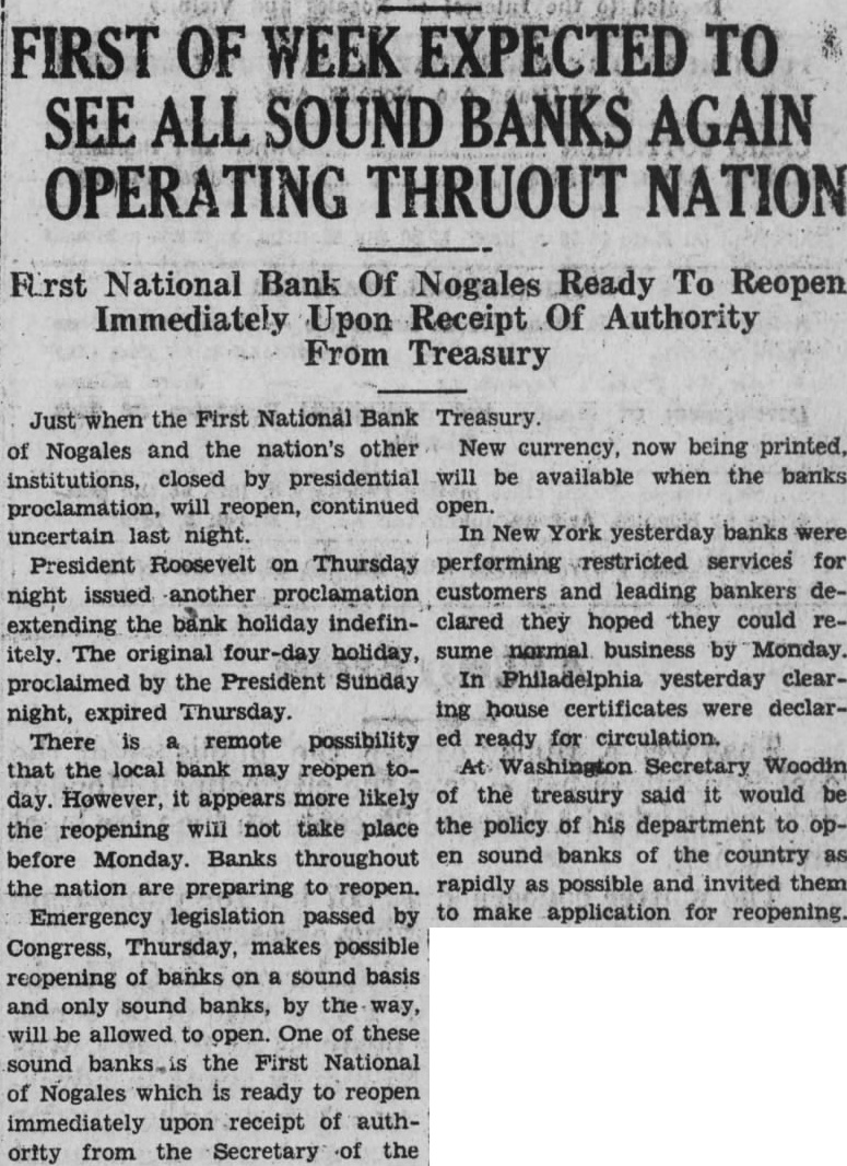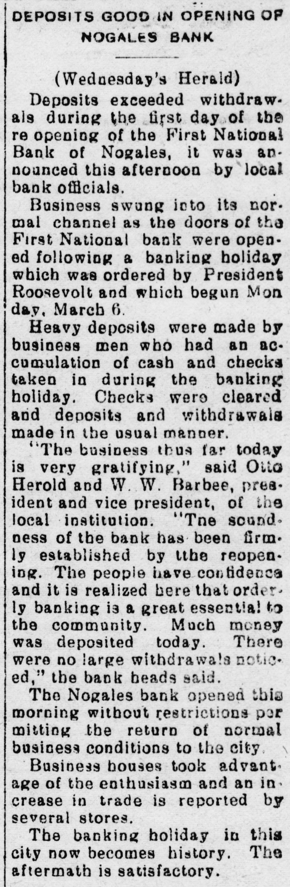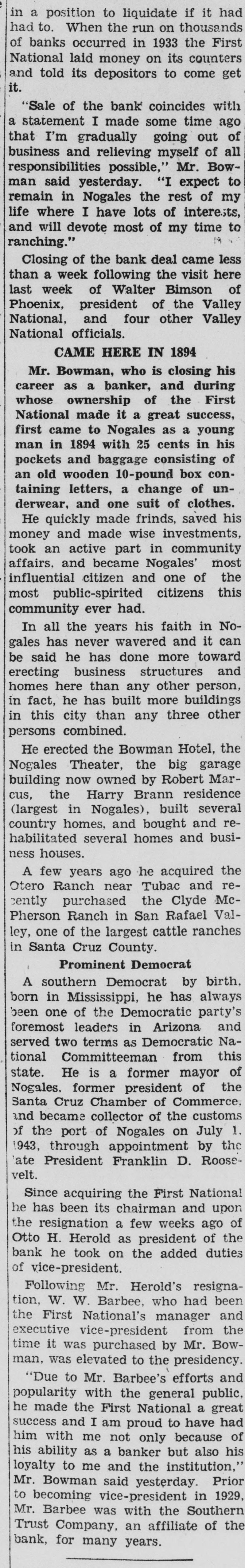 in a position to liquidate if it had had to. When the run on thousands of banks occurred in 1933 the First National laid money on its counters and told its depositors to come get it. "Sale of the bank coincides with a statement I made some time ago that I'm gradually going out of business and relieving myself of all responsibilities possible," Mr. Bowman said yesterday. "I expect to remain in Nogales the rest of my life where I have lots of interests, and will devote most of my time to ranching." Closing of the bank deal came less than a week following the visit here last week of Walter Bimson of Phoenix, president of the Valley National, and four other Valley National officials. CAME HERE IN 1894 Mr. Bowman, who is closing his career as a banker, and during whose ownership of the First National made it a great success, first came to Nogales as a young man in 1894 with 25 cents in his pockets and baggage consisting of an old wooden 10-pound box containing letters, a change of underwear, and one suit of clothes. He quickly made frinds, saved his money and made wise investments, took an active part in community affairs, and became Nogales' most influential citizen and one of the most public-spirited citizens this community ever had. In all the years his faith in Nogales has never wavered and it can be said he has done more toward erecting business structures and homes here than any other person, in fact, he has built more buildings in this city than any three other persons combined. He erected the Bowman Hotel, the Nogales Theater, the big garage building now owned by Robert Marcus, the Harry Brann residence in (largest Nogales), built several country homes, and bought and rehabilitated several homes and business houses. A few years ago he acquired the Otero Ranch near Tubac and recently purchased the Clyde McPherson Ranch in San Rafael Valley, one of the largest cattle ranches in Santa Cruz County. Prominent Democrat A southern Democrat by birth. born in Mississippi, he has always been one of the Democratic party's foremost leaders in Arizona and served two terms as Democratic National Committeeman from this state. He is a former mayor of Nogales, former president of the Santa Cruz Chamber of Commerce, and became collector of the customs of the port of Nogales on July 1. 1943, through appointment by the 'ate President Franklin D. Roosevelt. Since acquiring the First National he has been its chairman and upon the resignation a few weeks ago of Otto H. Herold as president of the bank he took on the added duties of vice-president. Following Mr. Herold's resignation, W. W. Barbee, who had been the First National's manager and executive vice-president from the time it was purchased by Mr. Bowman, was elevated to the presidency. "Due to Mr. Barbee's efforts and popularity with the general public, he made the First National a great success and I am proud to have had him with me not only because of his ability as a banker but also his loyalty to me and the institution," Mr. Bowman said yesterday. Prior to becoming vice-president in 1929, Mr. Barbee was with the Southern Trust Company, an affiliate of the bank, for many years.