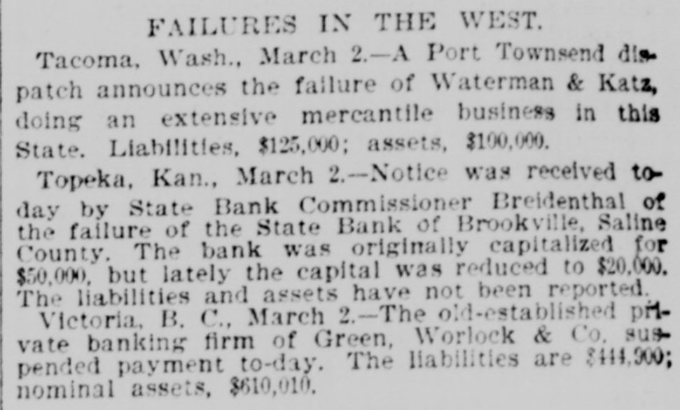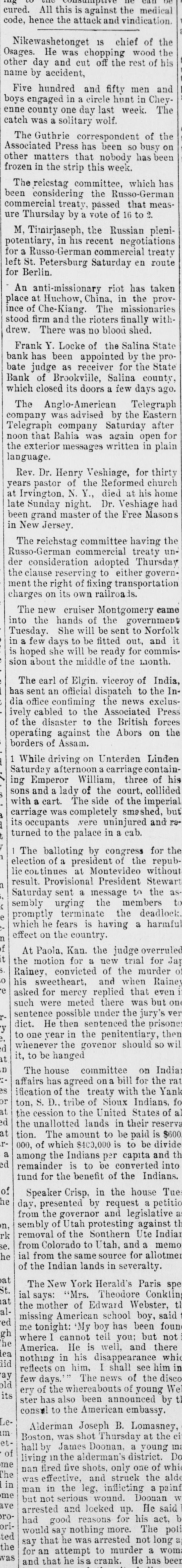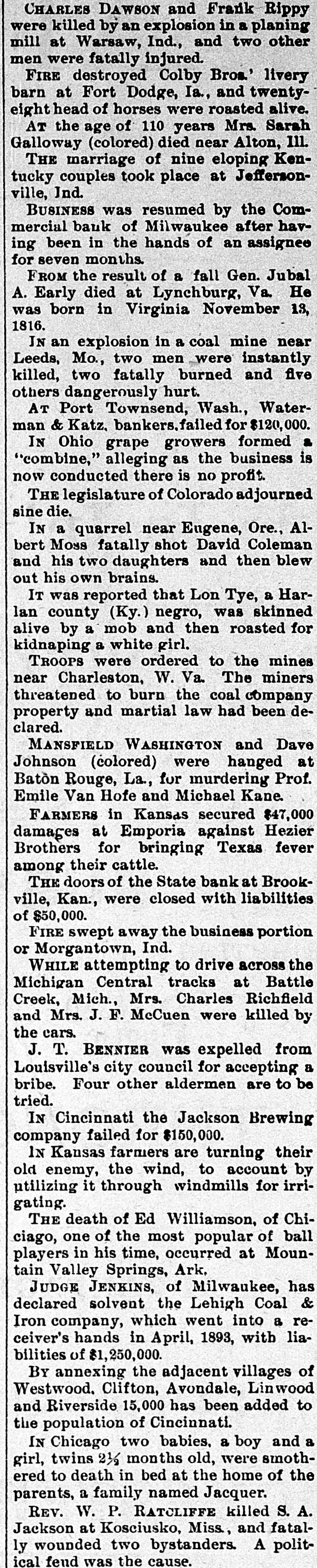 CHARLES DAWSON and Frank Rippy were killed by an explosion in a planing mill at Warsaw, Ind., and two other men were fatally injured. FIRE destroyed Colby Broa.' livery barn at Fort Dodge, Ia., and twentyeight head of horses were roasted alive. AT the age of 110 years Mrs. Sarah Galloway (colored) died near Alton, III. THE marriage of nine eloping Kentucky couples took place at Jeffersonville, Jnd. BUSINESS was resumed by the Commercial bank of Milwaukee after having been in the hands of an assignee for seven months. FROM the result of a fall Gen. Jubal A. Early died at Lynchburg, Va. He was born in Virginia November 13, 1816. IN an explosion in a coal mine near Leeds, Mo., two men were instantly killed, two fatally burned and five others dangerously hurt. AT Port Townsend, Wash., Waterman & Katz. bankers. failed for $120,000. a IN Ohio grape growers formed "combine," alleging as the business is now conducted there is no profit. THE legislature of Colorado adjourned sine die. IN a quarrel near Eugene, Ore., Albert Moss fatally shot David Coleman and his two daughters and then blew out his own brains. IT was reported that Lon Tye, a Harlan county (Ky.) negro, was skinned alive by a mob and then roasted for kidnaping a white girl. TROOPS were ordered to the mines near Charleston, W. Va. The miners threatened to burn the coal company property and martial law had been declared. MANSFIELD WASHINGTON and Dave Johnson (colored) were hanged at Batòn Rouge, La., for murdering Prof. Emile Van Hofe and Michael Kane. FARMERS in Kansas secured $47,000 damages at Emporia against Hezier Brothers for bringing Texas fever among their cattle. THE doors of the State bank at Brookville, Kan., were closed with liabilities of $50,000. FIRE swept away the business portion or Morgantown, Ind. WHILE attempting to drive across the Michigan Central tracks at Battle Creek, Mich., Mrs. Charles Richfield and Mrs. J. F. McCuen were killed by the cars. J. T. BENNIER was expelled from Louisville's city council for accepting a bribe. Four other aldermen are to be tried. IN Cincinnati the Jackson Brewing company failed for $150,000. IN Kansas farmers are turning their old enemy, the wind, to account by utilizing it through windmills for irrigating. THE death of Ed Williamson, of Chiciago, one of the most popular of ball players in his time, occurred at Mountain Valley Springs, Ark. JUDGE JENKINS, of Milwaukee, has declared solvent the Lehigh Coal & Iron company, which went into a receiver's hands in April, 1893, with liabilities of $1,250,000. By annexing the adjacent villages of Westwood. Clifton, Avondale, Linwood and Riverside 15,000 has been added to the population of Cincinnati. IN Chicago two babies, a boy and a girl, twins 2½ months old, were smothered to death in bed at the home of the parents, a family named Jacquer. REV. W. P. RATCLIFFE killed S. A. Jackson at Kosciusko, Miss, and fatally wounded two bystanders. A political feud was the cause.