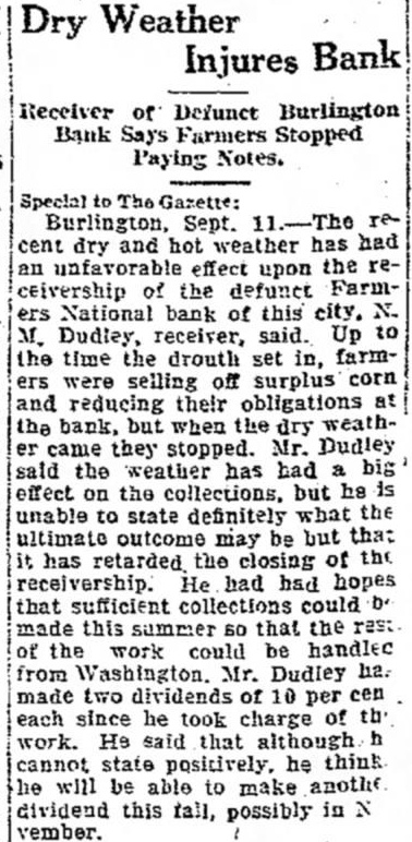 Dry Weather Injures Bank Receiver of Defunct Burlington Bank Says Farmers Stopped Paying Notes. Special to The Gazette: Burlington, Sept. 11.-The recent dry and hot weather has had an unfavorable effect upon the receivership of the defunct Farmers National bank of this city. N. M. Dudley, receiver, said. Up to the time the drouth set in, farmers were selling off surplus corn and reducing their obligations at the bank, but when the dry weather came they stopped. Mr. Dudley sald the weather has had a big effect on the collections, but hs is unable to state definitely what the ultimate outcome may be but that it has retarded the closing of the receivership. He had had hopes that sufficient collections could b. made this summer 60 that the rest of the work could be handlec from Washington. Mr. Dudley ha. made two dividends of 10 per cen each since he took charge of th work. He said that although h cannot state positively. he think he will be able to make anoth( dividend this fall, possibly in N vember.