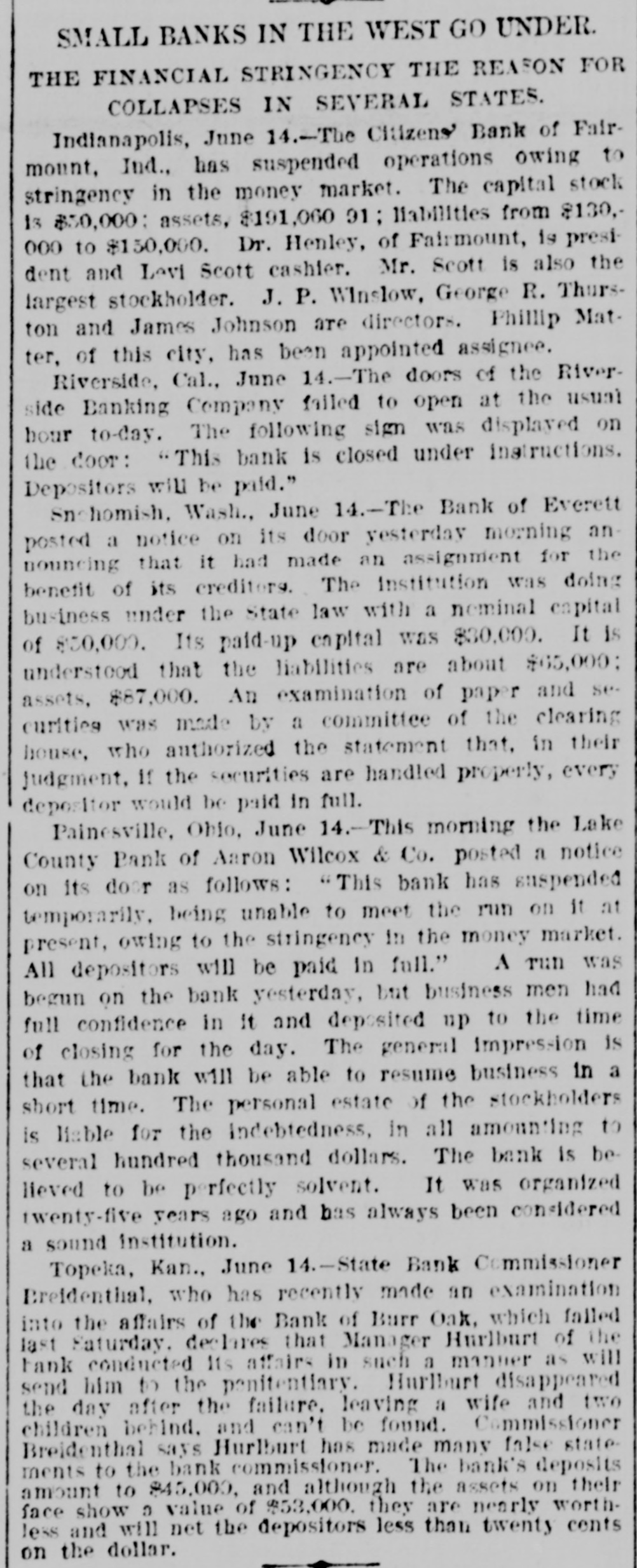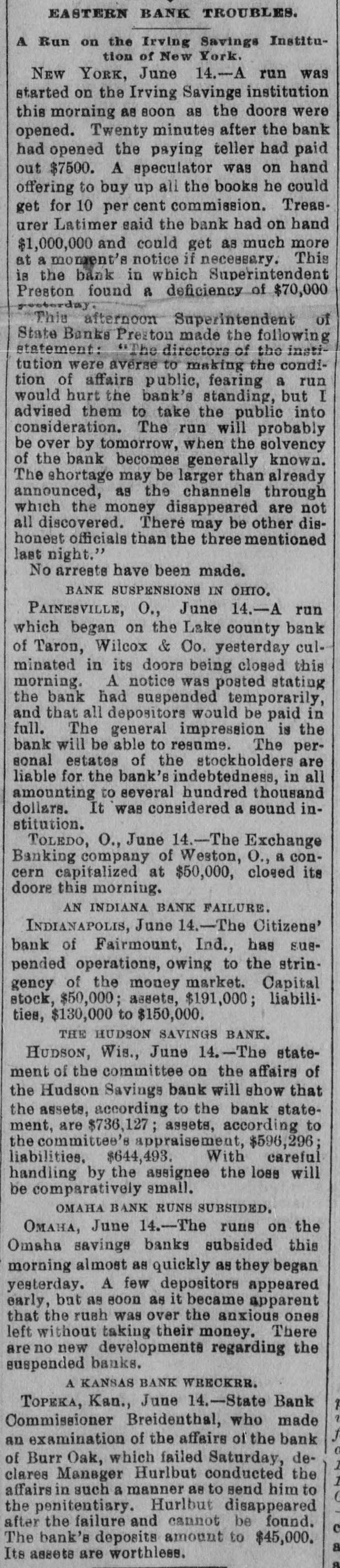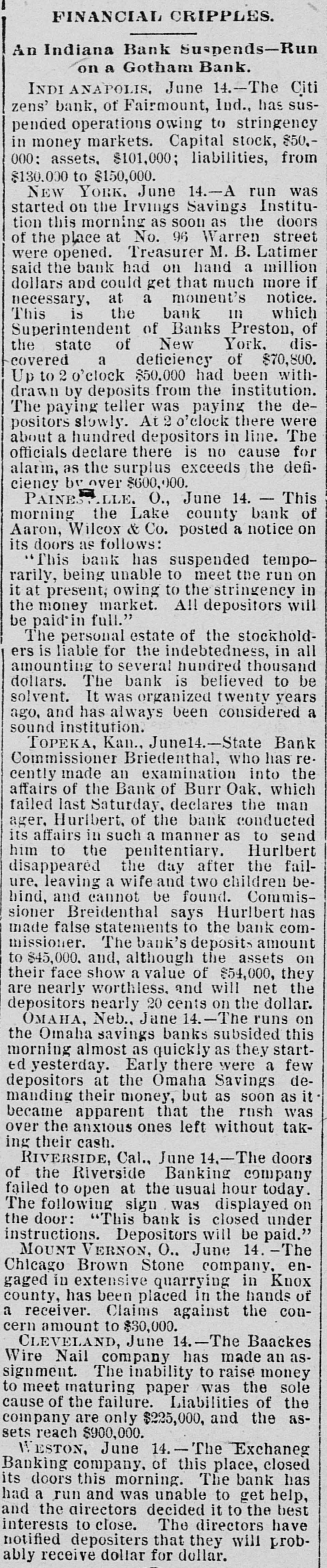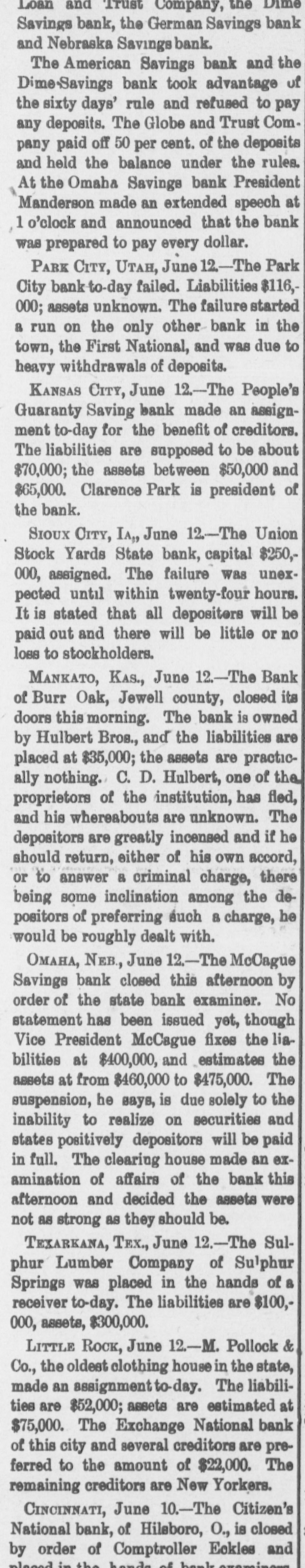 Loan and Trust Company, the Dime Savings bank, the German Savings bank and Nebraska Savings bank. The American Savings bank and the Dime-Savings bank took advantage of the sixty days' rule and refused to pay any deposits. The Globe and Trust Company paid off 50 per cent. of the deposits and held the balance under the rules. At the Omaha Savings bank President Manderson made an extended speech at 1 o'clock and announced that the bank was prepared to pay every dollar. PARK CITY, UTAH, June 12.-The Park City bank to-day failed. Liabilities $116,000; assets unknown. The failure started a run on the only other bank in the town, the First National, and was due to heavy withdrawals of deposits. KANSAS CITY, June 12.-The People's Guaranty Saving bank made an assignment to-day for the benefit of creditors. The liabilities are supposed to be about $70,000; the assets between $50,000 and $65,000. Clarence Park is president of the bank. SIOUX CITY, IA,, June 12.-The Union Stock Yards State bank, capital $250,000, assigned. The failure was unexpected until within twenty-four hours. It is stated that all depositors will be paid out and there will be little or no loss to stockholders. MANKATO, KAS., June 12.-The Bank of Burr Oak, Jewell county, closed its doors this morning. The bank is owned by Hulbert Bros., and the liabilities are placed at $35,000; the assets are practically nothing. C. D. Hulbert, one of the proprietors of the institution, has fled, and his whereabouts are unknown. The depositors are greatly incensed and if he should return, either of his own accord, or to answer a criminal charge, there being some inclination among the depositors of preferring éuch a charge, he would be roughly dealt with. OMAHA, NEB, June 12.-The McCague Savings bank closed this afternoon by order of the state bank examiner. No statement has been issued yet, though Vice President McCague fixes the liabilities at $400,000, and estimates the assets at from $460,000 to $475,000. The suspension, he says, is due solely to the inability to realize on securities and states positively depositors will be paid in full. The clearing house made an examination of affairs of the bank this afternoon and decided the assets were not as strong as they should be. TEXARKANA, TEX., June 12.-The Sulphur Lumber Company of Sulphur Springs was placed in the hands of a receiver to-day. The liabilities are $100,000, assets, $300,000. LITTLE Rock, June 12.-M. Pollock & Co., the oldest clothing house in the state, made an assignment to-day. The liabilities are $52,000; assets are estimated at $75,000. The Exchange National bank of this city and several creditors are preferred to the amount of $22,000. The remaining creditors are New Yorkers. CINCINNATI, June 10.-The Citizen's National bank, of Hileboro, O., is closed by order of Comptroller Eokles and pleased in the hands of hank examinous