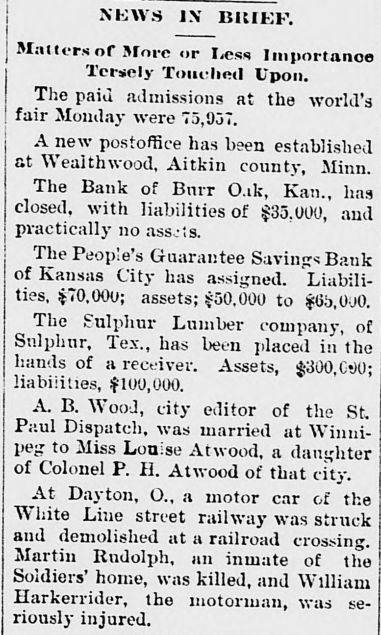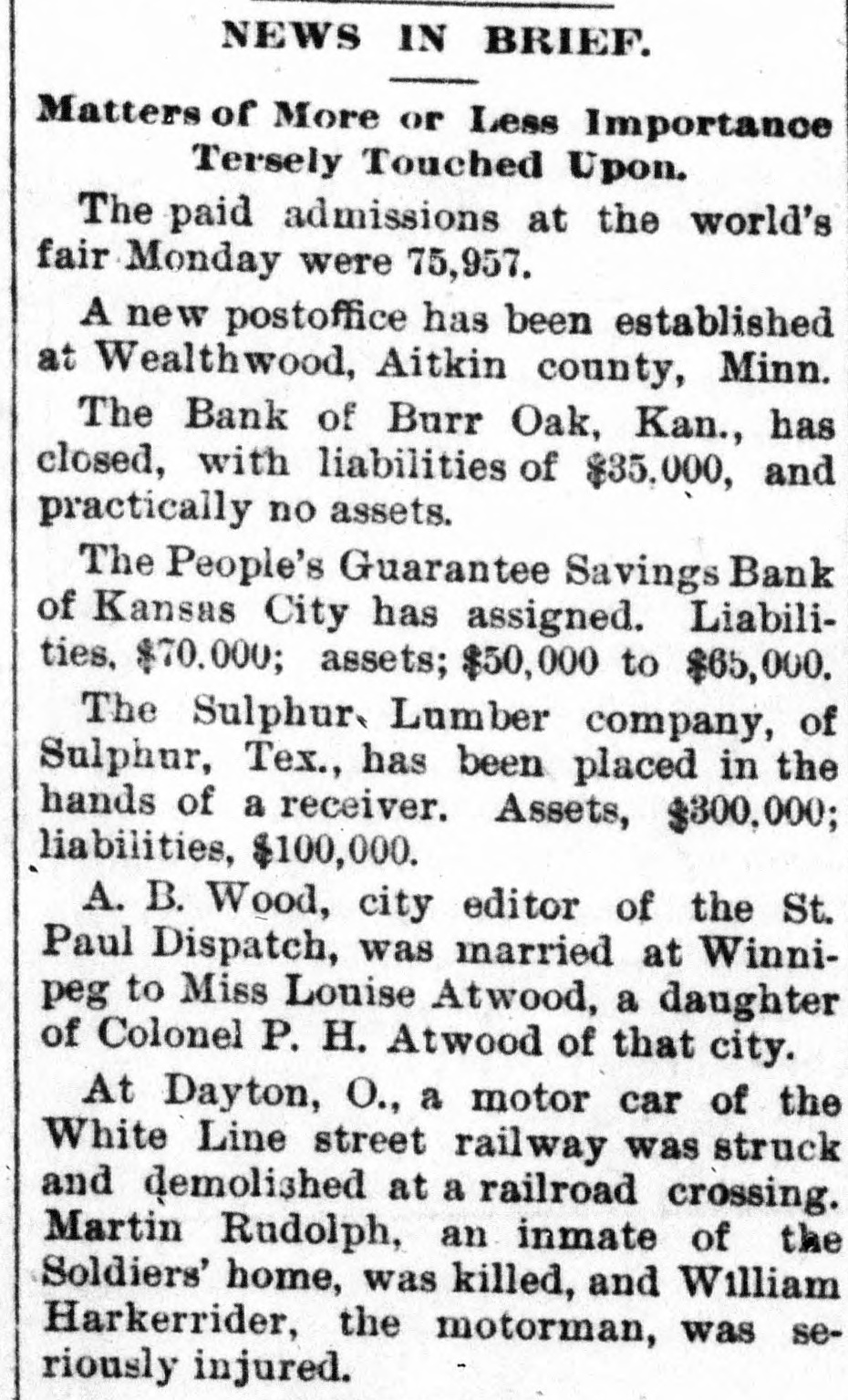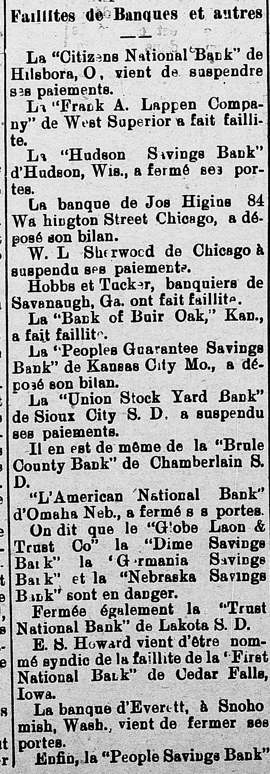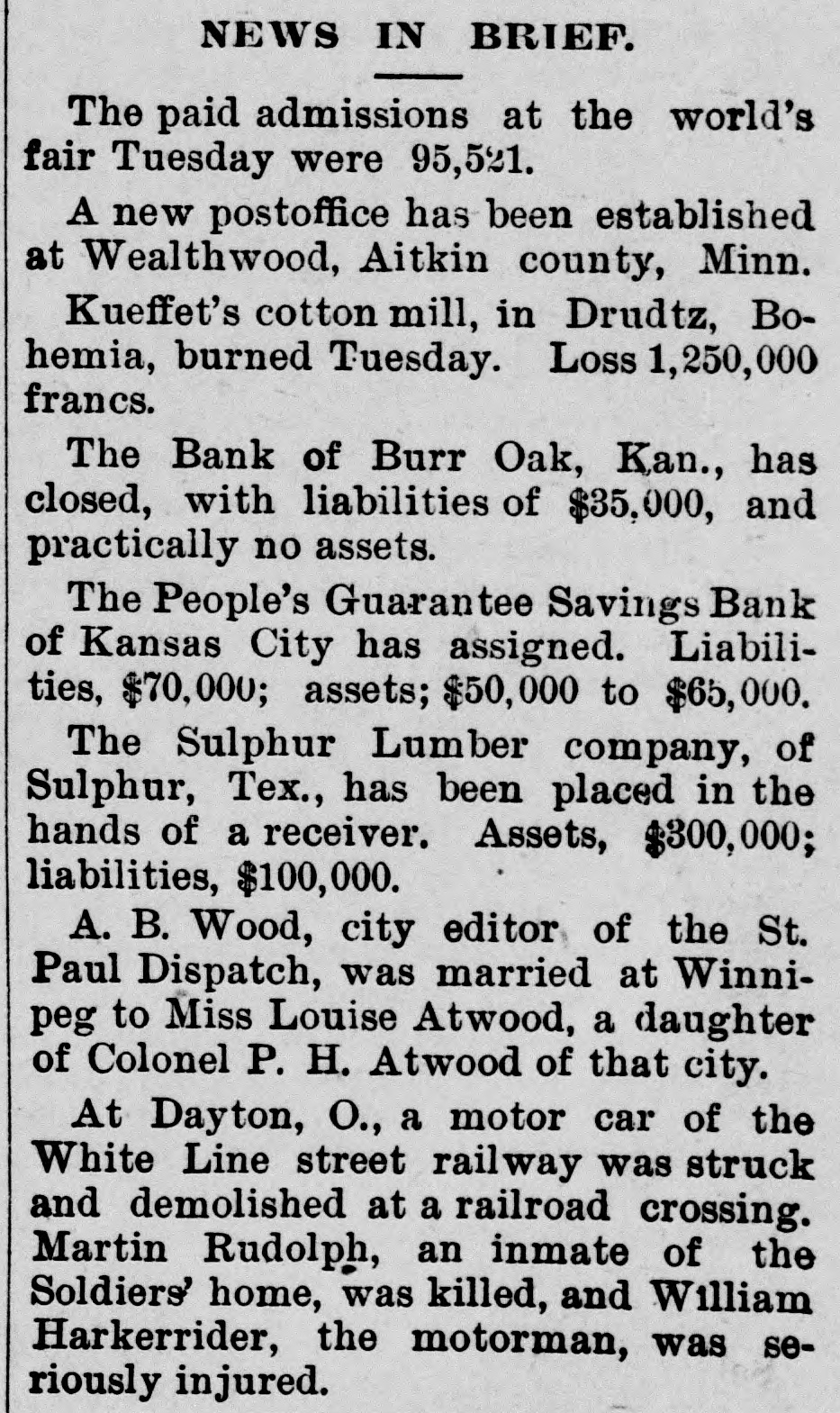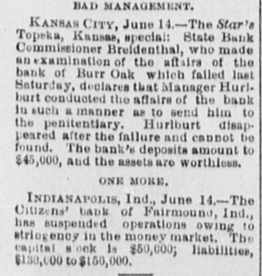 Loan and Trust Company, the Dime Savings bank, the German Savings bank and Nebraska Savings bank. The American Savings bank and the Dime-Savings bank took advantage of the sixty days' rule and refused to pay any deposits. The Globe and Trust Company paid off 50 per cent. of the deposits and held the balance under the rules. At the Omaha Savings bank President Manderson made an extended speech at 1 o'clock and announced that the bank was prepared to pay every dollar. PARK CITY, UTAH, June 12.-The Park City bank to-day failed. Liabilities $116,000; assets unknown. The failure started a run on the only other bank in the town, the First National, and was due to heavy withdrawals of deposits. KANSAS CITY, June 12.-The People's Guaranty Saving bank made an assignment to-day for the benefit of creditors. The liabilities are supposed to be about $70,000; the assets between $50,000 and $65,000. Clarence Park is president of the bank. SIOUX CITY, IA,, June 12.-The Union Stock Yards State bank, capital $250,000, assigned. The failure was unexpected until within twenty-four hours. It is stated that all depositors will be paid out and there will be little or no loss to stockholders. MANKATO, KAS., June 12.-The Bank of Burr Oak, Jewell county, closed its doors this morning. The bank is owned by Hulbert Bros., and the liabilities are placed at $35,000; the assets are practically nothing. C. D. Hulbert, one of the proprietors of the institution, has fled, and his whereabouts are unknown. The depositors are greatly incensed and if he should return, either of his own accord, or to answer a criminal charge, there being some inclination among the depositors of preferring éuch a charge, he would be roughly dealt with. OMAHA, NEB, June 12.-The McCague Savings bank closed this afternoon by order of the state bank examiner. No statement has been issued yet, though Vice President McCague fixes the liabilities at $400,000, and estimates the assets at from $460,000 to $475,000. The suspension, he says, is due solely to the inability to realize on securities and states positively depositors will be paid in full. The clearing house made an examination of affairs of the bank this afternoon and decided the assets were not as strong as they should be. TEXARKANA, TEX., June 12.-The Sulphur Lumber Company of Sulphur Springs was placed in the hands of a receiver to-day. The liabilities are $100,000, assets, $300,000. LITTLE Rock, June 12.-M. Pollock & Co., the oldest clothing house in the state, made an assignment to-day. The liabilities are $52,000; assets are estimated at $75,000. The Exchange National bank of this city and several creditors are preferred to the amount of $22,000. The remaining creditors are New Yorkers. CINCINNATI, June 10.-The Citizen's National bank, of Hileboro, O., is closed by order of Comptroller Eokles and pleased in the hands of hank examinous