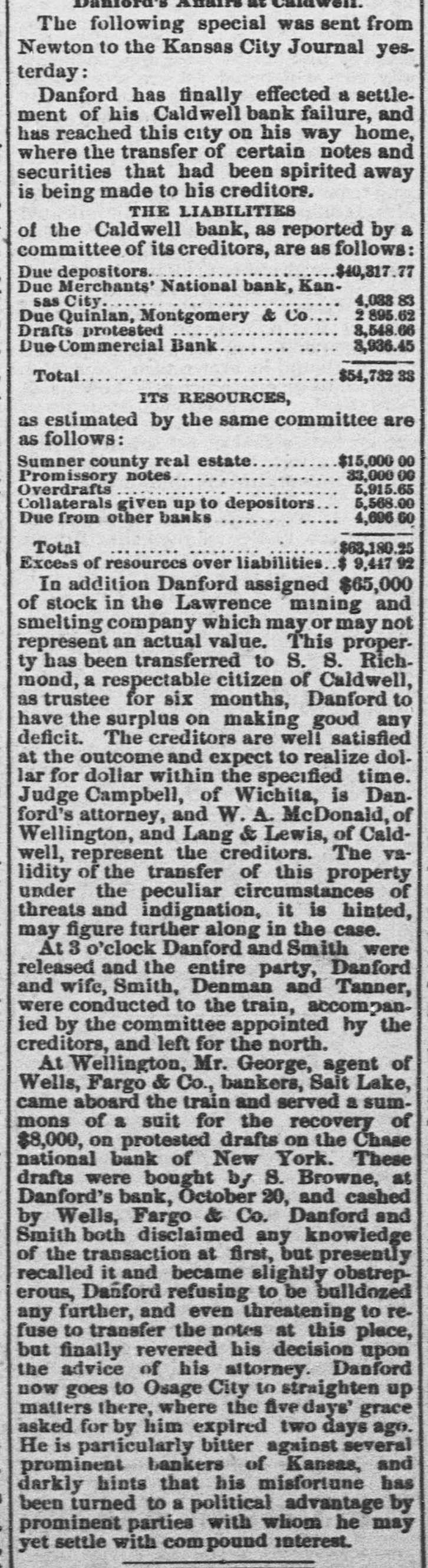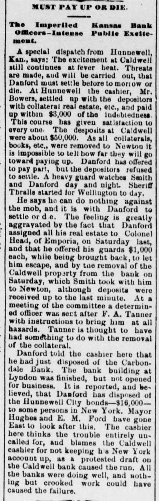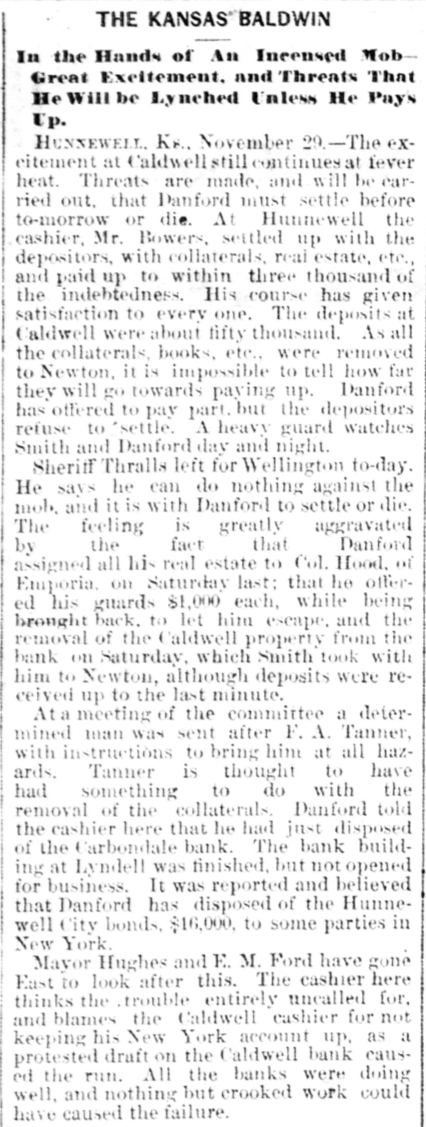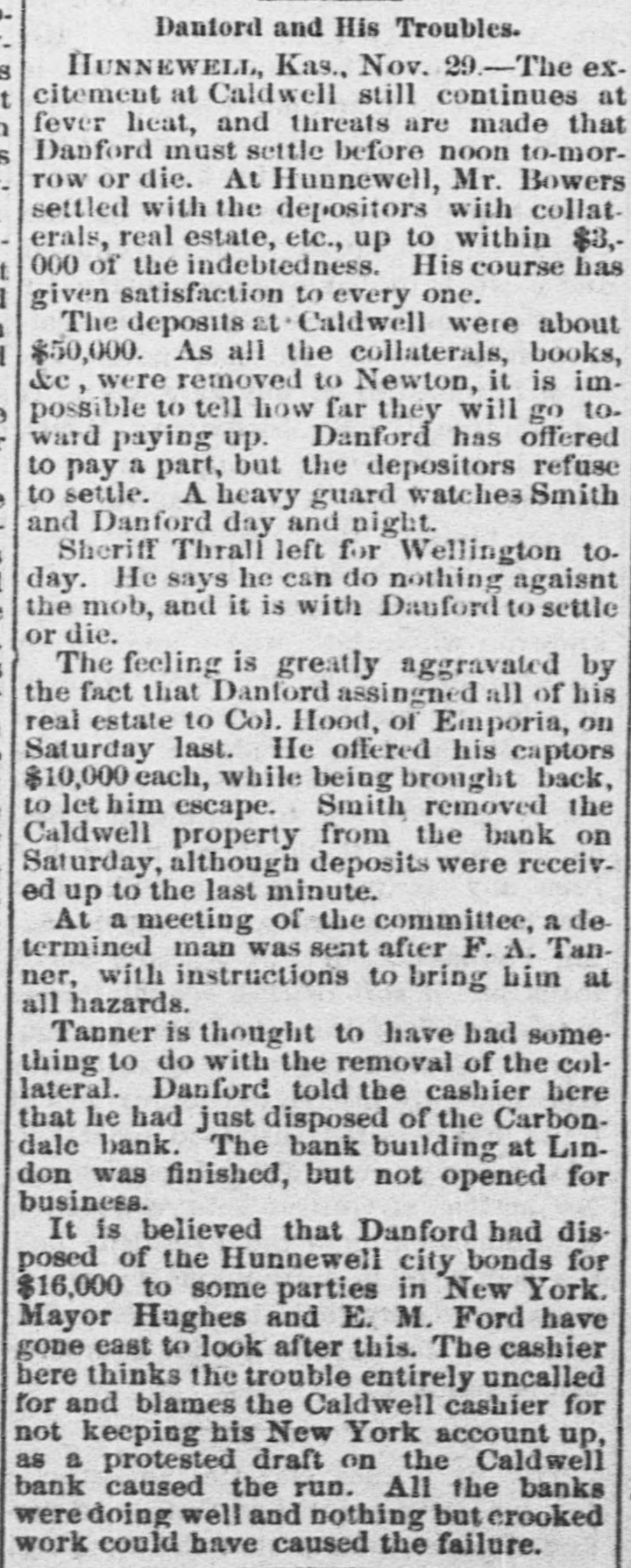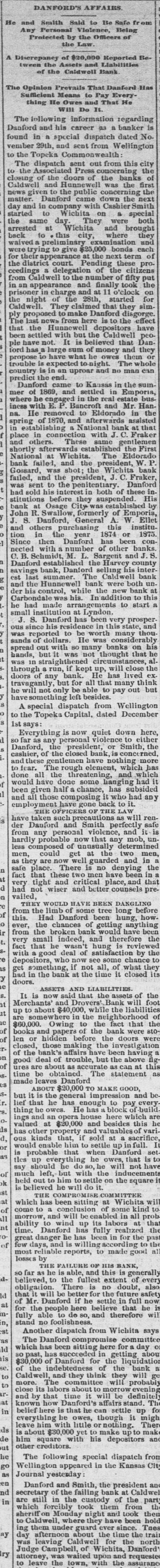 Paris advices state that Firman has accepted the governorship of Algeria on terms which reduce it a mere prefect. Victoria Woodhall has arrived in New York with her daughter, who was falsely reported engaged to Lord Colin Campbell. Osage City, Kansas, Nov. 29.-The Osage City savings bank has suspended, being under the same management as the recently suspended Hunnewell and Caldwell banks. Menssonier, the artist, gave a soiree in Paris in honor of the American photographer who invented the process by which photographs can be taken of animals in the swiftest motion. General Sheridan has written to Miss Clara Barton, American representative of the society of the Red Cross in favor of congressional recognition of the soclety in accordance with the terms of international convention of the leading European powers at Geneva. The chief object of the society is the amelioration of the sufferings of the sick and wounded in armies during war. The Chicago Tribune's editorial says: One of the first duties of congress will be to abolish the Hawaiian reciprocity treaty which has simply been the means of enriching a few planters in the Sandwich Islands and a sugar pool in San Francisco and has cost the government a million a year in revenues. The facts about this outrageous sugar monopoly on the Pacific slope has been repeatedly stated and never denied. The Tribune's Washington special says: The latest place for which Chauncey J. Filley has been mentioned is the land commissionership of the Union Pacific railway. Tilley is here interested in securing a cabinet position, and said upon being inquired of that the talk about the Union Pacific position was news to him. To his intimate friends, however, Filley speaks with great confidence of being made postmaster-general.