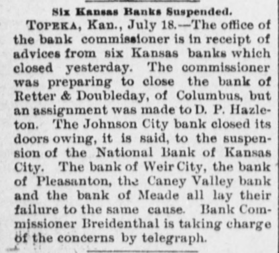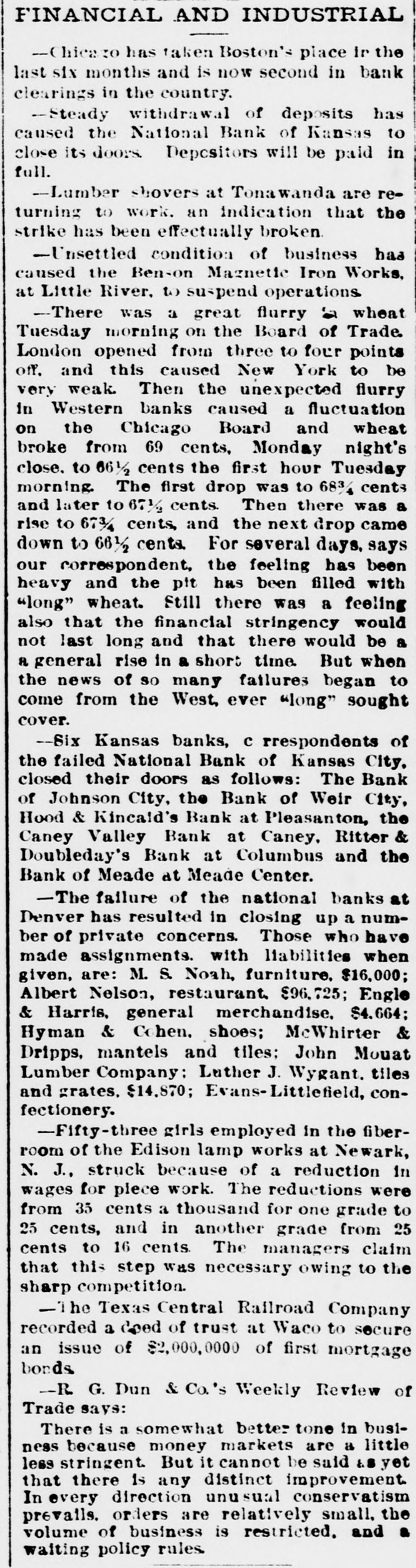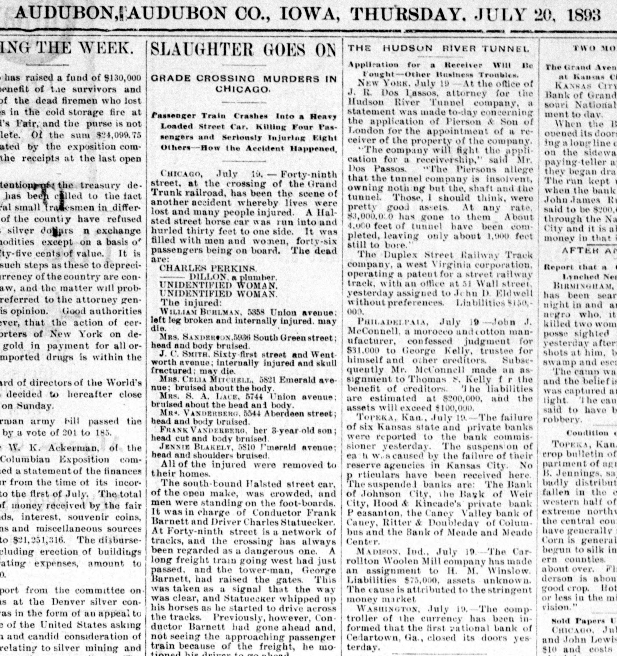 AUDUBON, AUDUBON CO., IOWA, THURSDAY. JULY 20, 1893 TWO MORE THE HUDSON RIVER TUNNEL RING THE WEEK. SLAUGHTER GOES ON Application for a Receiver WIII Be The Grand Avenue a Fought-Other Business Troubles. at Kansas City S GRADE CROSSING MURDERS IN ago has raised a fund of $130,000 NEW YORK, July - At the office of KANSAS CITY, M CHICAGO. e benefit of the survivors and Bank of Grand Ave J. R. Dos Lassos, attorney for the es of the dead firemen who lost souri National ba Hudson River Tunnel company, a statement was made to-day concerning ment to day. lives in the cold storage fire at Passenger Train Crashes Into a Heavy the application of Pierson & Son of When the Bank orld's Fair, and the purse is not Loaded Street Car, Killing Four PasLondon for the appointment of a reopened its doors for implete. of the sum $24,099.75 sengers and Seriously Injuring Eight ceiver of the property of the company. ing a long line of de Others-How the Accident Happened, donated by the exposition comThe company will fight the applion the sidewalk a cation for a receivership," said Mr. as the receipts at the last open paying-teller appea Dos Passos. "The Piersons allege they began drawin y. CHICAGO, July 19. - Forty-ninth that the tunnel company is insolvent, The run kept up 1 street, at the crossing of the Grand attention gft the treasury deowning noth but the, shaft and the when the bank was Trunk railroad, has been the scene of tunnel. Those, I should think, were ent has been called to the fact John James Rucke another accident whereby lives were pretty good assets. At any rate, said to be $200,000. everal small Tradesmen in differlost and many people injured. A Hal$3,000,000 has gone to them About through the Nation rts of the country have refused sted street horse car was run into and 4.000 feet of tunuel have been comCity and it is allege hurled thirty feet to one side. It was ept silver dollars n exchange pleted, leaving only about 1,900 feet money in that in ti filled with men and women, forty-six still to bore. minodities except on a basis of AFTER ANO passengers being on board. The dead The Duplex Street Railway Track r fifty-five cents of value. It is are: company, a west Virginia corporation, Report that " Colo at such steps as these to depreciCHARLES PERKINS operating a patent for a street railway Lynched Near E DILLON. a plumber. e currency of the country are contrack, with an office at 51 Wall street, BIRMINGHAM, Ala UNIDENTIFIED WOMAN. to law, and the matter will probyesterday assigned to Jehn D. Eldwell has been searchir UNIDENTIFIED WOMAN. be referred to the attorney genwithout preferences. Liabilities $150,The injured: night in and aroun 000. WILLIAM BURLMAN, 5358 Union avenue: or his opinion. Good authorities negro who, it is left leg broken and internally injured. may killed two women I PHILADELPAIA, July -John J. lowever, that the action of cerdie. McConnell, a morocco and cotton manposse sighted the importers of New York on deMRS. SANDER ON,5936 South Greenstreet; ufacturer, confessed judgment for yesterday afternoo head and body bruised. ng gold in payment for all or$31,000 to George Kelly, trustee for shots at him, but J. C. SMITH. Sixty-first street and Wenthimself and other creditors. Subseof imported drugs is within the swamp and escaped worth avenue; internally injured and skull quently Mr. McConnell made an asThe camp wassu fractured: may die. signment to Thomas S. Kelly f r the MRS. CELIA MITCHELL. 5821 Emerald ave and the belief is get board of directors of the World's benefit of creditors. The liabilities nue; bruised about the body. was captured and 1 ave decided to hereafter close MRS. S. A. LACE, 5744 Union avenue; are estimated at $200,000, and the light he cause bruised about the head and body. assets will exceed $100,000. said to have been tes on Sunday. MR VANDERBERG 5544 Aberdeen street; TOPEKA, Kan., July 19. - The failure robbery. head and body bruised. German army bill passed the of six Kansas state and private banks Condition of C FRANK VANDERBERG her 3-year-old son; tag by a vote of 201 to 185. were reported to the bank commishead cut and body brnised. TOPERA, Kan., Ju sioner yesterday. The suspension of JENNIE BLAKELY, 5810 l'merald avenue; itor W. K. Ackerman, of the erop bulletin of the head and shoulders bruised. ea " caused by the failure of their I's Columbian Exposition compartment of agrieu All of the injured were removed to reserve agencies in Kansas City. No issued a statement of the finances B. Jennings, says: their homes. p rticulars have been received here. badly distributed. e fair from the time of its incorThe south-bound Halsted street car, The suspende. banks are: The Bank fallen in the cent of Johnson City, the Bank of Weir of the open make, was crowded, and on to the first of July. The total western half of th men were standing on the foot-boards. City, Hood & Kincade's private bank t of money received by the fair extreme northwest It was in charge of Conductor Frank P easanton, the Caney Valley bank of bonds, interest, souvenir coins, the central countie Barnett and Driver Charles Statuecker. Caney, Ritter & Doubleday of Columssions and miscellaneous sources have generally rece bus and the Bank of Meade and Meade At Forty-ninth street is a network of Corn is generally Center. ats to $21,251,316. The disbursetracks, and the crossing has always begun to silk in the been regarded as a dangerous one. A MADISON. Ind., July Car, including erection of buildings ern counties. Th long freight train going west had just rollton Woolen Mill company has made operating expenses, amount to about over. Flax an assignment to H. M. Winslow. passed. and the tower-man, George derson is about r 0,160. Liabilities $75,000, assets unknown. Barnett, had raised the gates. This good crop. Hot wi The cause is attributed to the stringent was taken as a signal that the way report from the committee on or less in the middl money market was clear, and Statuecker whipped up tion