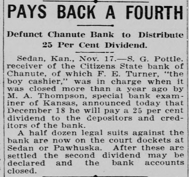 PAYS BACK A FOURTH Defunct Chanute Bank to Distribute 25 Per Cent Dividend. Sedan, Kan., Nov. 17.-S. G. Pottle. receiver of the Citizens State bank of Chanute, of which F. E. Turner, "the boy cashier," was in charge when it was closed more than a year ago by M. A. Thompson, special bank examiner of Kansas, announced today that December 18 he will pay a 25 per cent dividend to the depositors and creditors of the bank. A half dozen legal suits against the bank are now on the court dockets at Sedan or Pawhuska. After these are settled the second dividend may be declared and the bank accounts closed.