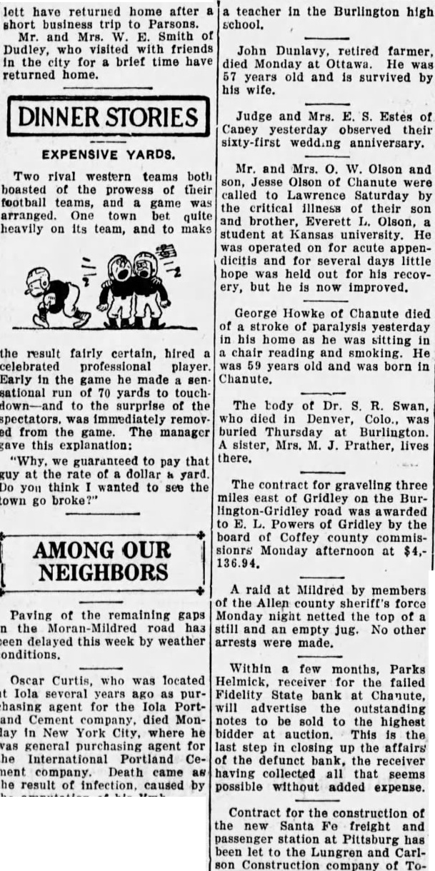 lett have returned home after a short business trip to Parsons. Mr. and Mrs. W. E. Smith of Dudley, who visited with friends in the city for a brief time have returned home. a teacher in the Burlington high school. John Dunlavy, retired farmer, died Monday at Ottawa. He was 57 years old and is survived by his wife. Judge and Mrs. E. S. Estes of Caney yesterday observed their sixty-first wedding anniversary. Mr. and Mrs. O. W. Olson and son, Jesse Olson of Chanute were called to Lawrence Saturday by the critical illness of their son and brother, Everett L. Olson, a student at Kansas university. He was operated on for acute appendicitis and for several days little hope was held out for his recovery, but he is now improved. George Howke of Chanute died of stroke of paralysis yesterday in his home as he was sitting in a chair reading and smoking. He was 59 years old and was born in Chanute. The body of Dr. S. R. Swan, who died Denver, Colo., was buried Thursday at Burlington. A sister, Mrs. M. J. Prather, lives there. The contract for graveling three miles east of Gridley on the Burlington-Gridley road was awarded to E. L. Powers of Gridley by the board of Coffey county commissionrs Monday afternoon at $4,136.94. A raid at Mildred by members of the Allen county force Monday night netted the top of still and an empty jug. No other arrests were made. Within a few months, Parks Helmick, receiver for the failed Fidelity State bank at Chanute, will advertise the outstanding notes to be sold to the highest bidder at auction. This is the last step in closing up the affairs of the defunct bank, the receiver having collected all that seems possible without added expense. Contract for the construction of the new Santa Fe freight and passenger station at Pittsburg has been let to the Lungren and Carlson Construction company of To-