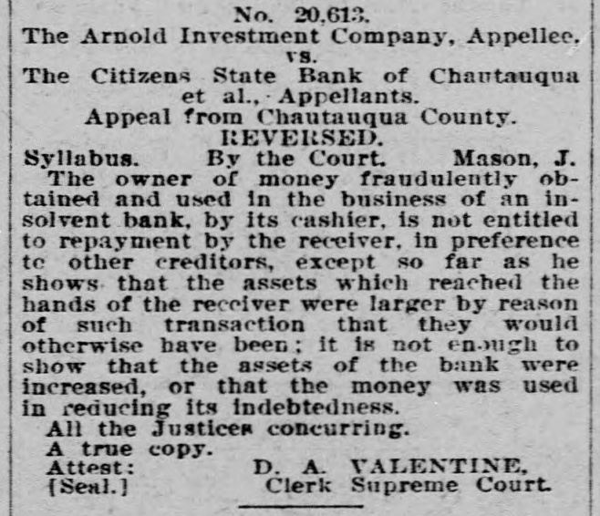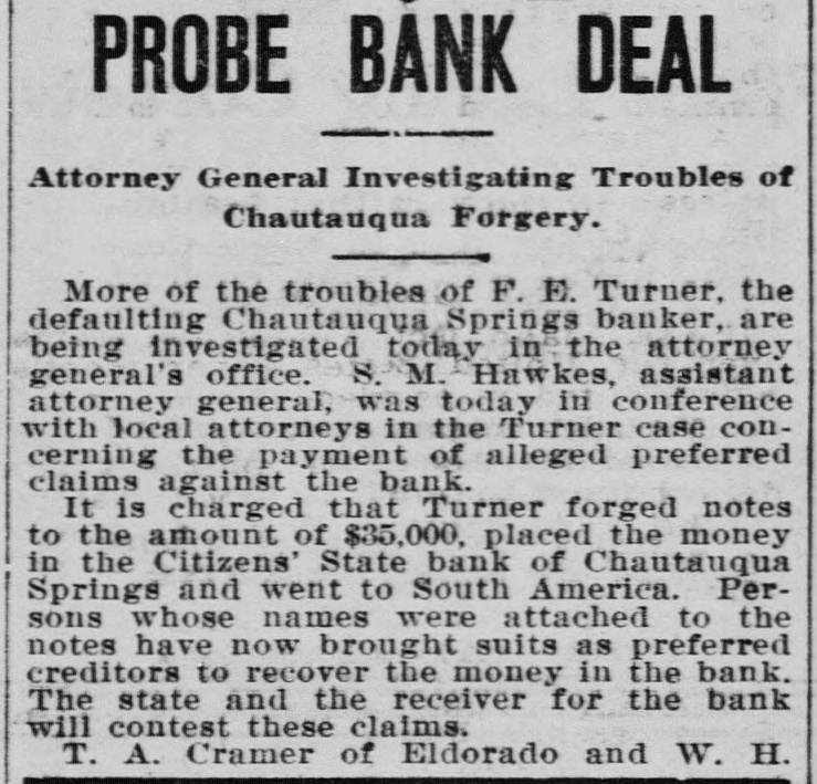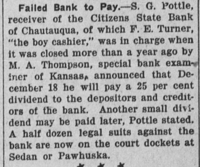 Failed Bank to Pay.-S. G. Pottle, receiver of the Citizens State Bank of Chautauqua, of which F. E. Turner, "the boy cashier," was in charge when it was closed more than a year ago by M. A. Thompson, special bank examiner of Kansas, announced that December 18 he will pay a 25 per cent dividend to the depositors and creditors of the bank. Another small dividend may be paid later, Pottle stated. A half dozen legal suits against the bank are now on the court dockets at Sedan or Pawhuska.