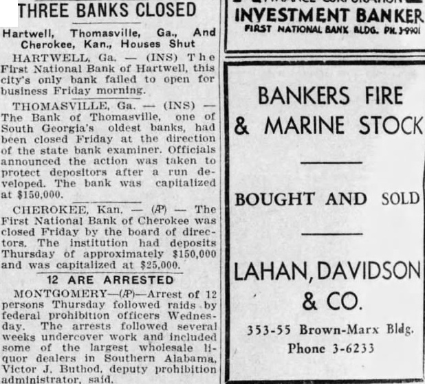 THREE BANKS CLOSED Hartwell, Thomasville, Ga., And FIRST NATIONAL BLDG. PM. 3-9901 Cherokee, Kan., Houses Shut Ga. (INS) Th First National Hartwell, this city's only bank failed to open for Friday morning BANKERS FIRE Ga. (INS) The of & MARINE STOCK South Georgia's oldest banks, had been closed Friday at the direction the state bank Officials announced the taken to protect after run deThe bank was capitalized at BOUGHT AND SOLD CHEROKEE. Kan. (AP) The First National was closed Friday by the board of direcThe institution deposits Thursday of approximately $150,000 and was capitalized at $25,000. LAHAN, DAVIDSON ARE ARRESTED of 12 & CO. persons Thursday followed raids by federal prohibition officers Wednesday The arrests followed several 353-55 Brown-Marx Bldg. weeks and included of the largest wholesale 11- Phone 3-6233 quor dealers in Southern Alabama, Victor Buthod. deputy prohibition