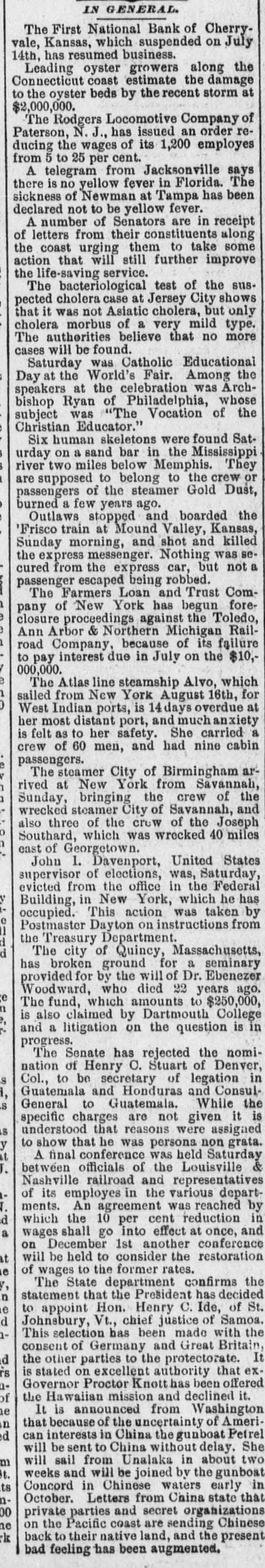 NT The First National Bank of Cherryvale, Kansas, which suspended on July 14th, has resumed business. Leading oyster growers along the Connecticut coast estimate the damage to the oyster beds by the recent storm at *000'000'2$ The Rodgers Locomotive Company of Paterson, N. J., has issued an order reducing the wages of its 1,200 employes from 5 to 25 per cent. A telegram from Jacksonville says there is no yellow fever in Florida. The sickness of Newman at Tampa has been declared not to be yellow fever. A number of Senators are in receipt of letters from their constituents along the coast urging them to take some action that will still further improve the life-saving service. The bacteriological test of the suspected cholera case at Jersey City shows that it was not Asiatic cholera, but only cholera morbus of a very mild type. The authorities believe that no more cases will be found. Saturday was Catholic Educational Day at the World's Fair. Among the speakers at the celebration was Archbishop Ryan of Philadelphia, whose subject was "The Vocation of the Christian Educator." Six human skeletons were found Saturday on a sand bar in the Mississippi river two miles below Memphis. They are supposed to belong to the crew or passengers of the steamer Gold Dust, burned a few years ago. Outlaws stopped and boarded the 'Frisco train at Mound Valley, Kansas, Sunday morning, and shot and killed the express messenger. Nothing was secured from the express car, but not a passenger escaped being robbed. The Farmers Loan and Trust Company of New York has begun foree closure proceedings against the Toledo, € Ann Arbor & Northern Michigan Railroad Company, because of its failure to pay interest due in July on the $10,/ 000,000. a The Atlas line steamship Alvo, which U sailed from New York August 16th, for 0 West Indian ports, is 14 days overdue at her most distant port, and much anxiety is felt as to her safety. She carried a crew of 60 men, and had nine cabin passengers. a The steamer City of Birmingham arA L rived at New York from Savannah, D Sunday, bringing the crew of the wrecked steamer City of Savannah, and also three of the crew of the Joseph o Southard, which was wrecked 40 miles 1 east of Georgetown. John I. Davenport, United States supervisor of elections, was, Saturday, evicted from the office in the Federal A Building, in New York, which he has occupied. This action was taken by 0 Postmaster Dayton on instructions from TI the Treasury Department. p p The city of Quincy, Massachusetts, has broken ground for a seminary provided for by the will of Dr. Ebenezer Woodward, who died 22 years ago. a The fund, which amounts to $250,000, D is also claimed by Dartmouth College at and a litigation on the question is in progress. The Senate has rejected the nomination of Henry C. Stuart of Denver, S Col., to be secretary of legation in Guatemala and Honduras and Consul'I General to Guatemala. While the S specific charges are not given it is S1 understood that reasons were assigned to show that he was persona non grata. X 11 A final conference was held Saturday between officials of the Louisville & 'I Nashville railroad and representatives of its employes in the various depart1 ments. An agreement was reached by 10 the