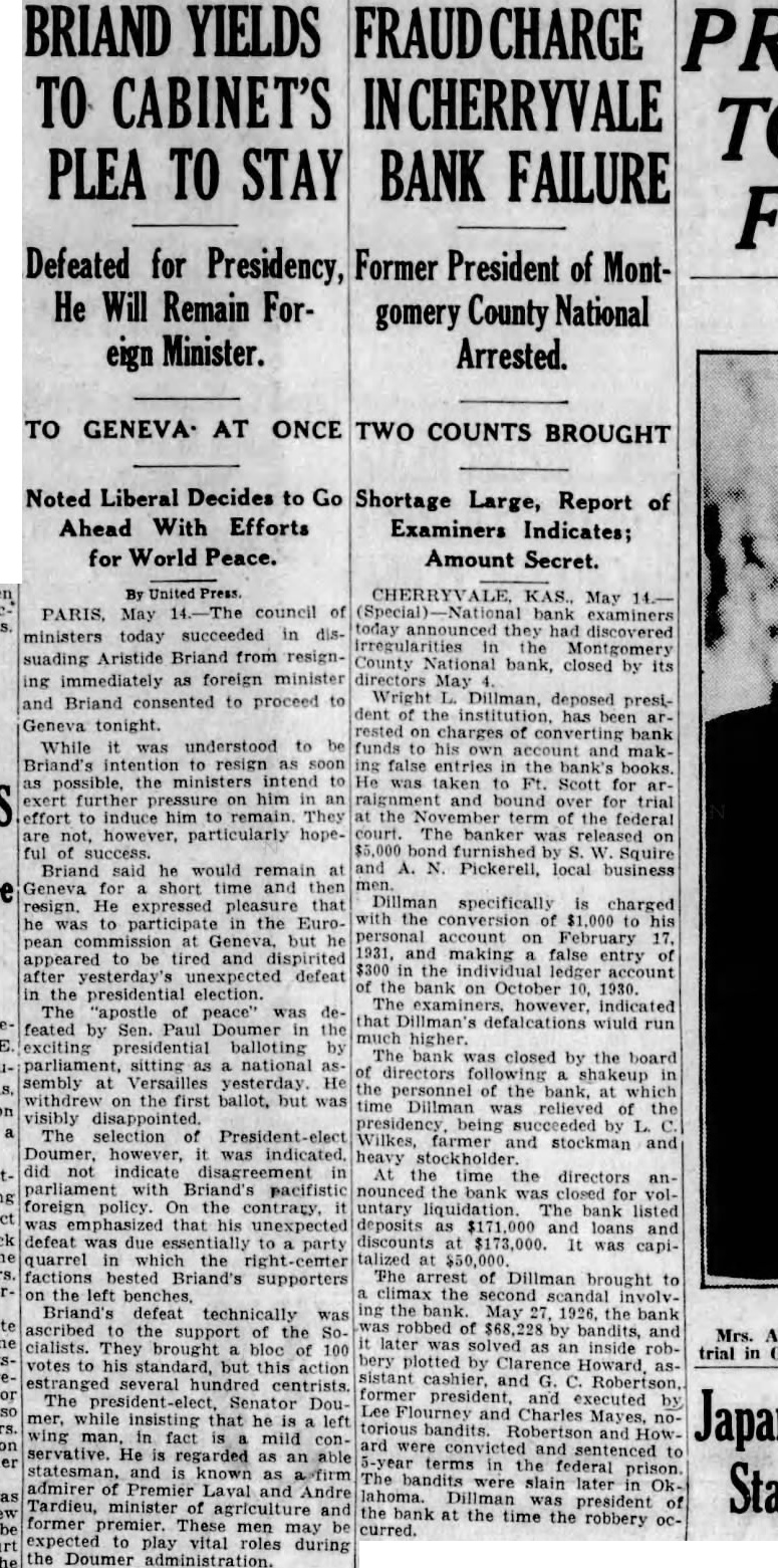 BRIAND YIELDS TO CABINET'S INCHERRYVALE PLEA TO STAY BANK FAILURE Defeated for Presidency, He Will Remain ForMinister. eign Former President of Montgomery County National Arrested. TO AT ONCE TWO COUNTS BROUGHT Noted Liberal Decides to Go Ahead With Efforts for World Peace. PARIS, May council ministers today succeeded in suading Aristide Briand from ing immediately foreign minister and Briand consented to proceed Geneva tonight. While was understood to Briand's resign the further on effort to induce him to remain. They however, particularly hopeof Briand said he would remain Geneva for short time and then resign. He expressed pleasure he participate the Eurobut appeared to be tired and dispirited after defeat the presidential election. The "apostle peace" was feated by Sen. Paul Doumer exciting presidential balloting parliament, sitting national sembly Versailles yesterday. He withdrew on the first ballot, but visibly disappointed. The selection Doumer, however, did indicate with Briand's foreign policy. On the contrary, that his defeat due party quarrel the factions bested Briand's supporters the Briand's defeat technically ascribed support of the cialists. They brought bloc of 100 votes standard, but this action several hundred centrists. The Senator Doumer, while insisting that he left man, fact mild servative. He regarded statesman, and known admirer Premier Laval and Andre Tardieu, minister agriculture and former These men may to vital roles during the Doumer administration. Shortage Large, Report of Examiners Indicates; Amount Secret. May bank examiners announced they had discovered irregularities Montgomery County National bank, closed by its directors May Wright Dillman, deposed president institution. has been rested converting bank funds his and makfalse the taken Scott and bound for the term of the The banker furnished Squire and Pickerell, local business Dillman specifically is charged with the conversion personal account February making false entry of ledger account the bank on October 10, 1930. Dillman's defalcations wiuld run higher. bank closed by the board directors personnel of the bank, time Dillman relieved the being by Wilkes, farmer and stockman heavy stockholder At time the directors the bank closed The bank listed deposits and loans discounts $173,000. was capitalized The arrest of Dillman brought the the bank. May the bank robbed of bandits, Mrs. later was solved an inside bery plotted Clarence sistant and former and executed Charles bandits. and Howard and sentenced the federal prison. later lahoma. president the the time the robbery curred.