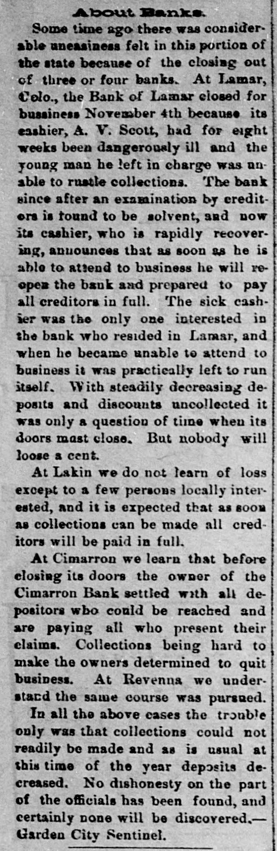 About Banks. Some time ago there was considerable uneasiness felt in this portion of the state because of the closing out of three or four banks. At Lamar, Colo., the Bank of Lamar closed for bussiness November 4th because its eashier, A. V. Scott, had for eight weeks been dangerously ill and the young man he !eft in charge was anable to rustle collections. The bank since after an examination by creditors is round to be solvent, and now its cashier, who is rapidly recovering, announces that as soon as he is able to attend to business he will reopen the bank and prepared to pay all creditors in full. The sick cashier was the only one interested in the bank who resided in Lamar, and when he became unable to attend to business it was practically left to run itself. With steadily decreasing deposits and discounts uncollected it was only a question of time when its doors mast close. But nobody will loose a cent. At Lakin we do not learn of loss except to a few persons locally interested, and it is expected that as BOOM as collections can be made all creditors will be paid in full. At Cimarron we learn that before closing its doors the owner of the Cimarron Bank settled with all depositors who could be reached and are paying all who present their claims. Collections being hard to make the owners determined to quit business. At Revenna we understand the same course was pursued. In all the above cases the trouble only was that collections could not readily be made and as is usual at this time of the year deposits decreased. No dishonesty on the part of the officials has been found, and certainly none will be discovered.Garden City Sentinel.
