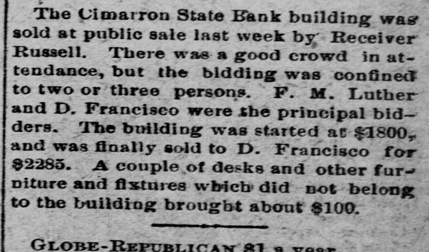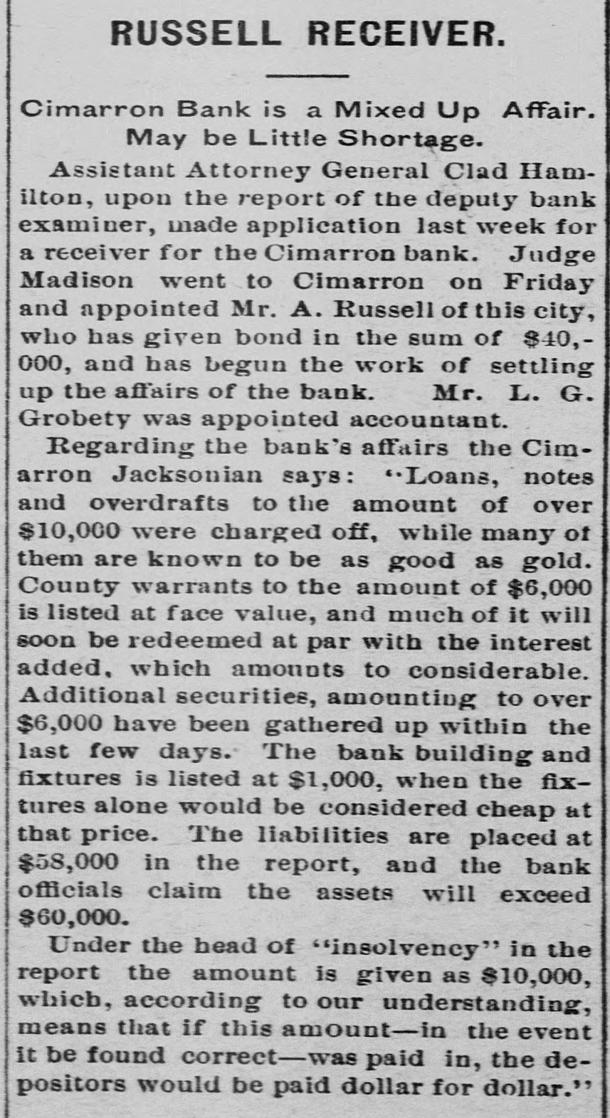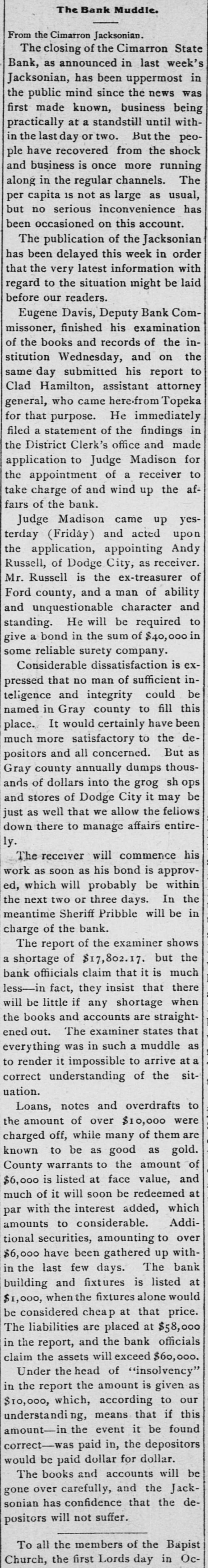 The Bank Muddle. From the Cimarron Jacksonian. The closing of the Cimarron State as announced in last week's in Jacksonian, Bank, has been uppermost was the public mind since the news made known, business being withpractically first at a standstill until peothe last day or two. But the shock in have recovered from the ple is once more running in the regular capita IS not as large as and along business channels. usual, The has per no serious inconvenience been but occasioned on this account. The publication of the Jacksonian order been delayed this week in with that has the very latest information laid regard to the situation might be before our readers. Eugene Davis, Deputy Bank Commissoner, finished his examination the inthe books and records of the of Wednesday, and on submitted his stitution same day report attorney to Clad Hamilton, assistant general, who came here.from Topeka for that purpose. He immediately in statement of the findings made filed District a Clerk's office and for the application to Judge Madison receiver to appointment of a the aftake the charge of and wind up fairs of the bank. Judge Madison came up upon yes(Friday) and acted Andy terday the application, appointing receiver. Russell, of Dodge City, as of Russell is the ex-treasurer ability Ford Mr. county, and a man of and character He will be standing. and unquestionable required $40,000 to in give a bond in the sum of some reliable surety company. Considerable dissatisfaction is ex- inthat no man of sufficient could be pressed and integrity teligence named in Gray county to have fill been this It would certainly the deplace. much more satisfactory to But as and all concerned. thouspositors county annually dumps sh ops Gray of dollars into the grog be ands stores of Dodge City it may feliows and well that we allow the entirejust down as there to manage affairs ly. receiver will commence his The as soon as his bond is approv- within work which will probably be In the ed, next two or three days. be meantime the Sheriff Pribble will in charge of the bank. The report of the examiner shows the shortage of $17,802.17. but much a officials claim that it is fact, they insist little if any shortage less-in bank will be that straight- when there books and accounts are that the out. The examiner states ened was in such a muddle everything it impossible to arrive at sitto correct render understanding of the uation. Loans, notes and overdrafts were amount of over $10,000 them the off, while many of gold. charged to be as good as of known warrants to the amount and County is listed at face value, at $6,000 of it will soon be redeemed which much with the interest added, Addipar to considerable. over amounts securities, amounting to have been gathered up last few days. and fixtures is tional in $6,000 building the The listed would with- bank at when the fixtures alone price. $1,000, considered cheap at that $58,000 be liabilities are placed at officials The the report, and the bank in the assets will exceed $60,000. claim the head of "insolvency" the amount is in which, if Under the report according given to our this as understandi $10,000, ng, the means event it that be found amount-in correct-was paid in, the dollar. depositors be would be paid dollar for will books and accounts JackThe carefully, and the the degone sonian over has confidence that positors will not suffer. all the members of the Bapist OcChurch, To the first Lords day in