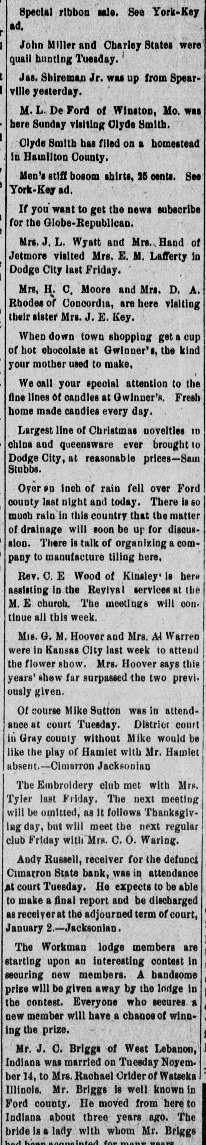 Special ribbon sale. See York-Key ad. John Miller and Charley States were quail hunting Tuesday. Jas. Shireman Jr. was up from Spearville yesterday. M. L. De Ford of Winston, Mo. was here Sunday visiting Clyde Smith. Clyde Smith has filed on a homestead in Hamilton County. Men's stiff bosom shirts, 25 cents. See York-Key ad. If you want to get the news subscribe for the Globe-Republican. Mrs. J. L. Wyatt and Mrs. Hand of Jetmore visited Mrs. E. M. Lafferty in Dodge City last Friday. Mrs, H. C. Moore and Mrs. D. A. Rhodes of Concordia, are here visiting their sister Mrs. J. E. Key. When down town shopping get a cup of hot chocolate at Gwinner's, the kind your mother used to make, We call your special attention to the fine lines of candies at Gwinner's. Fresh home made candies every day. Largest line of Christmas novelties in china and queensware ever brought to Dodge City, at reasonable prices-Sam Stubbs. Over an inch of rain fell over Ford county last night and today. There is so much rain in this country that the matter of drainage will soon be up for discussion. There is talk of organizing a company to manufacture tiling here. Rev. C. E Wood of Kinsley' is here assisting in the Revival services at the M. E church. The meetings will continue all this week. Mis. G. M. Hoover and Mrs. AI Warren were in Kansas City last week to attend the flower show. Mrs. Hoover says this years' show far surpassed the two previ. ously given. Of course Mike Sutton was in attendance at court Tuesday. District court in Gray county without Mike would be like the play of Hamlet with Mr. Hamlet absent.-Cimarron Jacksonian The Embroidery club met with Mrs. Tyler last Friday. The next meeting will be omitted, as it follows Thanksgiving day, but will meet the next regular club Friday with Mrs. C. O. Waring. Andy Russell, receiver for the defunct Cimarron State bank, was in attendance at court Tuesday. He expects to be able to make a final report and be discharged as receiver at the adjourned term of court, January 2.-Jacksonian. The Workman lodge members are starting upon an interesting contest in securing new members. A handsome prize will be given away by the lodge in the contest. Everyone who secures a new member will have a chance of winning the prize. Mr. J. C. Briggs of West Lebanon, Indiana was married on Tuesday Noyember 14, to Mrs. Rachael Crider of Watseka Illinois. Mr. Brigge is well known in Ford county. He moved from here to Indiana about three years ago. The bride is a lady with whom Mr. Briggs had bean acquainted for many wears