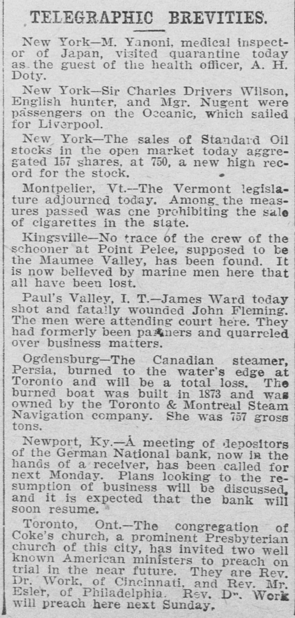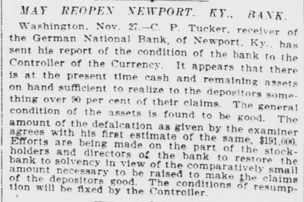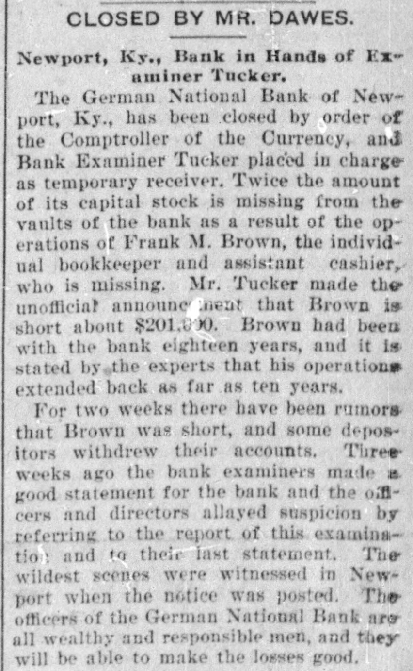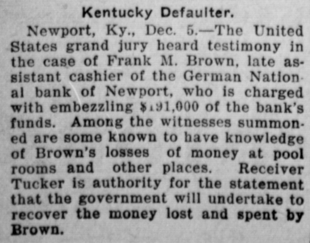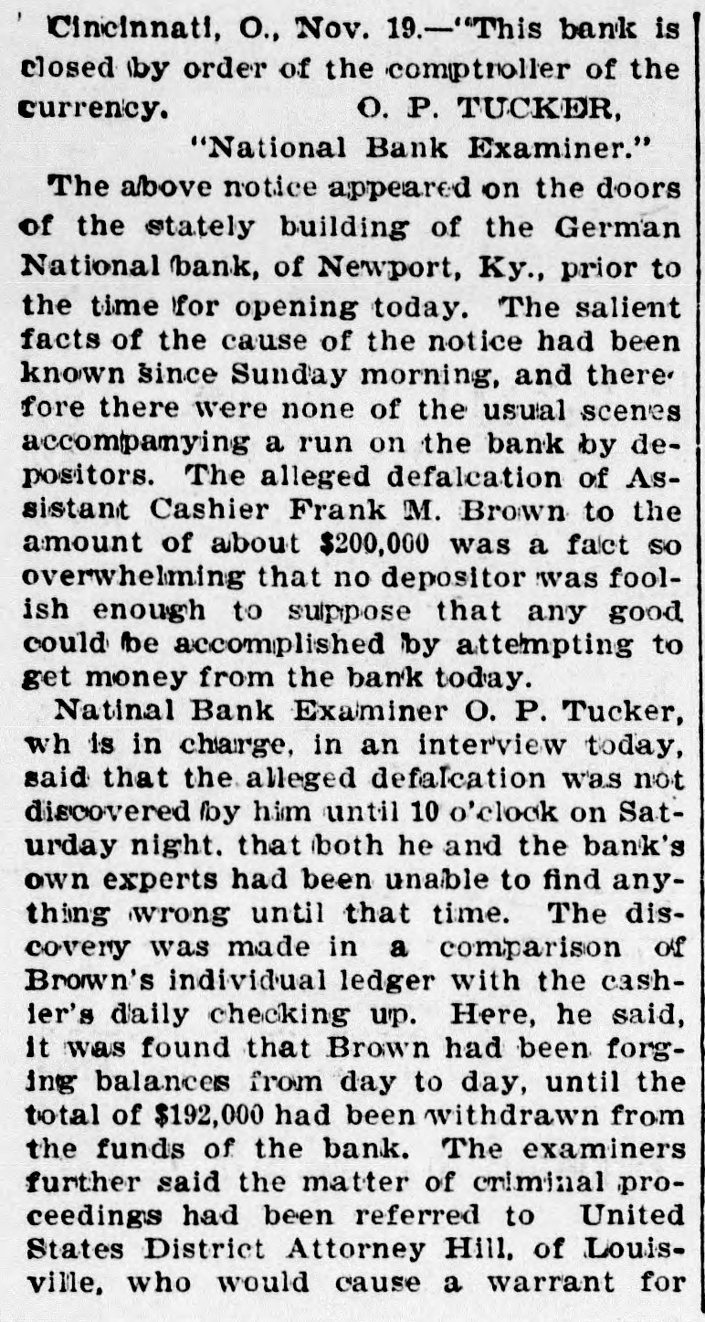 SHORT $201,000. German National Bank of Newport, Ky., Wrecked. Assistant Cashier Brown's Fast Living Said to Be Cause. MAKES HIS ESCAPE WITH PLENTY OF CASH. Cincinnati, Ohio, Nov. 18.-United States Bank Examiner Tucker, today, took possession of the German National Bank at Newport, Ky., and posted a notice that the bank would remain close pending an examination Examiner Tucker also announced unofficially that Frank M. Brown, the individual bookkeeper and assistant cashier, was missing and that a partial investigation showed that Brown was short about $201,000. Brown had been with the bank 18 years, was one of the most trusted men ever connected with this old bank and it is stated by the expects that his peculations extended back as far as 10 years. The capital stock of the bank is only $100,000. Prown's alleged shortage is double that amount and more than the reserve and all the assets, including the real esstate. The First National Bank of Newport, was wrecked two years ago by Cashier Youtsey and now the German National Bank closed. Newport has only one bank left. For two weeks there have been rumors that Brown was short, and some depositors withdrew their accounts. Three weeks ago, the bank examiners made a good statement for the bank and the officers and directors allayed suspicion by referring to the